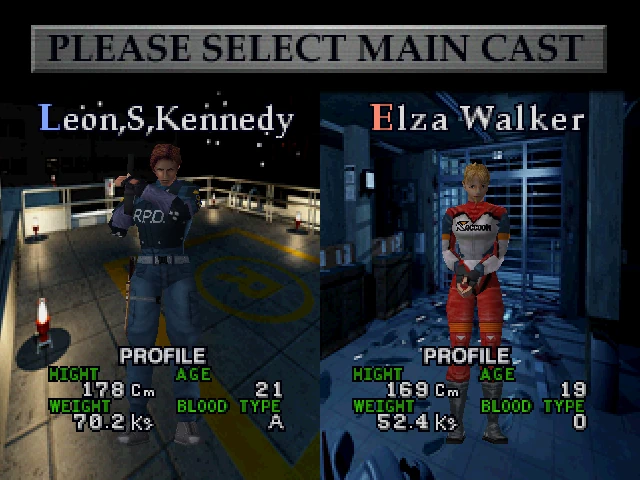 La société Umbrella était déjà fermée, à la suite de leurs expériences illégales. L'équipe de développement a cherché à maintenir le niveau de peur du jeu original et a donc introduit 2 nouveaux personnages qui n'ont pas connu de situation terrifiante : Leon S. Kennedy, en grande partie identique au personnage final, et Elza Walker, une grande fan de moto qui a été acceptée à l'université de Raccoon pour ses études. Contrairement à la version finale, les chemins de Leon et Elza ne se croisaient pas et les 2 personnages ont 2 partenaires, au lieu d'un seul. Leon est aidé par un collègue policier, Marvin Branagh, et un chercheur du nom de Linda (qui est en fait la préversion de Ada), alors qu'Elza est aidée par Sherry Birkin et un certain John, ultérieurement incorporé dans Resident Evil 2 en tant que propriétaire de la boutique d'armes à feu (et qui prendra le nom de Robert Kendo).