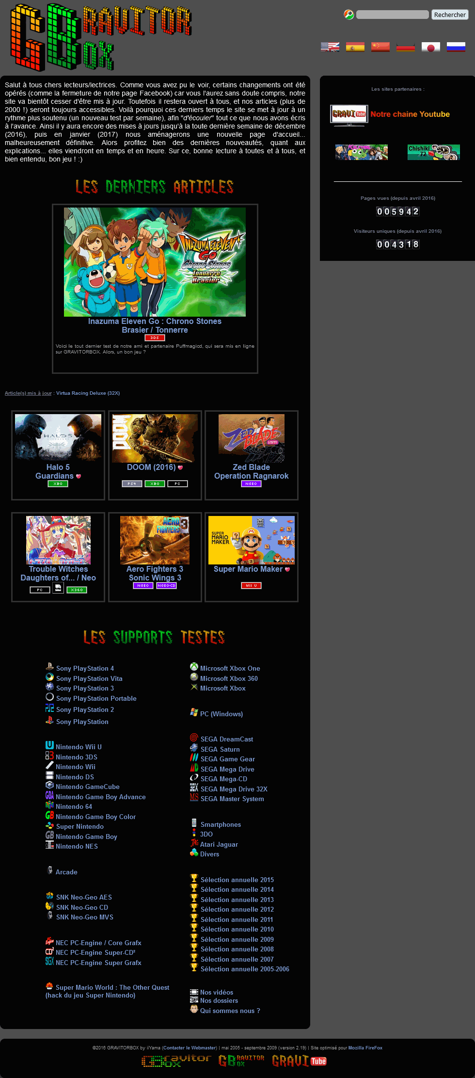 Depuis son lancement en 2009, GRAVITORBOX n'a jamais cessé d'être mise à jour, tant pour ses articles que son design. Il y a tout d'abord eu les tests unifiés (un jeu disponible sur plusieurs machines, est désormais présenté en un seul article, plutôt que de le sous-diviser en autant de supports), ensuite les tests ont disposé d'une conclusion encadrée, puis d'un résumé sous forme de +/- en fin d'article et enfin il y a eu les vidéo-tests. Demandant énormément de travail, les vidéo-tests ne furent disponibles que pour quelques jeux. On vous invite à visiter notre chaine GRAVItube où sont stockées ces vidéos, mais gardez bien à l'esprit qu'elles étaient réalisées "en amateur", faute de matériel plus approprié et de logiciel de montage de qualité. Déjà pas fameuses à l'époque, plus le temps passe et moins elles sont "regardables" (c'est pas facile d'avouer ses échecs :). Le ayant connu un essor assez remarquable, iiYama s'est entouré de plusieurs testeurs occasionnels qui ont postés leur article sur GRAVITORBOX. GRAVITORBOX est donc l'oeuvre d'iiYama (puisqu'il a rédigé plus de 9 articles sur 10 et que c'est lui qui le gère quotidiennement) mais de plus en plus d'intervenants extérieurs permettaient d'élargir les opinions, de traiter un panel de jeux plus ouverts, bref d'être chaque jour plus exhaustif.