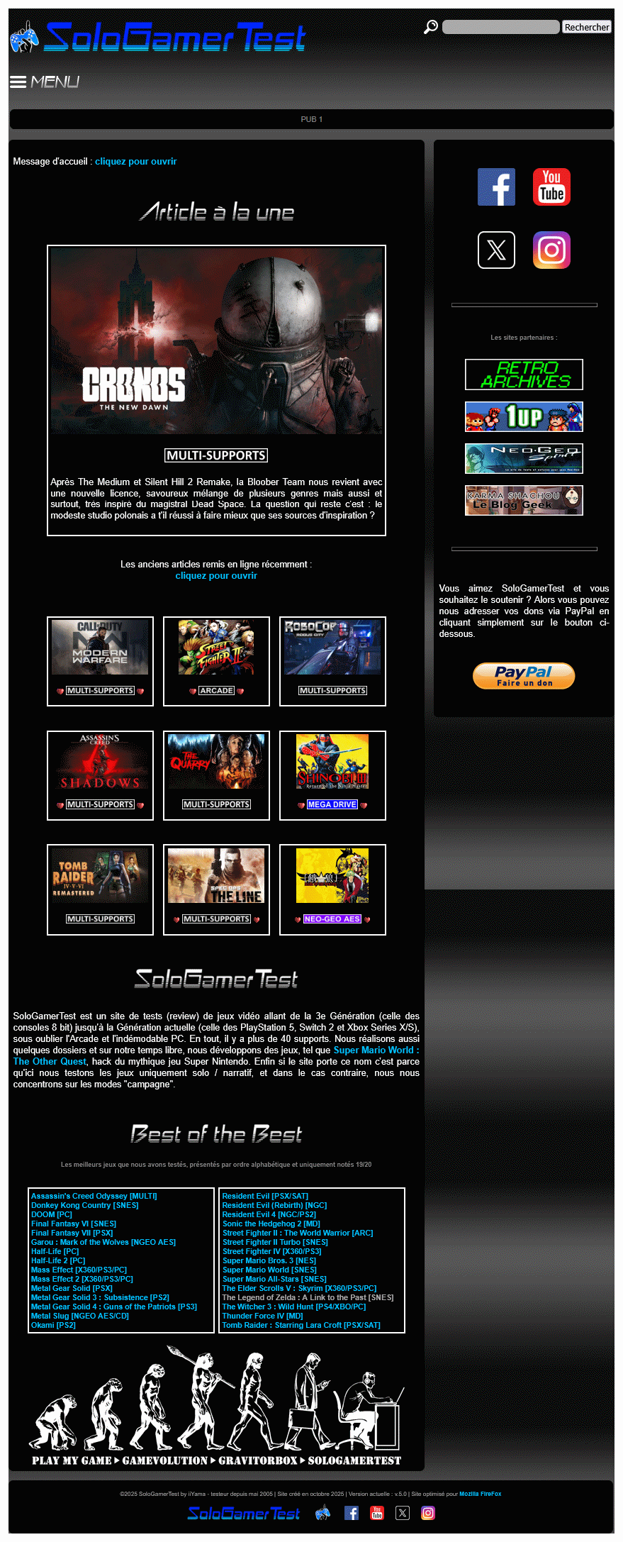 octobre 2025 : version 5.0, ouverture de SoloGamerTest. Sur les bases de la version 4.2, on a développé un nouveau design, créer de nouvelles icones, remanié le Template pour un affichage plus grand, avec notamment des images plus nettes. GRAVITORBOX va peu à peu laisser sa place et se vider de son contenu, avec des articles qui seront un à un updaté au passage.