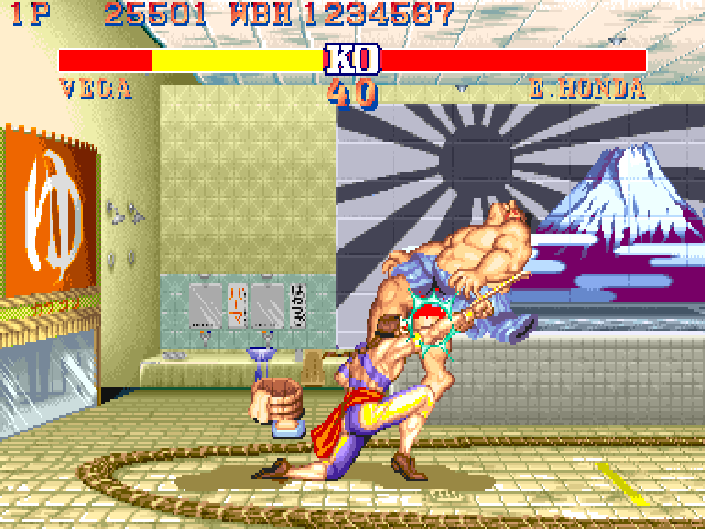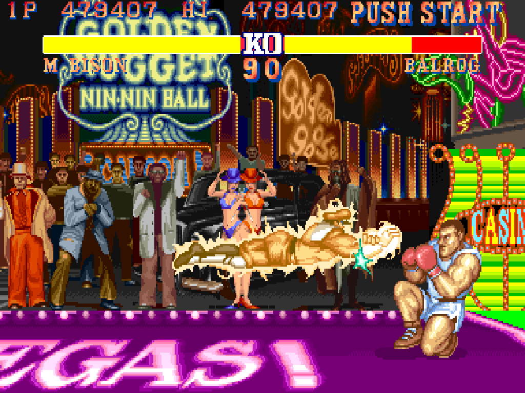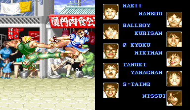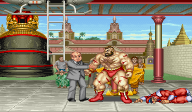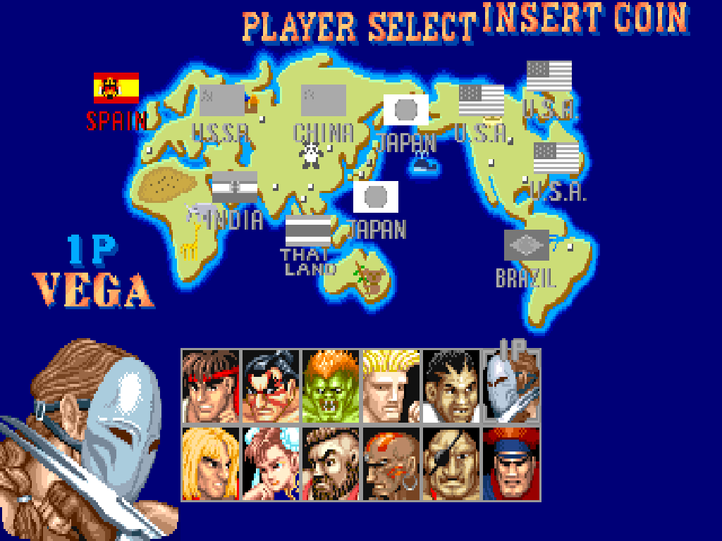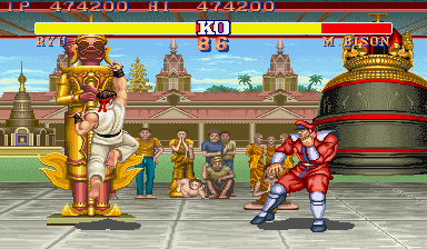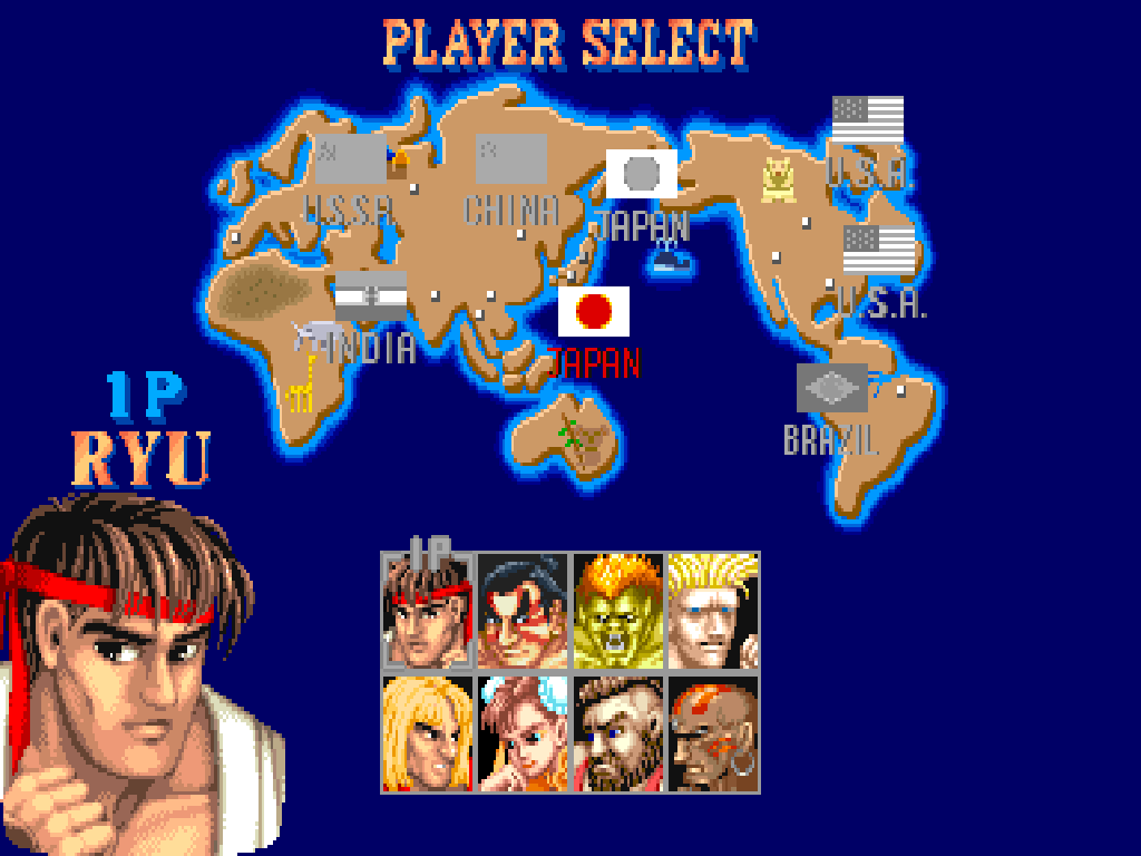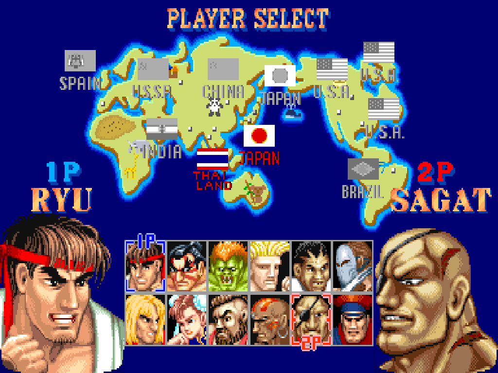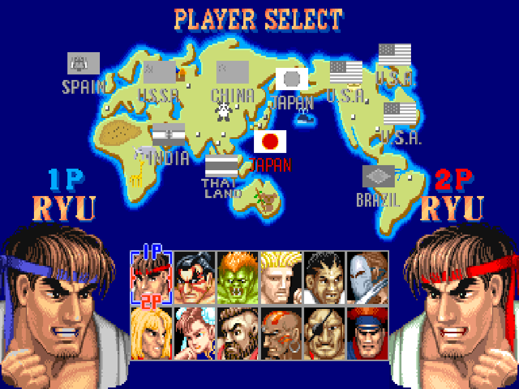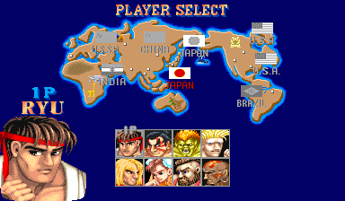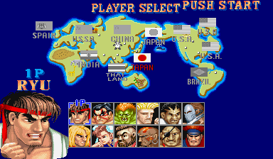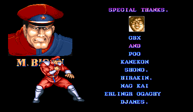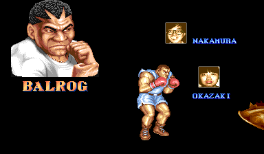 Dans cette suite directe, on découvre 12 combattants, mais seulement 8 personnages sont jouables, les 4 restants faisant office de boss. En tant que séquelle, on retrouve Ryu, Ken et Sagat, les autres étant tous nouveaux (ils seront repris plus tard dans des éditions ultérieures, notamment la trilogie des Alpha). Pour le reste il y a donc Honda, Blanka, Chun-Li, Dhalsim, Zangief et Guile, et les boss se nomment Balrog, Vega et M. Bison. Notez d'ailleurs qu'au Japon, Bison s'appelle Vega, Vega devient Balrog et Balrog devient M. Bison. C'est dingue comme à l'époque les développeurs ne pouvaient pas s'empêcher des créer des différences entre les jeux sortis au Japon, et ceux qui ont vu le jour en occident. Ceci dit, selon la légende, il parait que cette rotation des patronymes serait due au personnage de Balrog justement, inspiré par le boxeur Mike Tyson et Capcom a préféré contourner tout potentiel problème juridique.