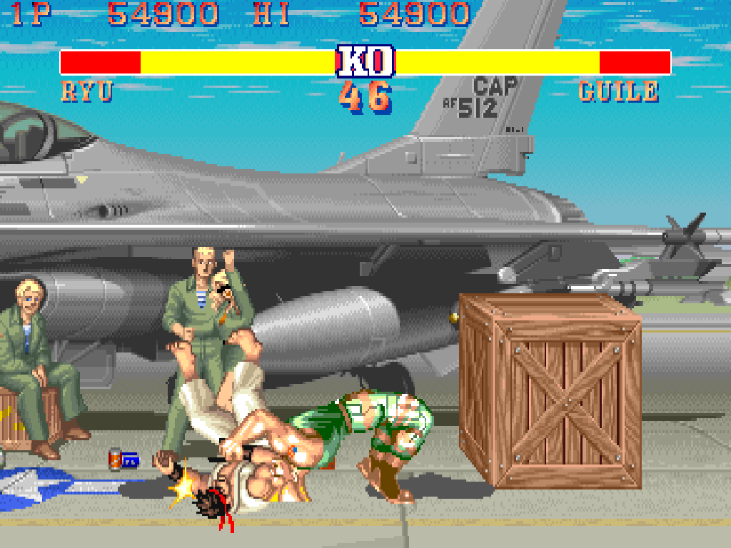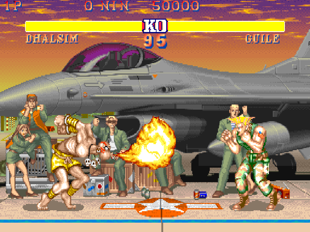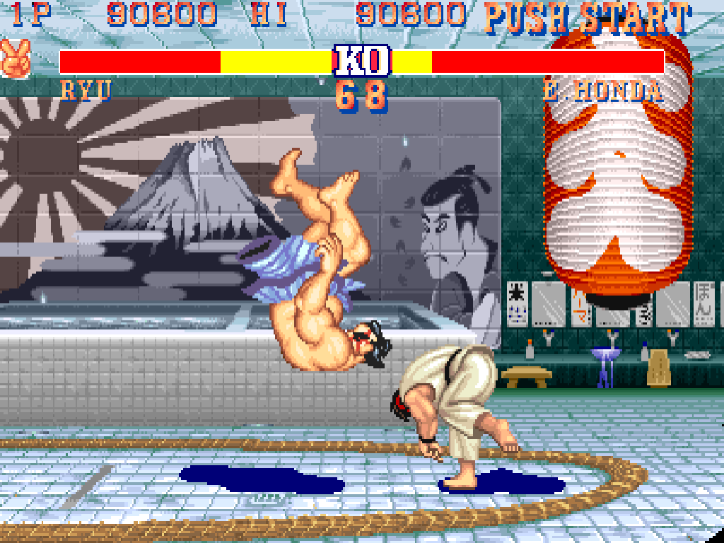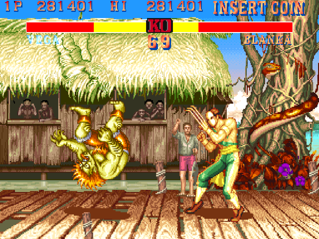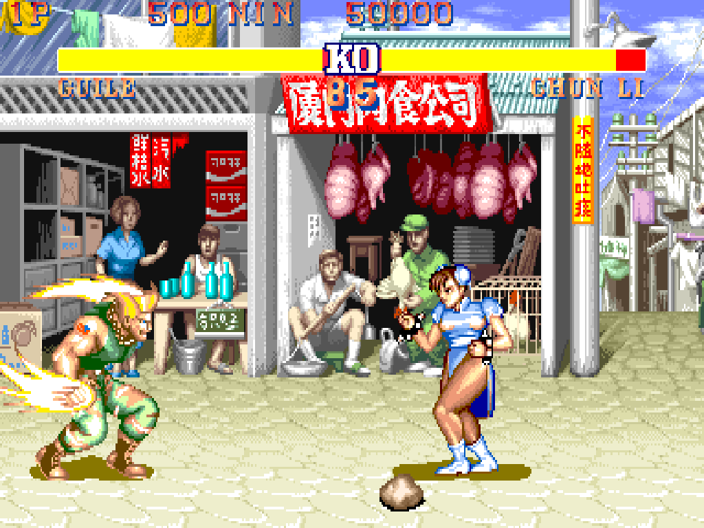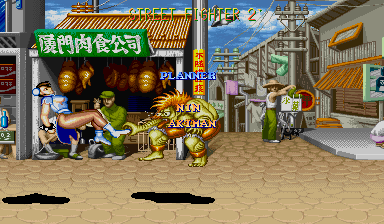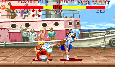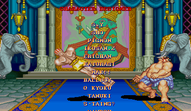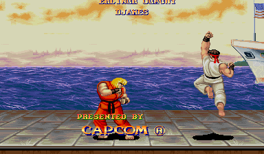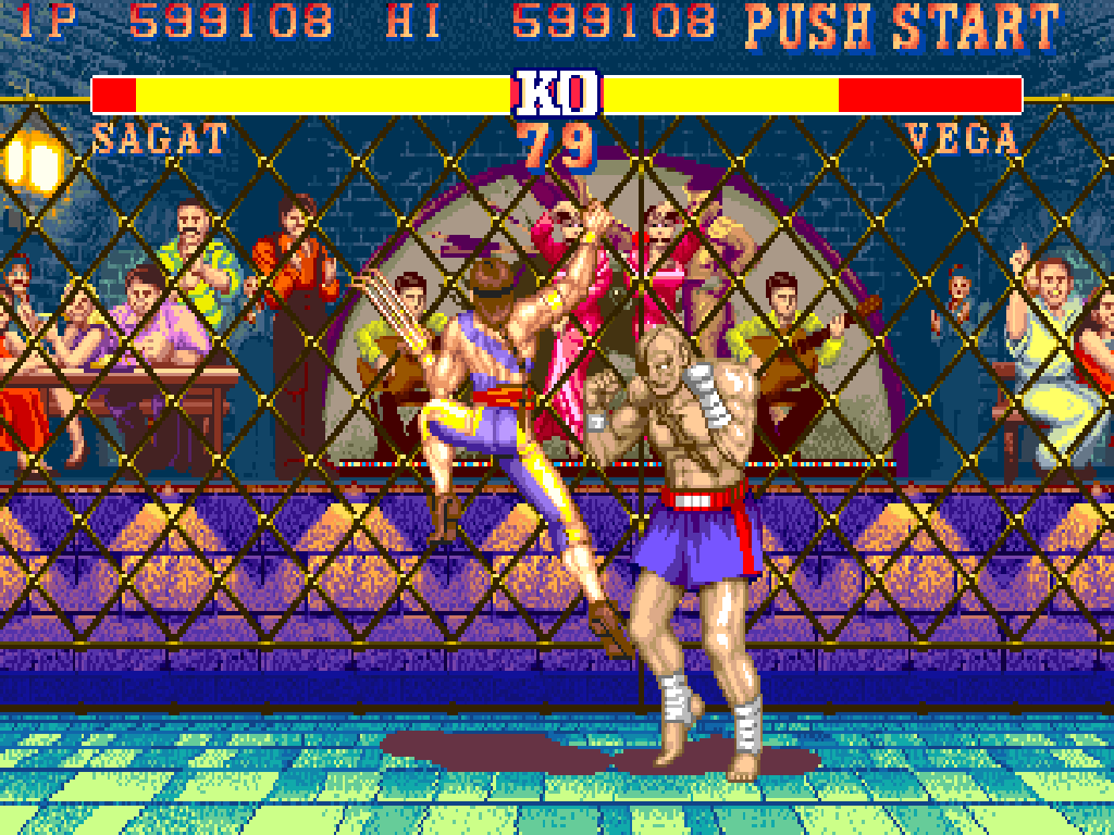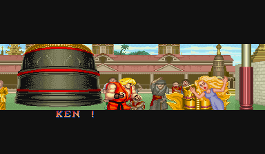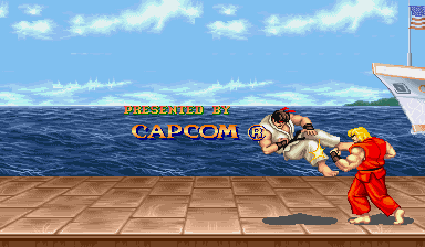 Techniquement, le CPS-1 nous donne tout ce qu'il a ! Certes il n'y a véritablement que 2 personnages à l'écran (contrairement à un Final Fight qui doit parfois gérer une myriade d'ennemis) mais en attendant, il faut bien penser que nous sommes en 1991 et que les versus fighting sont largement minoritaires. Dès le départ Capcom frappe fort, puisque chaque personnage à son propre décor, un peu comme si l'environnement graphique faisait parti intégrante de son histoire. Il y a donc 12 décors, qui sont aussi beaux que variés. Immédiatement reconnaissable, le design est fantastique, on retrouve quelques animations en fond (pas du tout fluide car limité à 2 frames, bien que ça donne de la vie au "background"), le tout accompagné par une jolie prouesse technique : les lignes du sol tournent selon les déplacements. Ces parallaxes en rotation sont un bien bel effet Mode7 pour un Hardware qui n'en possède pas.