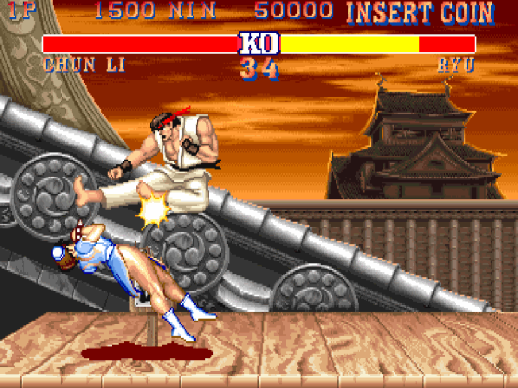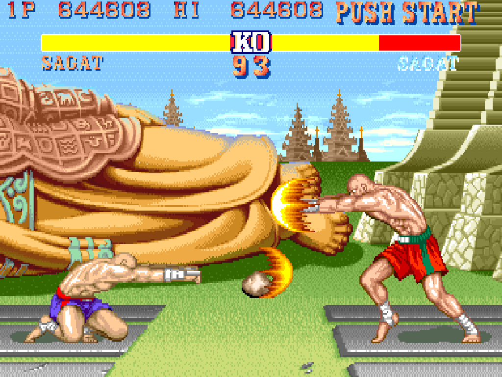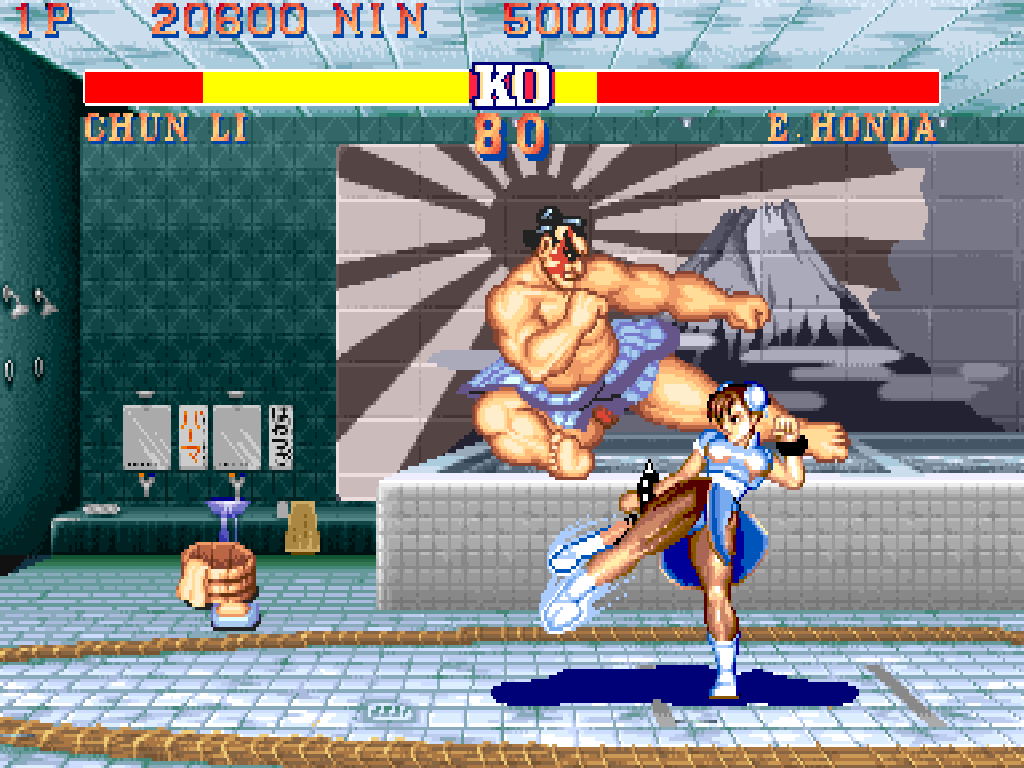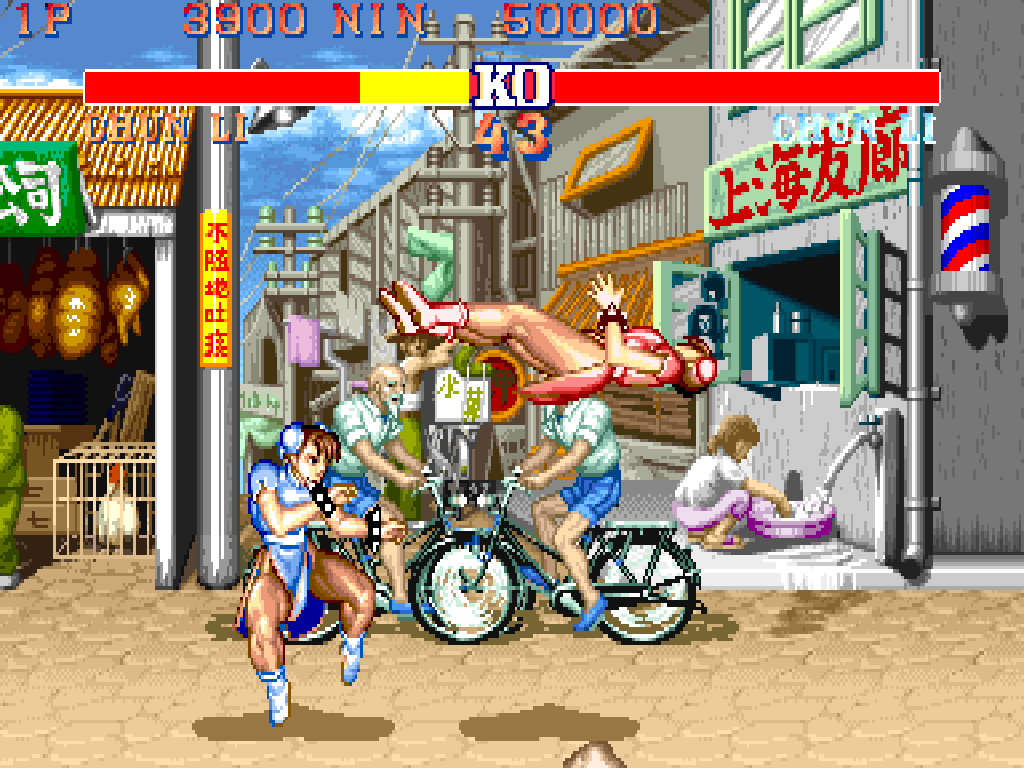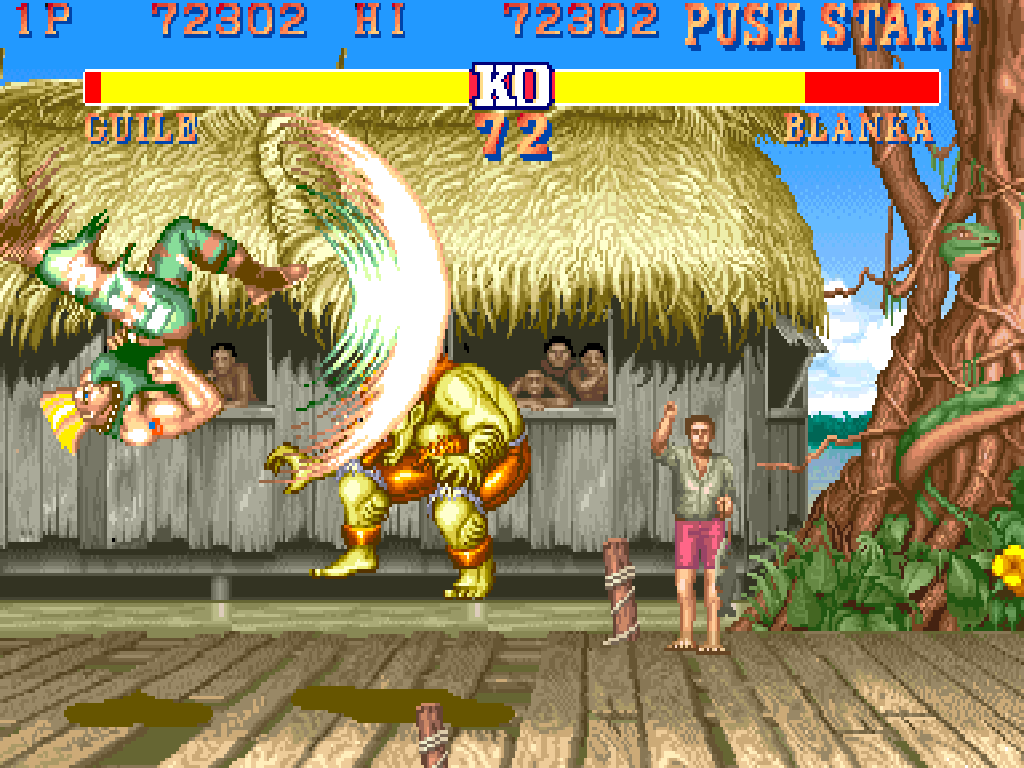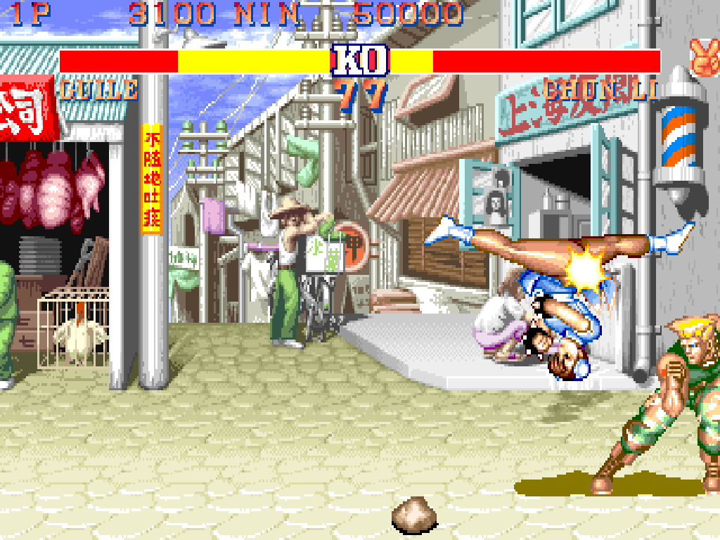 Techniquement, le CPS-1 nous donne tout ce qu'il a ! Certes il n'y a véritablement que 2 personnages à l'écran (contrairement à un Final Fight qui doit parfois gérer une myriade d'ennemis) mais en attendant, il faut bien penser que nous sommes en 1991 et que les versus fighting sont largement minoritaires. Dès le départ Capcom frappe fort, puisque chaque personnage à son propre décor, un peu comme si l'environnement graphique faisait parti intégrante de son histoire. Il y a donc 12 décors, qui sont aussi beaux que variés. Immédiatement reconnaissable, le design est fantastique, on retrouve quelques animations en fond (pas du tout fluide car limité à 2 frames, bien que ça donne de la vie au "background"), le tout accompagné par une jolie prouesse technique : les lignes du sol tournent selon les déplacements. Ces parallaxes en rotation sont un bien bel effet Mode7 pour un Hardware qui n'en possède pas.