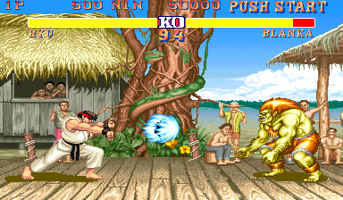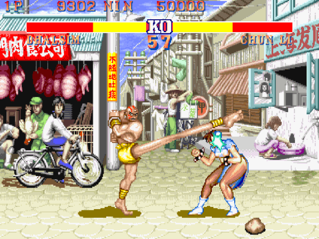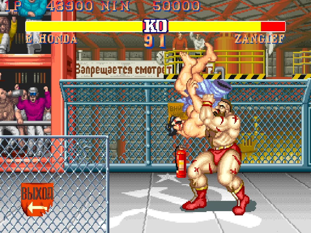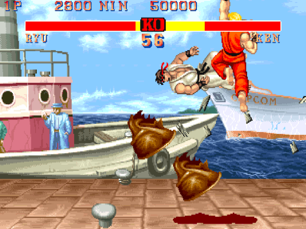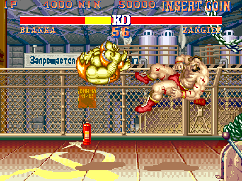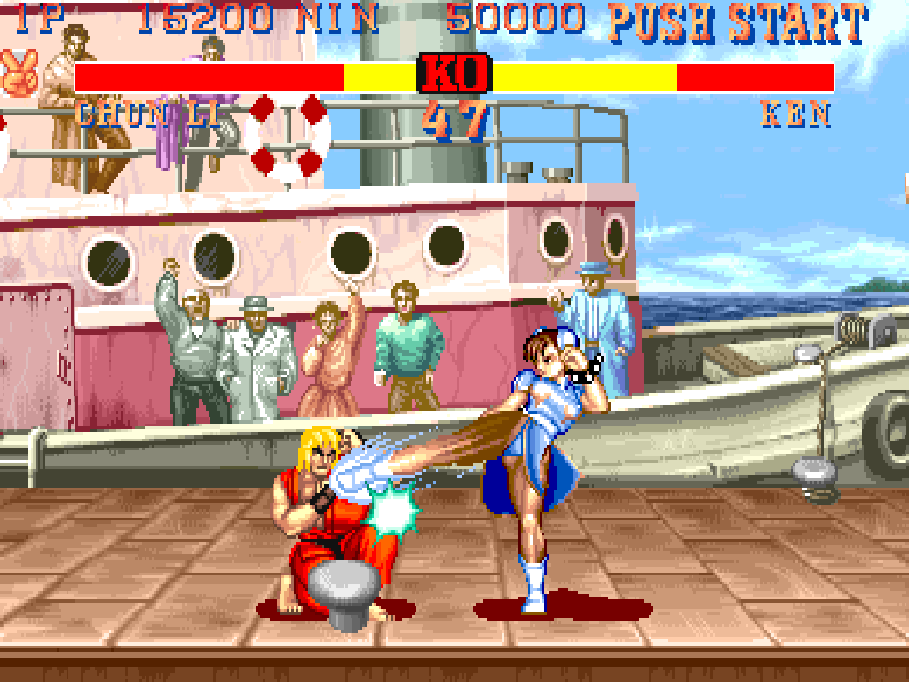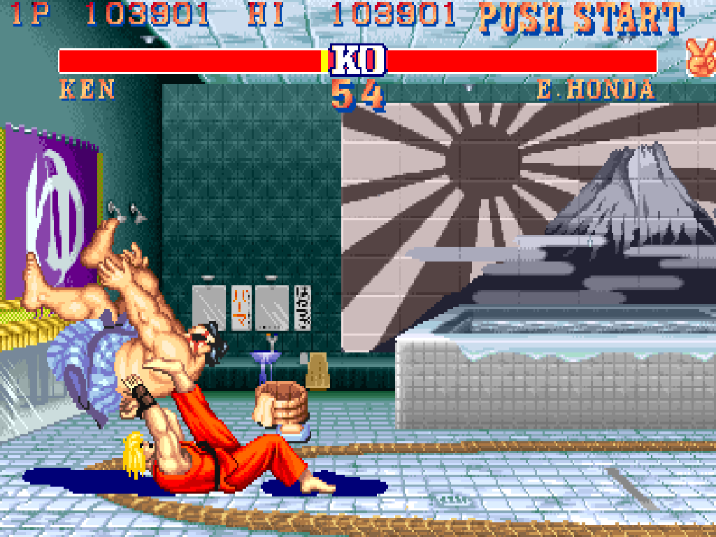 Techniquement, le CPS-1 nous donne tout ce qu'il a ! Certes il n'y a véritablement que 2 personnages à l'écran (contrairement à un Final Fight qui doit parfois gérer une myriade d'ennemis) mais en attendant, il faut bien penser que nous sommes en 1991 et que les versus fighting sont largement minoritaires. Dès le départ Capcom frappe fort, puisque chaque personnage à son propre décor, un peu comme si l'environnement graphique faisait parti intégrante de son histoire. Il y a donc 12 décors, qui sont aussi beaux que variés. Immédiatement reconnaissable, le design est fantastique, on retrouve quelques animations en fond (pas du tout fluide car limité à 2 frames, bien que ça donne de la vie au "background"), le tout accompagné par une jolie prouesse technique : les lignes du sol tournent selon les déplacements. Ces parallaxes en rotation sont un bien bel effet Mode7 pour un Hardware qui n'en possède pas.