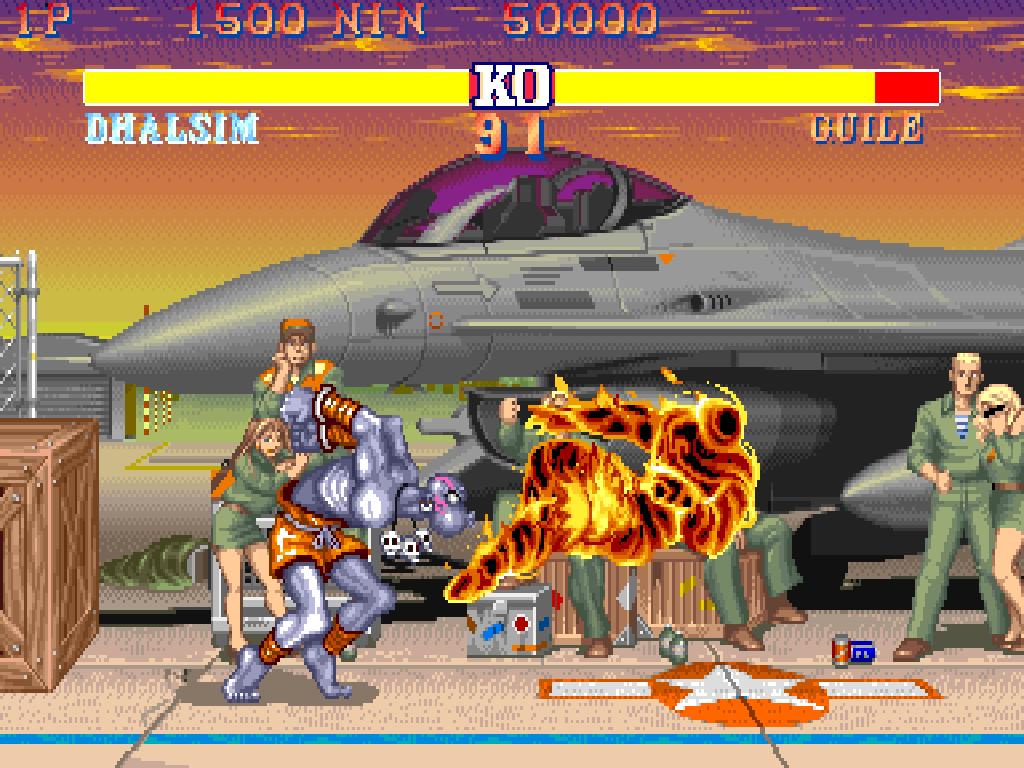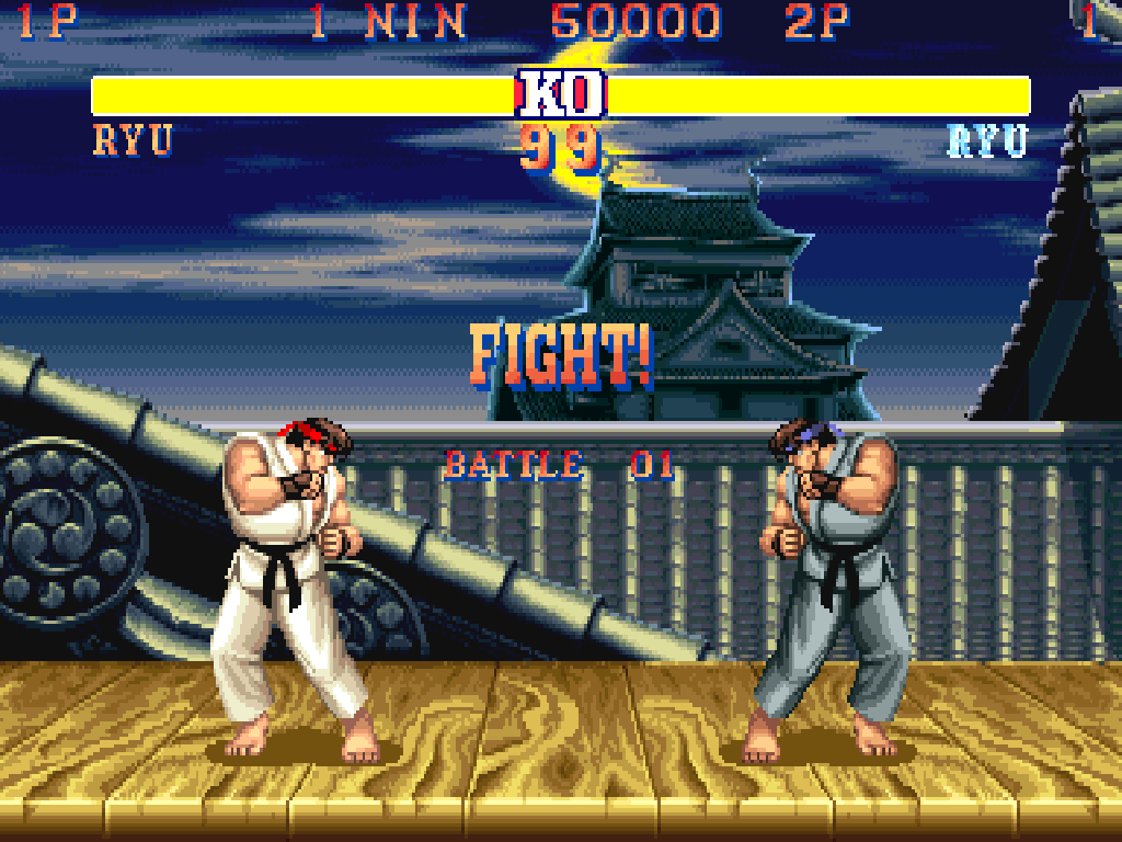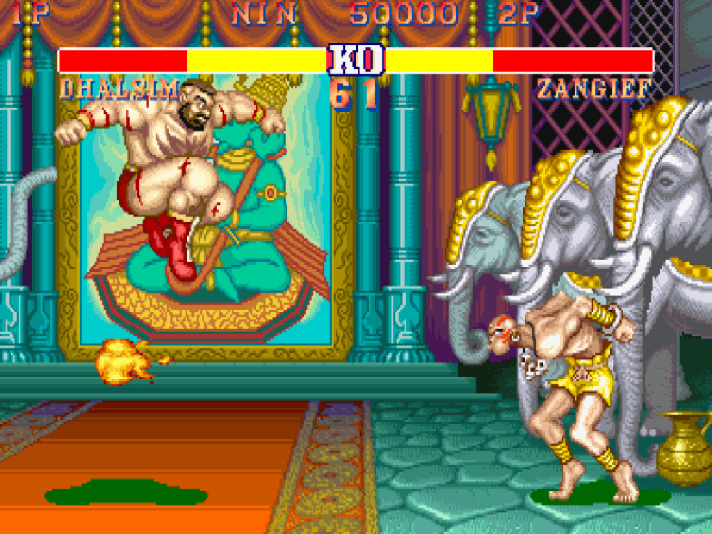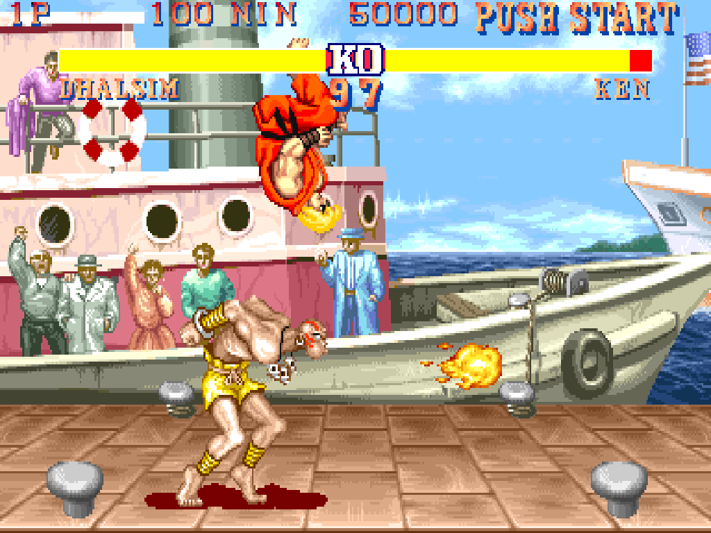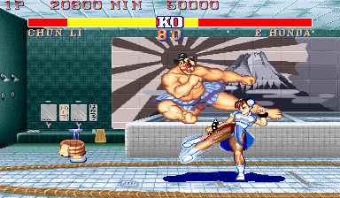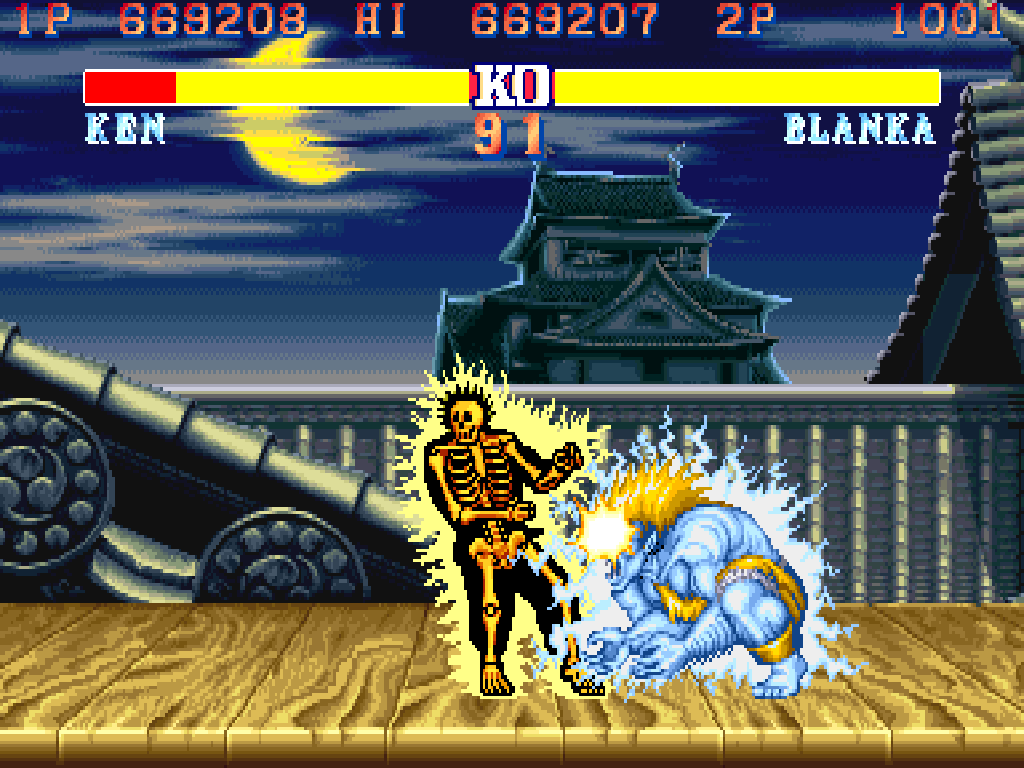 Street Fighter II c'est 12 personnages dont 8 jouables et pour arriver à la fin, il faudra mettre KO les 11 autres "des lois" propres au jeu, tel que le fait qu'un personnage en l'air pourra toujours subir une projection lorsqu'il remet les pieds au sol. Ça fait parti des règles que Street Fighter II a imposé, et dont les autres développeurs s'inspireront directement ou feront tout pour s'en affranchir... avec plus ou moins de succès (car vous vous doutez bien que plus on s'éloigne d'une formule qui marche, et plus on prend le risque de faire n'importe quoi). D'ailleurs la concurrence mettra longtemps avant d'égaler le fun et la précision de cette prise en mains, je vais même vous dire mieux, c'est cette jouabilité hyper précise et ce gameplay ultra riche qui donneront ses lettres de noblesse au genre et à Capcom.