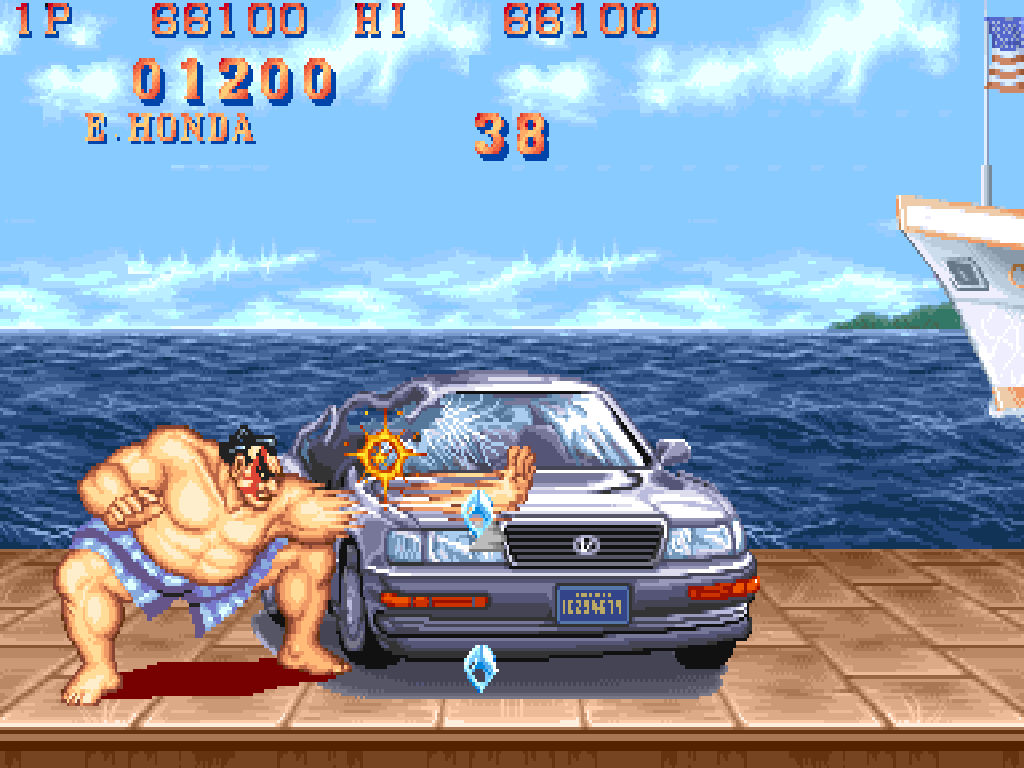 Je ne vais pas vous faire l'affront de vous détailler ce qu'est (au fond) Street Fighter II, je pense qu'à l'image de tous les jeux ultra cultes sortis depuis les années '80, vous y avez joué au moins une fois dans votre vie. On va donc aller à l'essentiel, à savoir que pour arriver jusqu'à l'épilogue, il vous faudra affronter les 11 autres participants. Et oui, on n'affronte pas son double, d'ailleurs il était impossible de prendre 2 fois le même personnage, ce qui peut être un poil frustrant en versus, mais qui est nettement plus cohérent lorsqu'on joue en solo. D'ailleurs, je trouve toujours ça absurde d'affronter son double, surtout lorsque le roster de personnages est confortable comme dans un King of Fighters par exemple. Dès cette première édition, on retrouve les fameux bonus stages : les tonneaux qui tombent et la voiture à concasser, qui est directement reprise de Final Fight. Au sein des niveaux, il y a également des éléments destructibles, qui n'ont aucune utilité si ce n'est démontrer un peu plus la violence des coups portés.