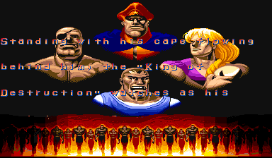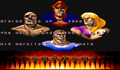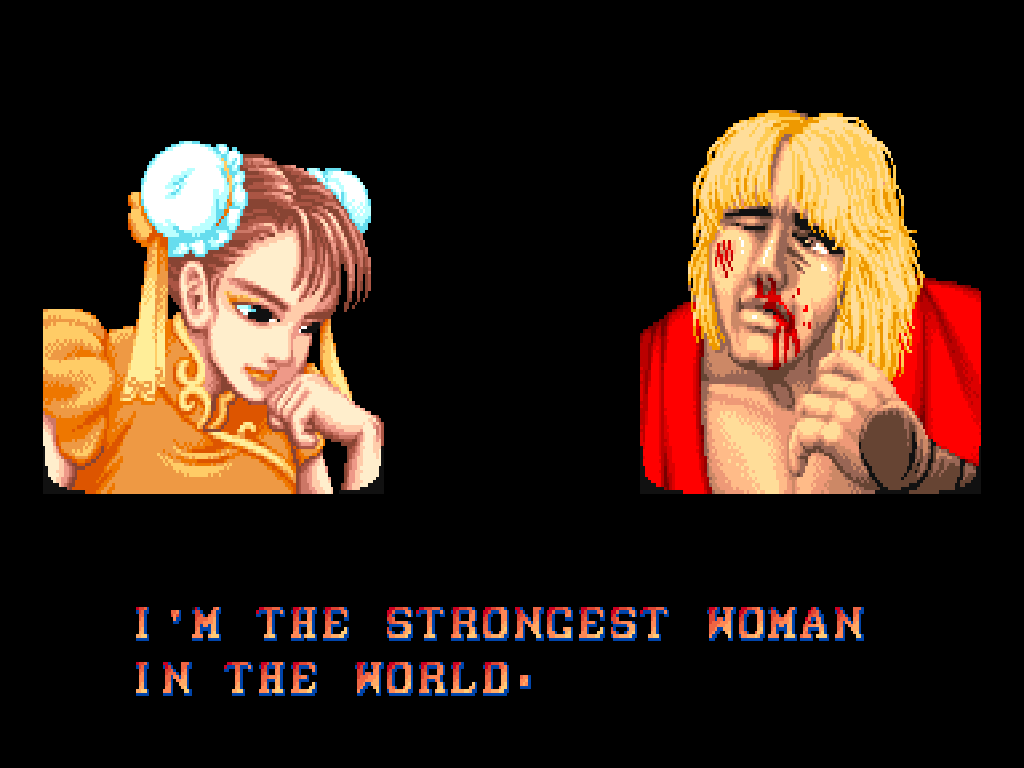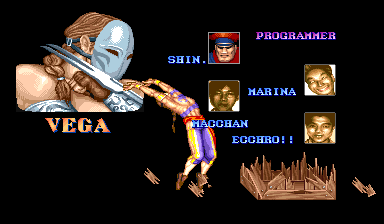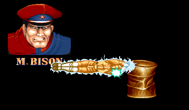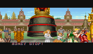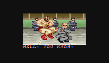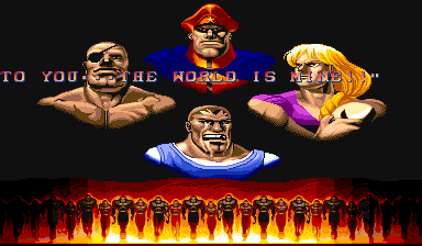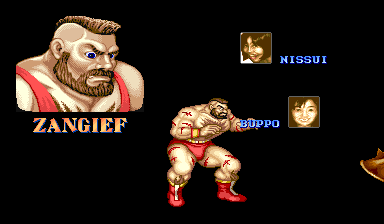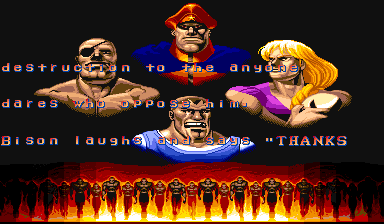 Tous ces personnages ont une histoire individuelle, d'ailleurs chacun d'entre eux a son propre épilogue. Il est juste dommage que l'intro n'en détaille rien, mais ça peut aussi se comprendre car faire une part d'intro pour les 8 persos jouables, serait vite devenu difficile à gérer. On remarquera tout de même les petits interludes où le vainqueur vient narguer le vaincu, parfois en dévoilant une info scénaristique intéressante. Ça aussi, c'est une méthode trouvée par Capcom qui sera reprise dans la plupart des jeux du genre (SNK en profitera même pour y développer ses scénarios via des cinématiques).