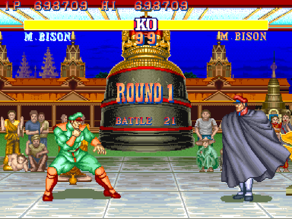 Sorti pile 1 an plus tard, Street Fighter II' propose de jouer avec les 4 boss d'épiloguer sur le sujet, jouer les boss est jouissif, tant ces derniers sont surpuissants. A part peut-être Balrog, qui est un peu particulier à prendre en mains, les autres sont vraiment excellents avec Vega qui est hyper rapide et imprévisible, ou encore Sagat et Bison, qui font très mal à chaque coup porté. Au passage Capcom en a profité pour rendre son jeu légèrement plus rapide, ils ont affiné certaines animations, rajouter quelques détails dans les décors, modifier quelques coloris, apporter de nouvelles voix digitales (comme Blanka qui fait désormais un cri de bête), ou encore la possibilité de prendre le même personnage et ce, via un système de couleurs modifiables.
