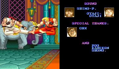 De son côté, Isao Abe (aussi connu sous le pseudo Oyaji) est un compositeur japonais (on ne connait pas sa date de naissance mais à vue de nez, il doit avoir à peu près le même âge que Yoko Shimomura, en étant né dans les années '60). Il entre en 1990 chez Capcom et se fait rapidement remarqué sur Knights of the Round. Sa contribution à Street Fighter II est moins importante que celle de sa confrère, mais il participera de plus en plus à ses diverses suites ainsi qu'aux autres jeux de la marque. Dans tout les cas vous savez comment ça fonctionne sur Arcade : il faut que ça fasse du bruit, que ça gueule, que ça explose et que ça claque, sans trop se soucier de la qualité. Et il est vrai que sur Arcade, la qualité du son importe peu car on a rarement l'occasion de réellement y prêter l'oreille. Moi-même, malgré mes centaines de parties sur Arcade, ce n'est réellement qu'à son arrivé sur Super Nintendo, que j'ai pu apprécier la maestria de ces musiques d'anthologie ! Rythmées, mélodieuses, même si ça crachouille un peu (Arcade oblige), c'est un vrai régal acoustique. D'ailleurs les voix sont de grande qualité pour le support et les bruitages ne manquent pas de puissance.
