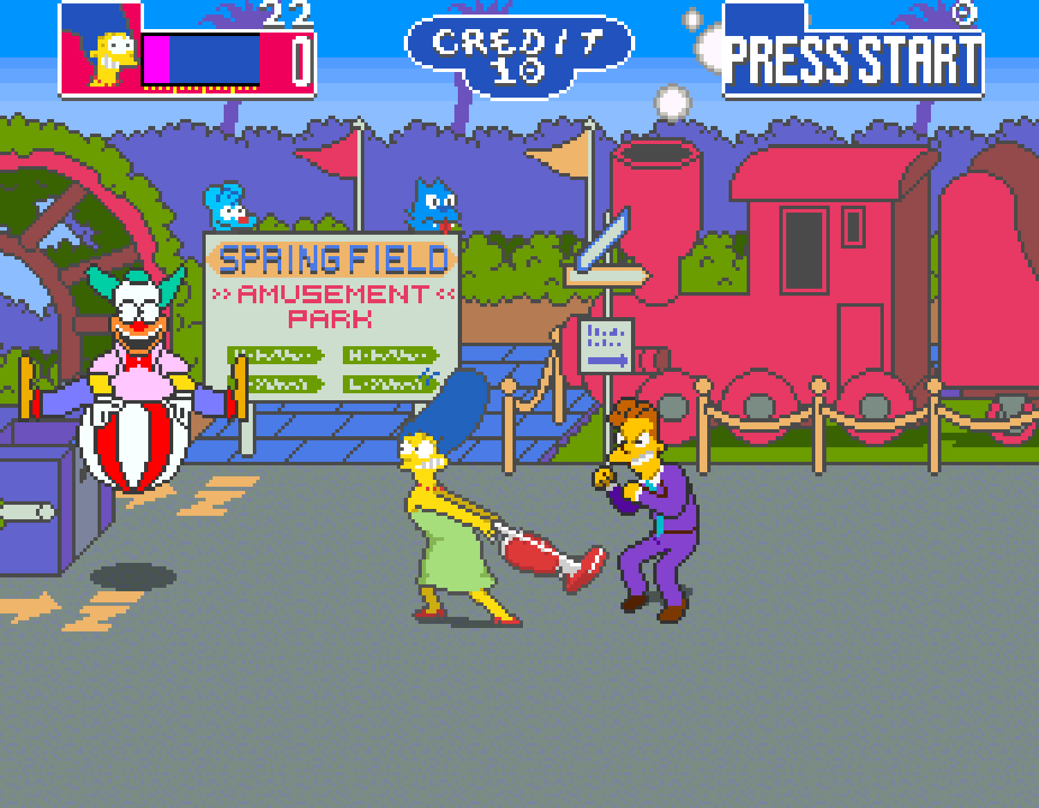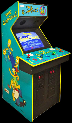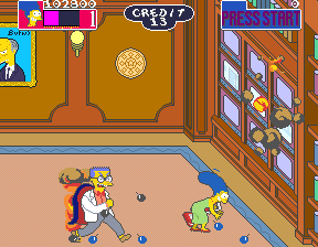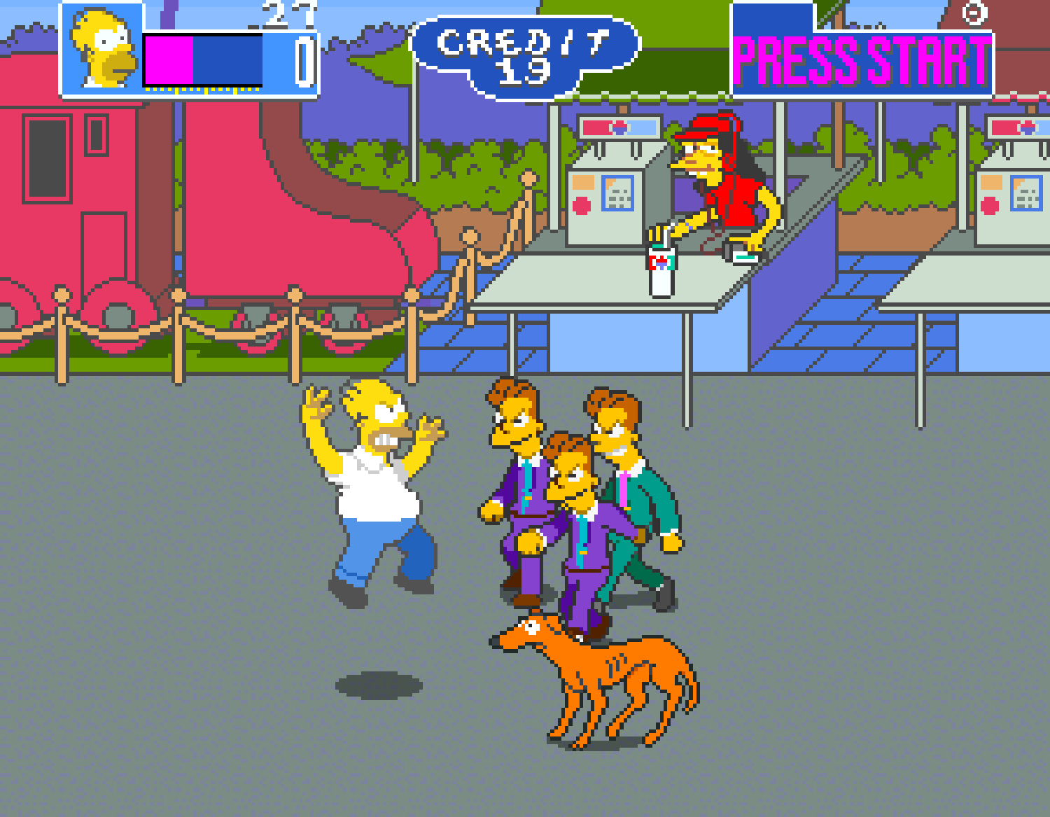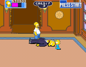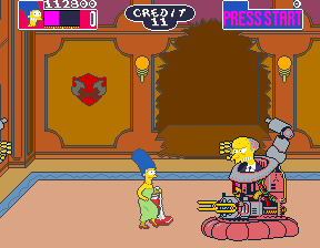 Le succès allait grandissant, alors un matin ils ont récupérés les droits d'exploitation de la licence Simpson (qui avait alors moins de 2 ans) pour en faire... un autre beat-them-all ! Avant de se lancer, sachez qu'il existe grosso-modo 2 types de bornes, celle où on peut jouer à 2 (comme nous l'avons fait) et celle où on peut jouer à 4 simultanément ! Si ça vous rappelle des jeux comme Turtles in Time ou X-Men, vous avez tout bon. Bon on jette nos pièces dans le monnayeur (naaaan je déconne, je vais pas payer pour jouer à ma propre borne) et on se lance.