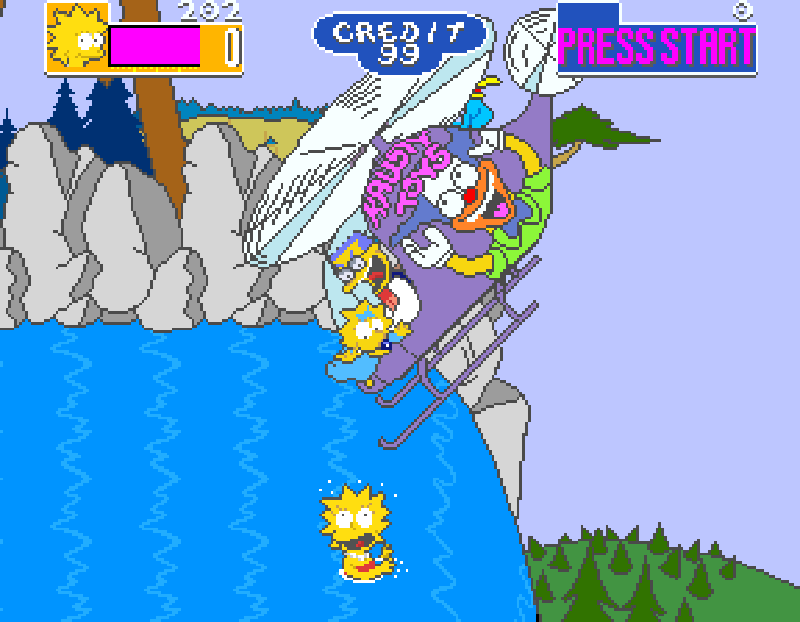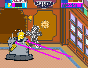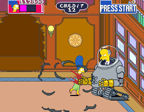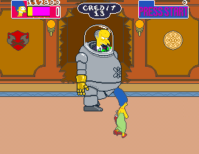 Le dernier niveau n'en est d'ailleurs pas vraiment un, puisqu'on affrontera un premier boss (Smithers) avant d'enchainer direct sur le second, un M. Burns pas très fairplay puisqu'il est enchâssé dans une sorte de robot, qui prendra 3 formes successives. Ce dernier est d'ailleurs une belle purge à la difficulté abrutissante : on perd 1 vie toute les minutes environ, alors que lui va encaisser un nombre incalculable de coups, tout en se permettant les pires bassesses. Jeu d'Arcade oblige, The Simpsons est donc relativement court et surtout, très difficile ! A nous 2, on a bien du cramer au moins 60 crédits... content que ce soit pas dans un café avec nos pièces de 1€.