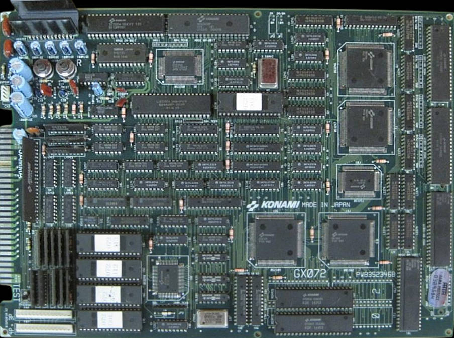 Le design est très respectueux du dessin animé mais difficile de trouver le jeu "beau" nous sommes sur un classique PCB dont les composants sont difficiles à identifier. D'ailleurs les infos sont introuvables sur Internet, mais par expérience, on peut faire quelques déductions. La ROM pèse 60 Mb, ce qui est pas mal et n'écoutez les huluberlus qui disent que nous sommes sur un système 8-bits, c'est tout bonnement impossible ! Certes le CPU est caché sous une dénomination propriétaire à Konami, mais une chose est sûre, c'est du 16-bits car nous avons beaucoup de sprites à l'écran, quelques effets de zoom assez réussis et fluides, le tout sans réel problème de framerate. Est-ce que c'est du Motorola 68.000 rebadgé et floqué Konami pour brouiller les pistes ? Ma foi, c'est tout à fait possible. Dans tous les cas le résultat à l'écran est très correct, avec un design hyper respectueux de l'univers des Simpson, tant dans le choix des couleurs, que le coup de crayon global (sans compter les divers petits caméos).