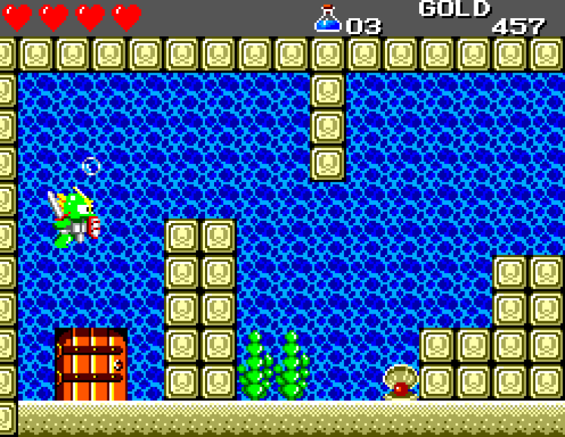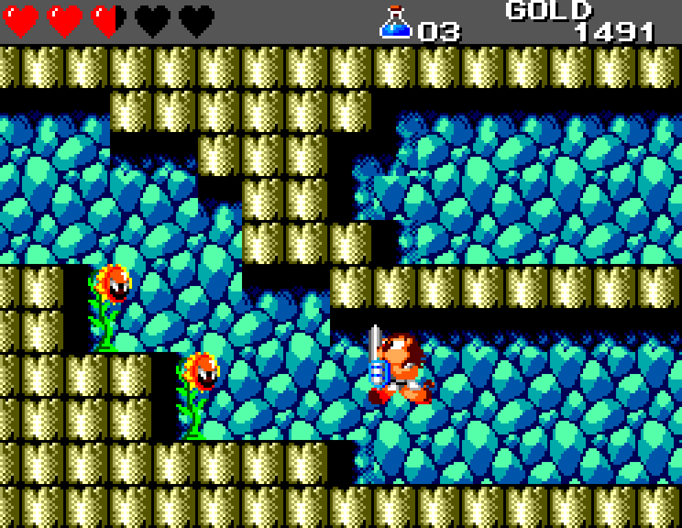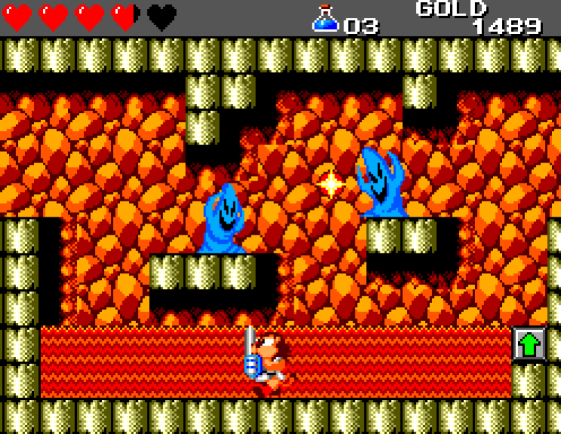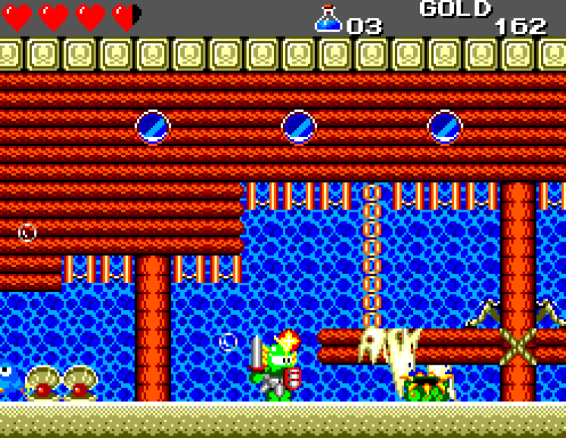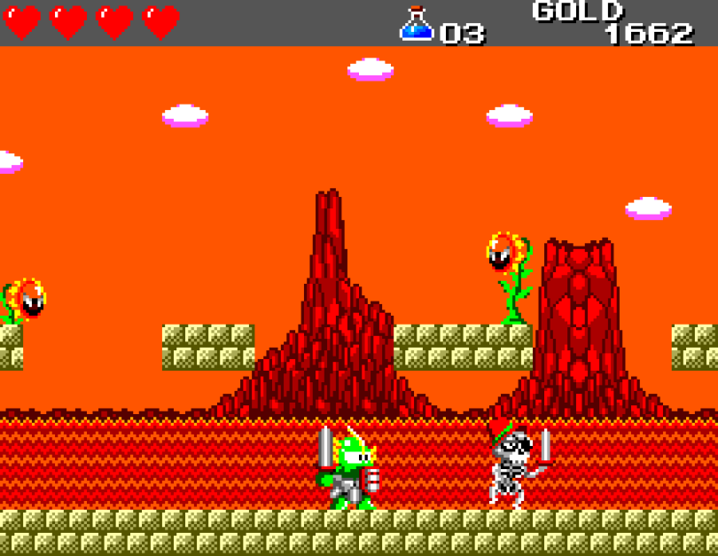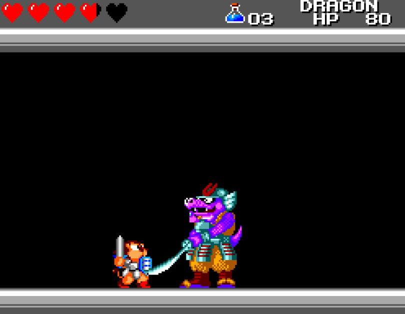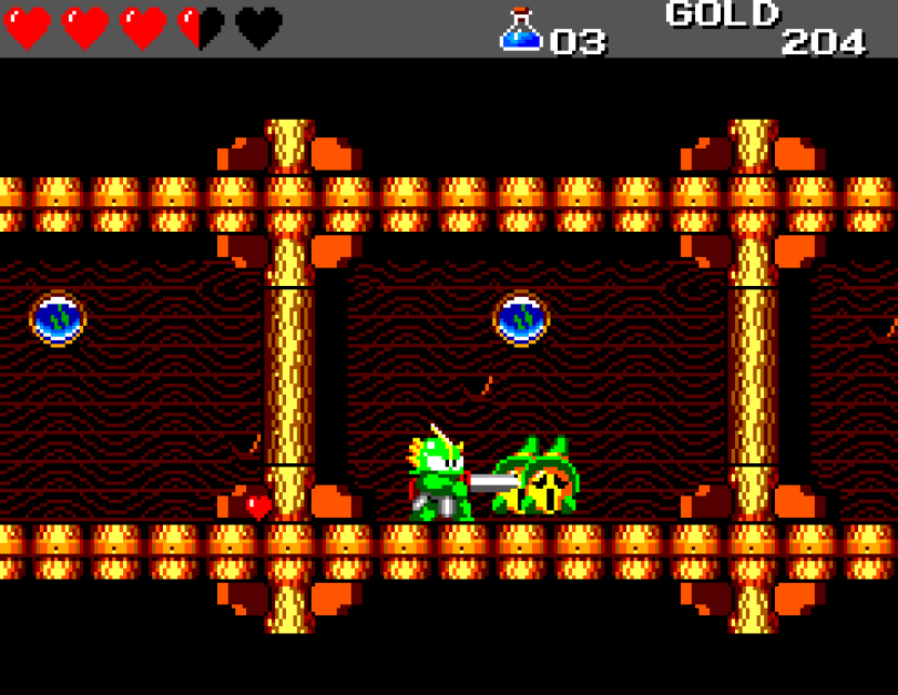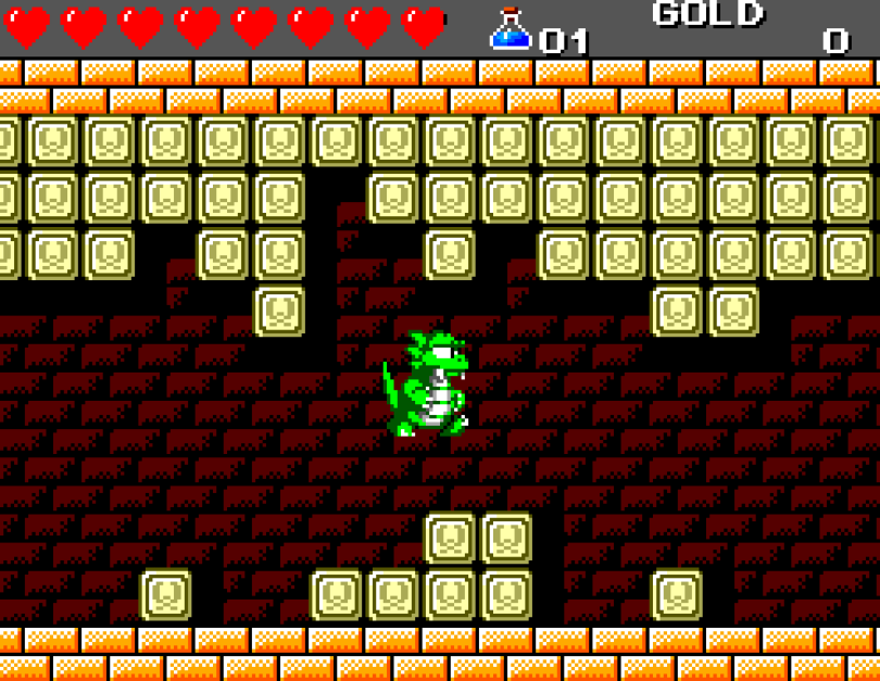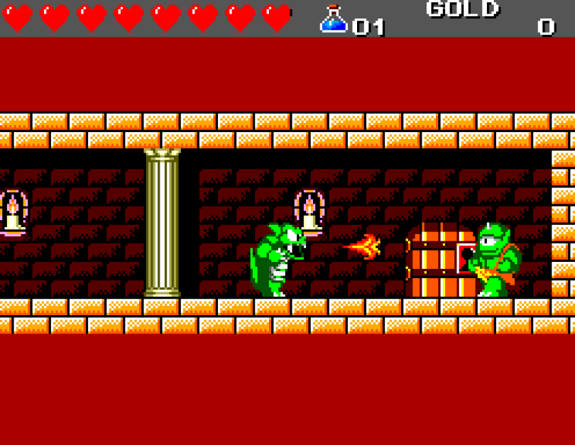 Si on commence le jeu tranquille avec le plein de cœurs et un équipement de folie, dès qu'on sera transformé en dragon/lézard on déchantera vite (et oui, faut bien faire un jeu) puisqu'on commencera tout en bas de l'échelle, donc autant dire avec rien. Il faudra alors parcourir ce monde d'heroïc-fantasy pour trouver des cœurs (afin d'augmenter sa barre de vie), tuer des monstres histoire de récolter le plus possible d'argent (intitulé "gold" dans le jeu) et ainsi faire évoluer son équipement, trouver des passages secrets généralement riches en bonnes surprises (argent, élixir, items) et défaire un à un les boss du jeu, afin d'être à chaque fois transformé.