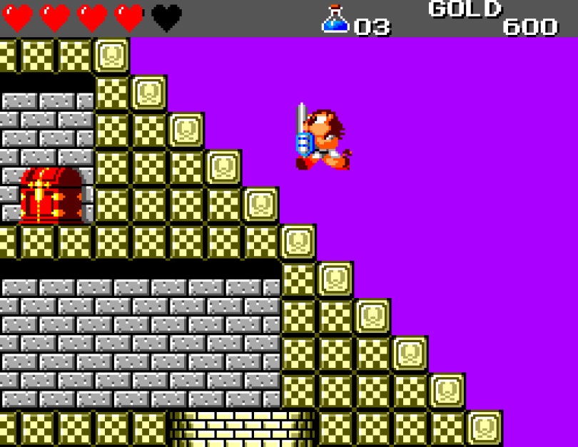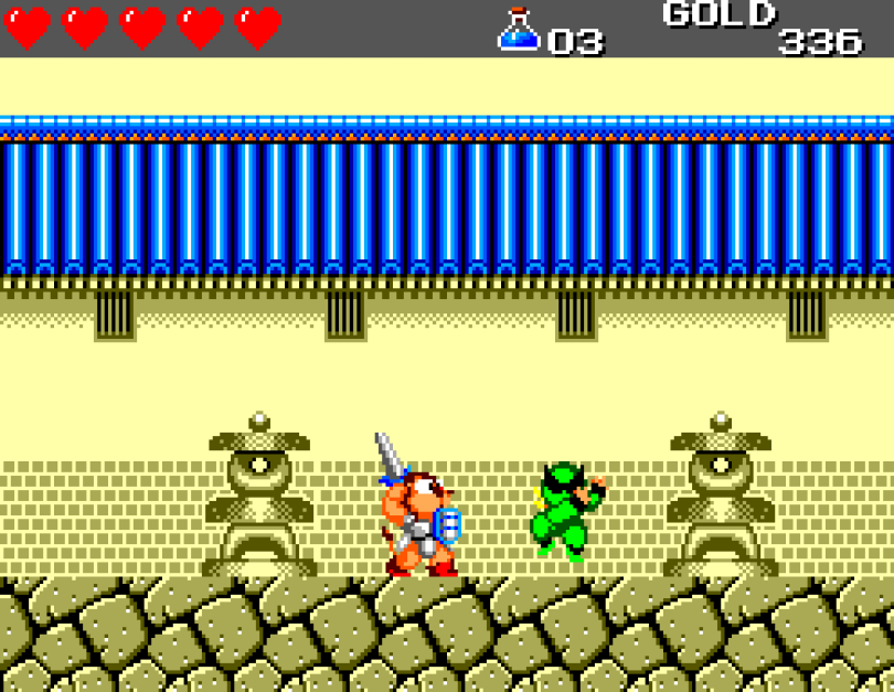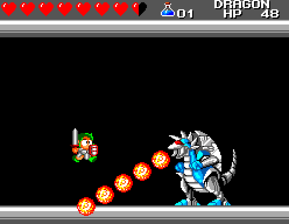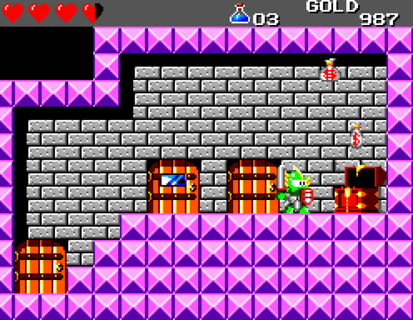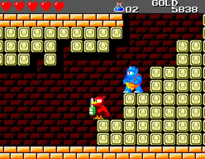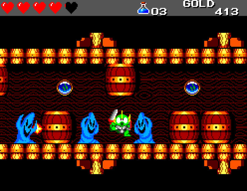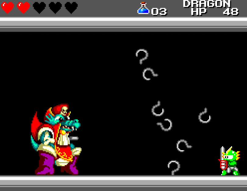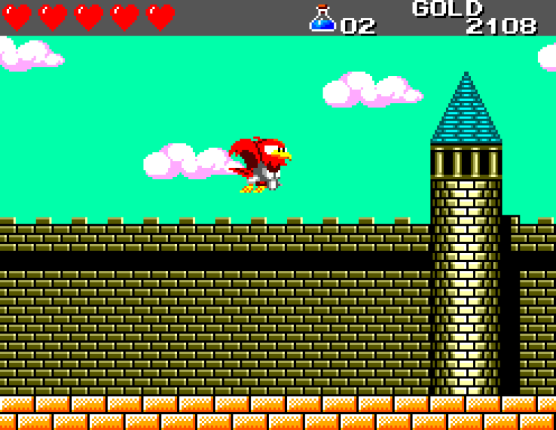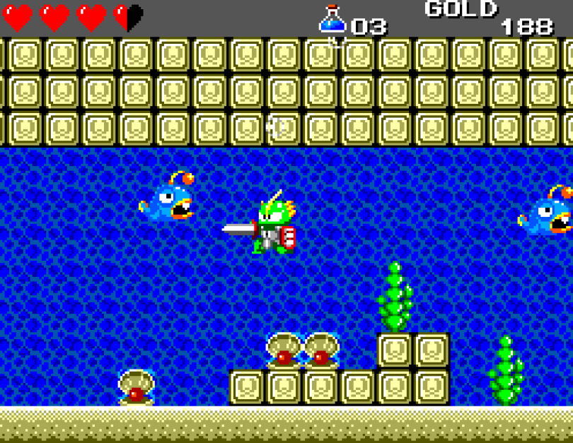 Si on commence le jeu tranquille avec le plein de cœurs et un équipement de folie, dès qu'on sera transformé en dragon/lézard on déchantera vite (et oui, faut bien faire un jeu) puisqu'on commencera tout en bas de l'échelle, donc autant dire avec rien. Il faudra alors parcourir ce monde d'heroïc-fantasy pour trouver des cœurs (afin d'augmenter sa barre de vie), tuer des monstres histoire de récolter le plus possible d'argent (intitulé "gold" dans le jeu) et ainsi faire évoluer son équipement, trouver des passages secrets généralement riches en bonnes surprises (argent, élixir, items) et défaire un à un les boss du jeu, afin d'être à chaque fois transformé.