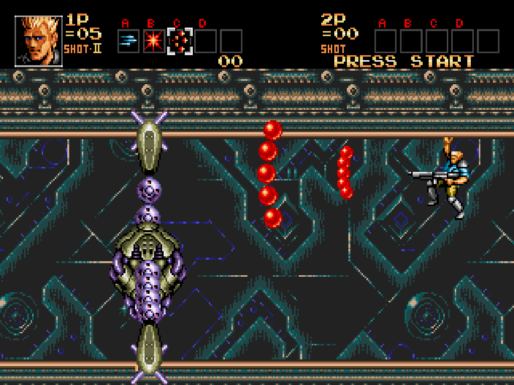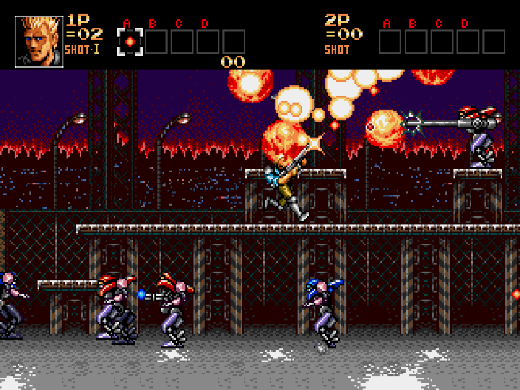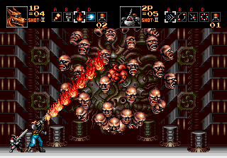 Avec sa jolie cartouche de 16 Mb, Konami était donc attendu au tournant, surtout après un Contra III assez impressionnant du point de vue technique. Au niveau du design des personnages, que ce soit les humains comme les robots, franchement ça passe crème (notez que le commandant Doyle de la version NTSC devient aussi un robot en version PAL). A vrai dire, pour une fois je trouve même que les humains sont mieux... la vérité c'est que c'est surtout dans Super Probotector que j'aime les robots, même si au fond, on s'en fout un peu de tout ça. En solo je n'ai subi aucun bug majeur et pour ainsi dire aucun ralentissement (quelques effacements, mais vraiment rien de méchant). Bien évidemment, ce sera un peu différent en mode 2 joueurs, mais le plaisir d'exploser l'adversité à 2, ça ne s'explique pas.
