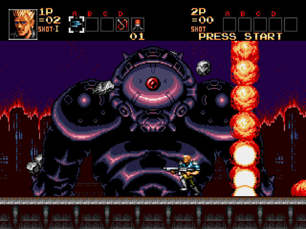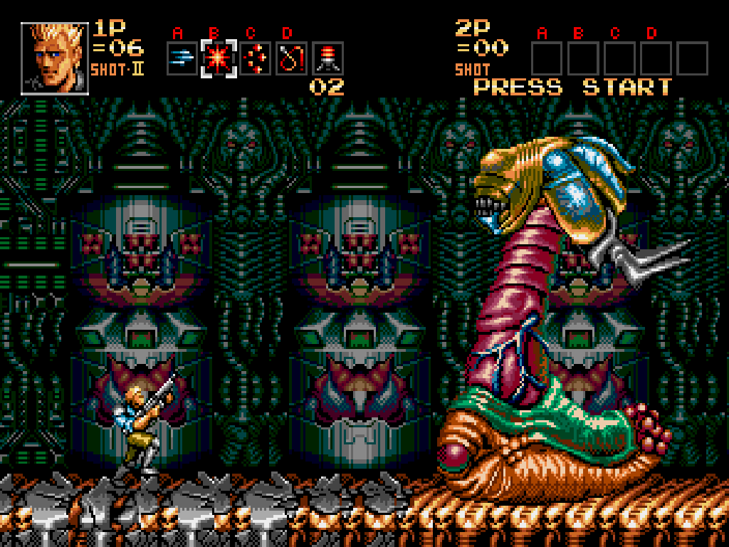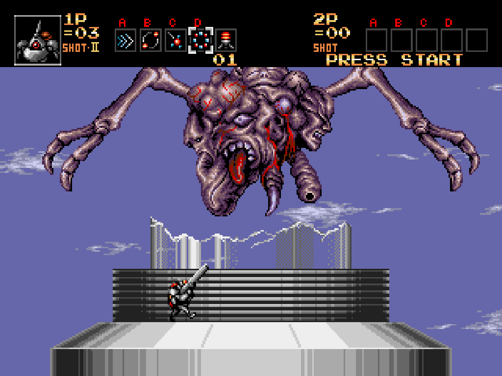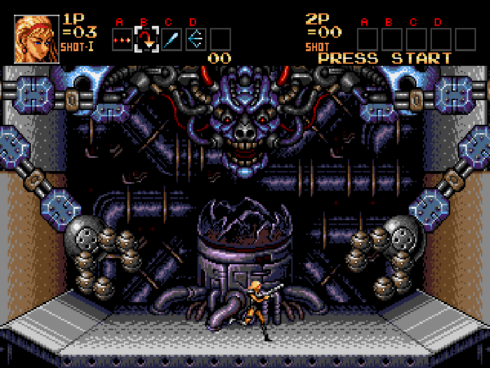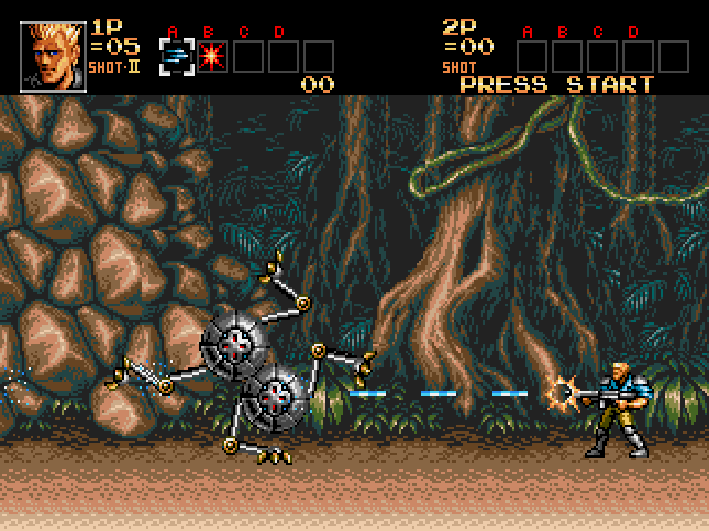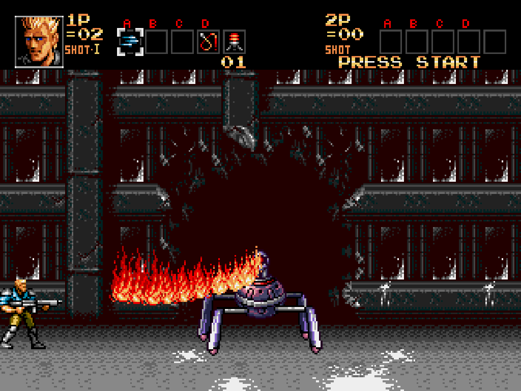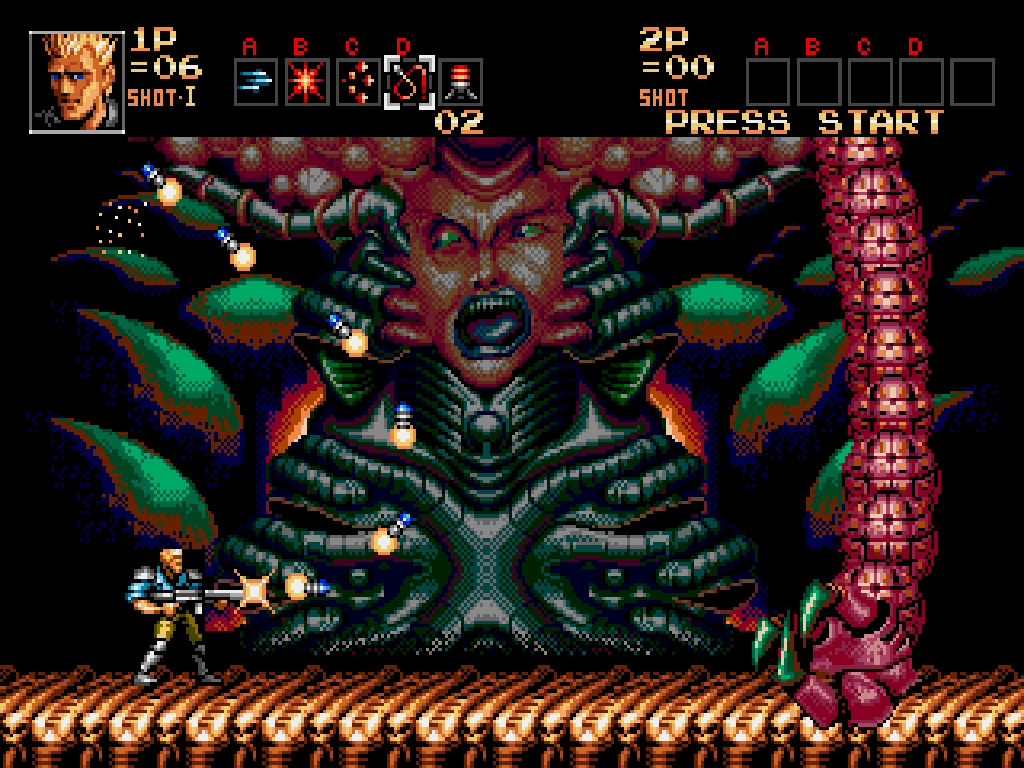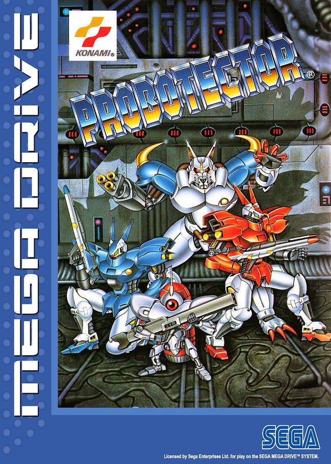 Et bien Konami a d'abord préféré "tâter le terrain", tout en apprenant à maitriser ce support qu'il délaissait jusque-là, Konami étant réputé pour être copain-copain avec Nintendo. Mais que voulez-vous, l'appel de l'argent fait qu'on peut aussi regarder ailleurs. La Mega Drive aura donc attendu un petit moment mais ça y est, à la fin de l'été '94, Contra : Hard Corps débarque et mets tout le monde d'accord. D'accord sur le fait que la Mega Drive aussi peut nous faire des boss gigantesques et des effets de folie. Au Japon il prendra le nom de Contra : The Hard Corps mais en Europe et en Australie, il deviendra Probotector... tout court. Pas de sous-titre car il est le tout premier épisode à voir le jour sur une console de SEGA. Etonnant pas vrai ?