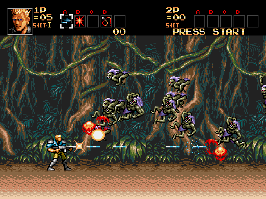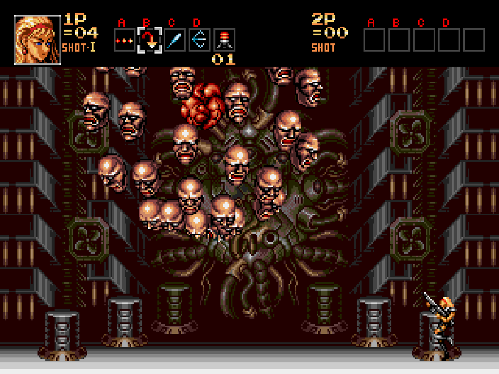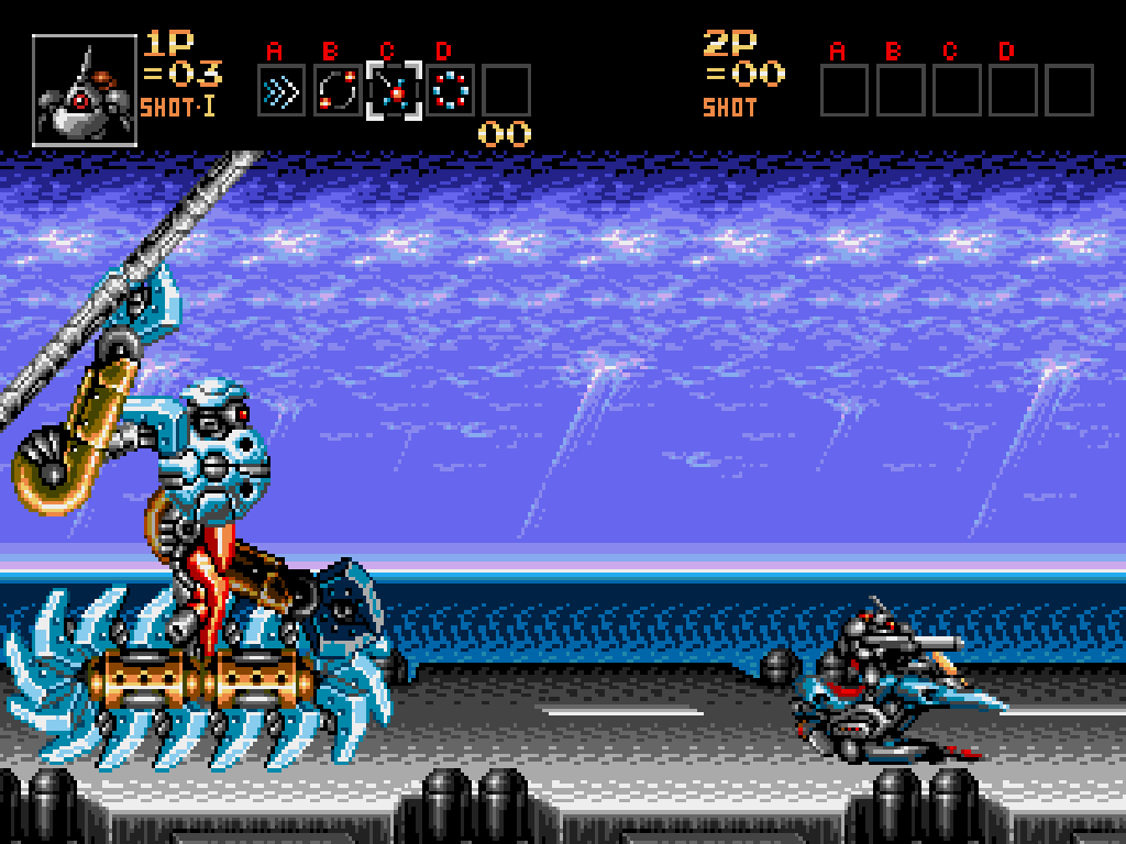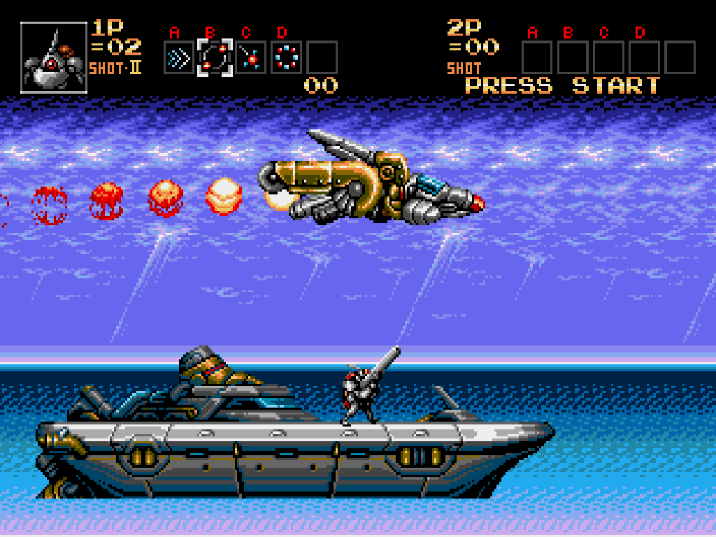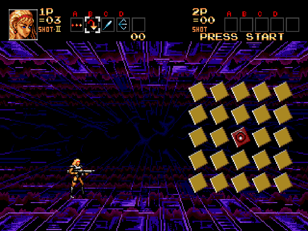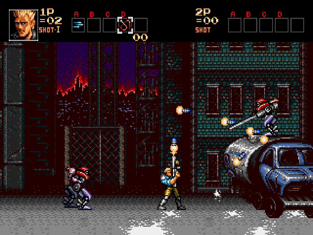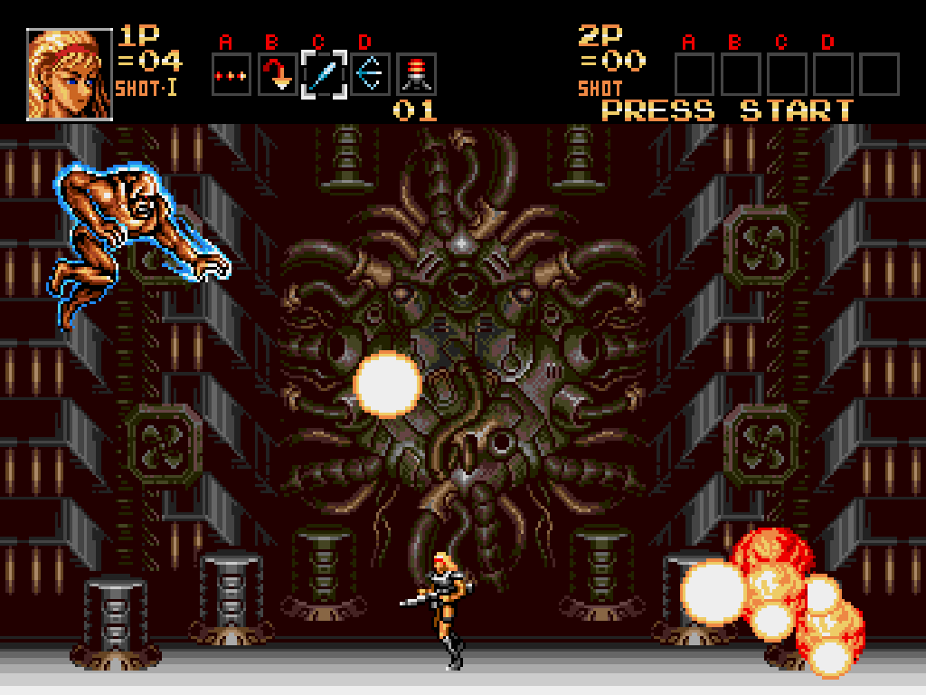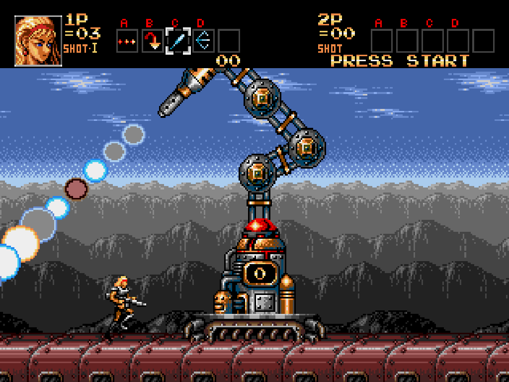 Et bien Konami a d'abord préféré "tâter le terrain", tout en apprenant à maitriser ce support qu'il délaissait jusque-là, Konami étant réputé pour être copain-copain avec Nintendo. Mais que voulez-vous, l'appel de l'argent fait qu'on peut aussi regarder ailleurs. La Mega Drive aura donc attendu un petit moment mais ça y est, à la fin de l'été '94, Contra : Hard Corps débarque et mets tout le monde d'accord. D'accord sur le fait que la Mega Drive aussi peut nous faire des boss gigantesques et des effets de folie. Au Japon il prendra le nom de Contra : The Hard Corps mais en Europe et en Australie, il deviendra Probotector... tout court. Pas de sous-titre car il est le tout premier épisode à voir le jour sur une console de SEGA. Etonnant pas vrai ?