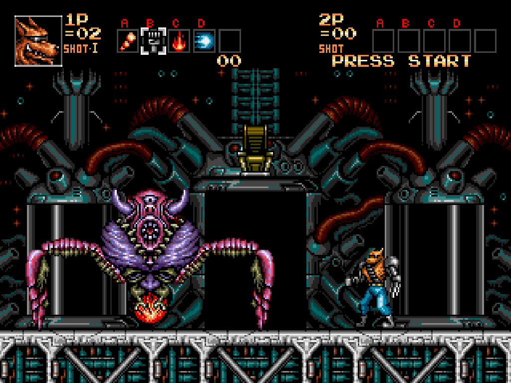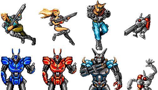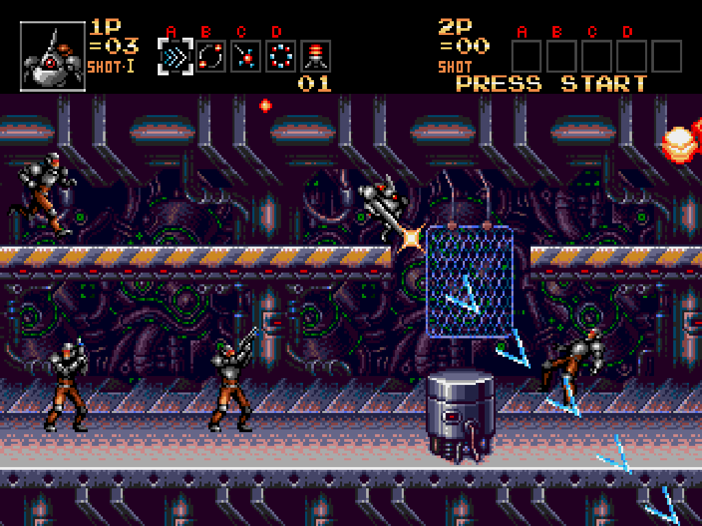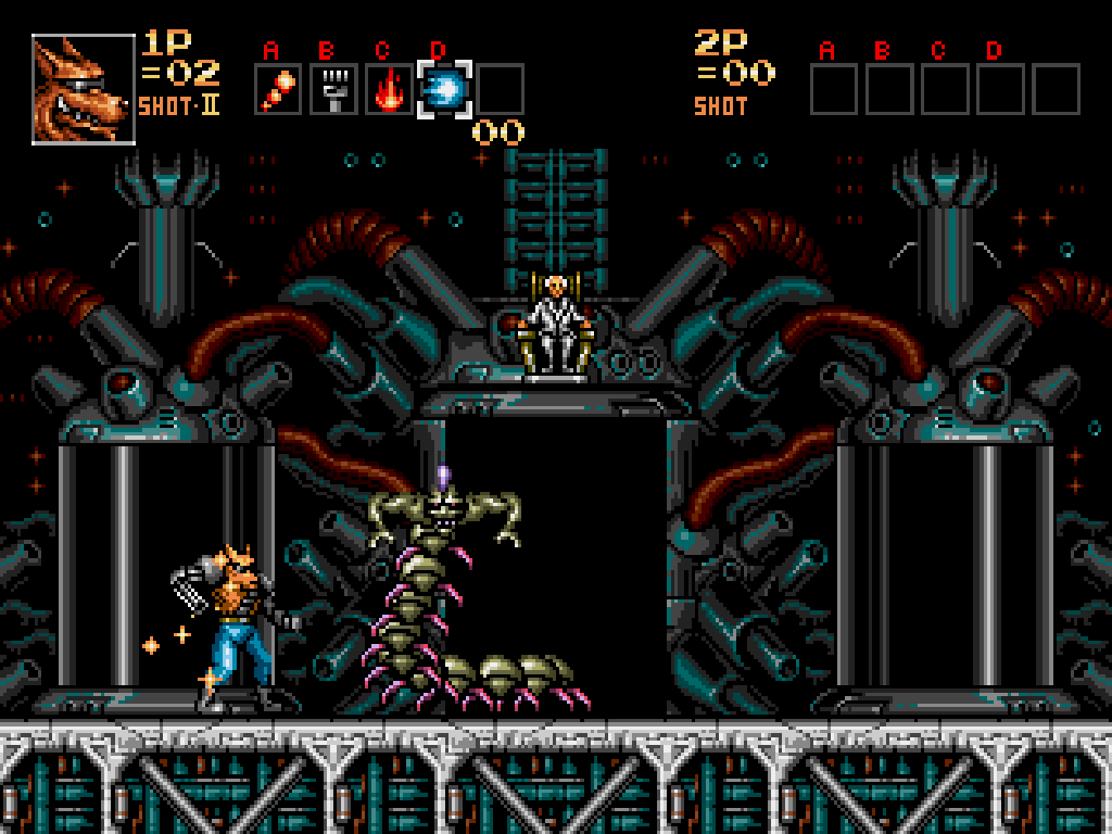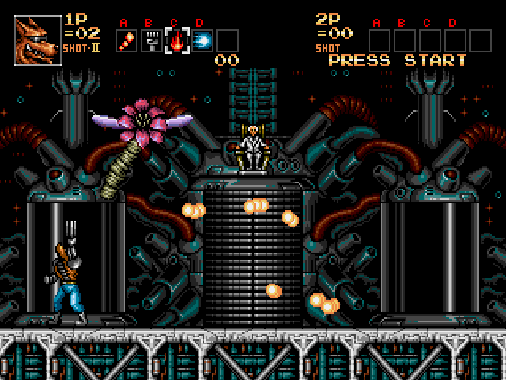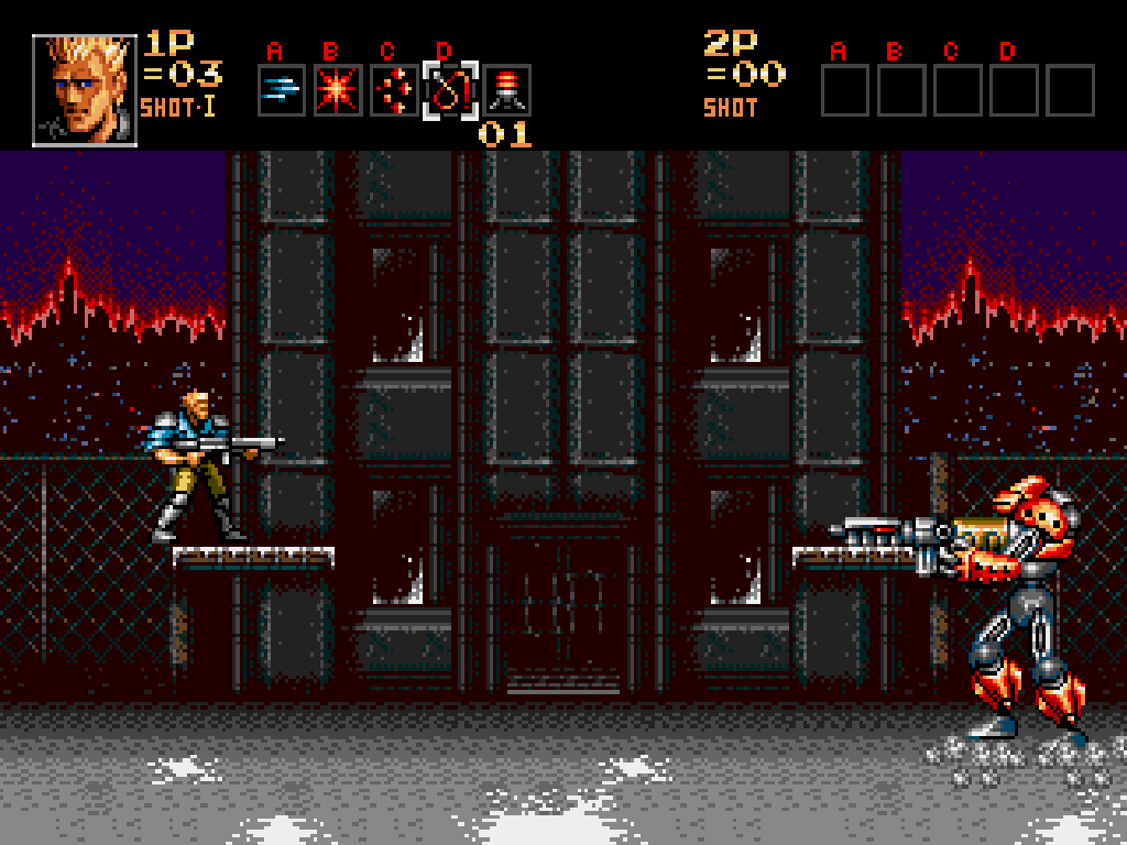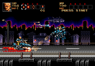 Cette fois on nous propose en plus de choisir notre personnage (ce qui est encore une nouveauté pour la série). On retrouve le héros badass du nom de Ray Poward et son pendant féminin (là aussi c'est une première), Sheena Etranzi. Ces 2 persos sont équilibrés en tout point. Ensuite il y a Brad Fang, un loup anthropomorphe et génétiquement modifié, dont les armes sont plus puissantes mais plus difficiles à maitriser (d'ailleurs il est le seul à ne pas avoir d'arme à tête chercheuse). Enfin il y a Browny, un petit robot capable de planer avec son jetpack et dont la mobilité est accrue. Ses armes sont un peu moins puissantes mais ses déplacements rapides les compensent. En Europe, le jeu a donc été rebaptisé Probotector (à ne pas confondre avec le Probotector original de la NES), remplaçant donc les humains des robots. Et croyez-moi, Konami ne s'est pas cassé un ongle là-dessus : Ray, Sheena, Fang et Browny deviennent respectivement CX-1, CX-2, CX-3 et CX-4 ! L'histoire a été réécrite pour supprimer les éléments de trahison humaine, Brownie n'a même pas été modifié et la cellule extraterrestre a été remplacée par le X-Drive. Mouais, je ne suis que moyennement convaincu... Et vous allez le voir, les différences ne s'arrêtent pas là.