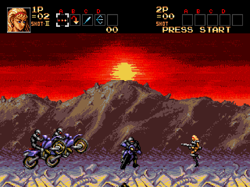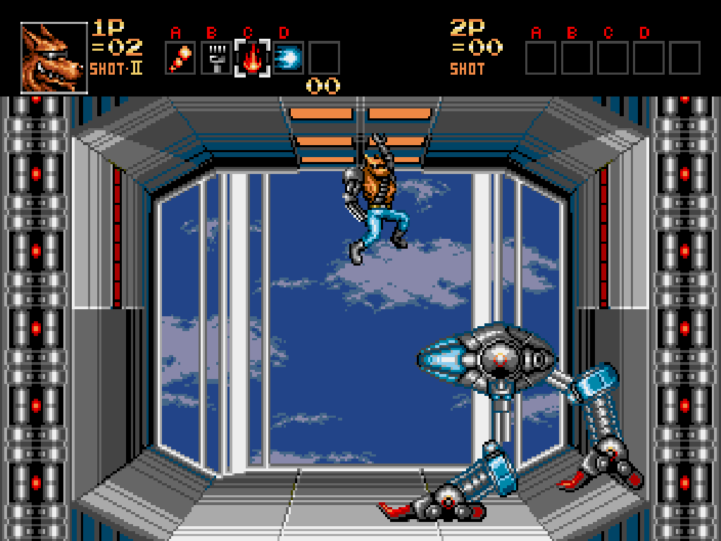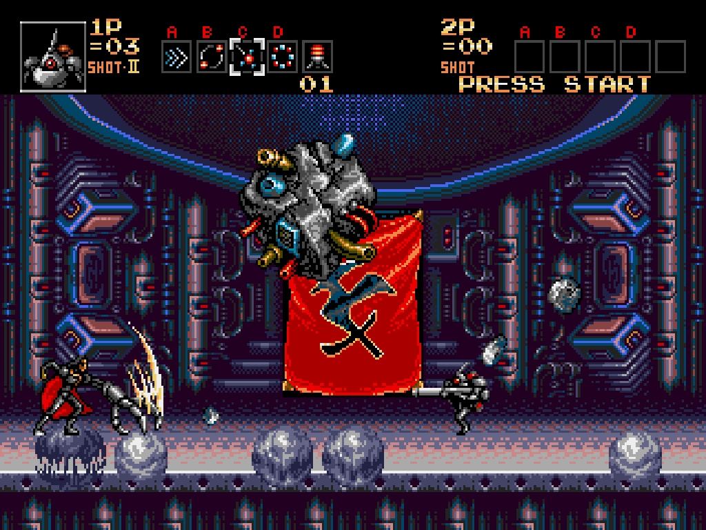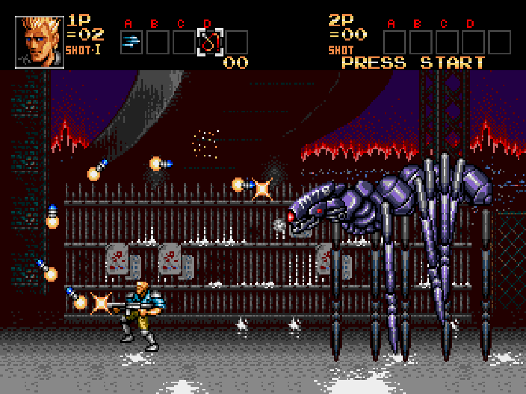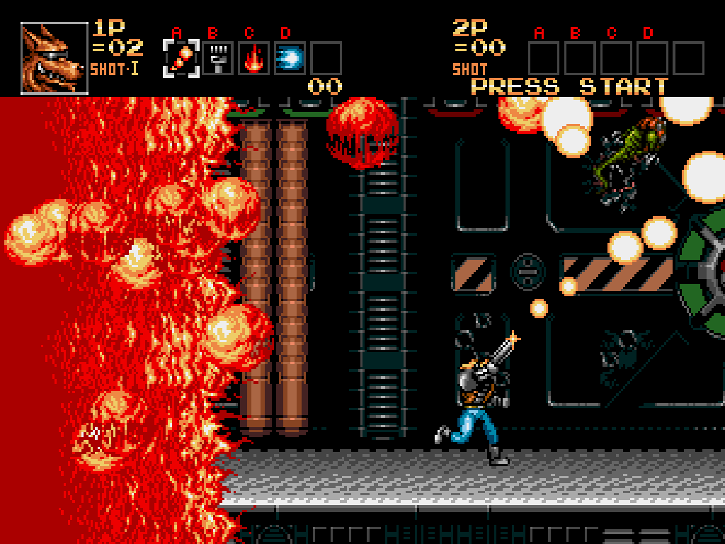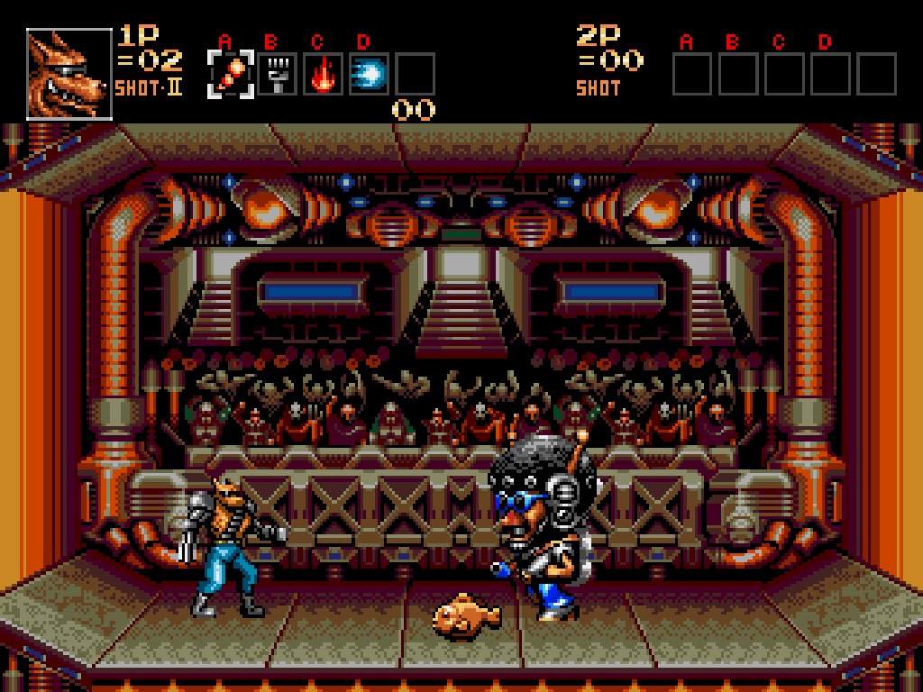 Cette fois on nous propose en plus de choisir notre personnage (ce qui est encore une nouveauté pour la série). On retrouve le héros badass du nom de Ray Poward et son pendant féminin (là aussi c'est une première), Sheena Etranzi. Ces 2 persos sont équilibrés en tout point. Ensuite il y a Brad Fang, un loup anthropomorphe et génétiquement modifié, dont les armes sont plus puissantes mais plus difficiles à maitriser (d'ailleurs il est le seul à ne pas avoir d'arme à tête chercheuse). Enfin il y a Browny, un petit robot capable de planer avec son jetpack et dont la mobilité est accrue. Ses armes sont un peu moins puissantes mais ses déplacements rapides les compensent. En Europe, le jeu a donc été rebaptisé Probotector (à ne pas confondre avec le Probotector original de la NES), remplaçant donc les humains des robots. Et croyez-moi, Konami ne s'est pas cassé un ongle là-dessus : Ray, Sheena, Fang et Browny deviennent respectivement CX-1, CX-2, CX-3 et CX-4 ! L'histoire a été réécrite pour supprimer les éléments de trahison humaine, Brownie n'a même pas été modifié et la cellule extraterrestre a été remplacée par le X-Drive. Mouais, je ne suis que moyennement convaincu... Et vous allez le voir, les différences ne s'arrêtent pas là.