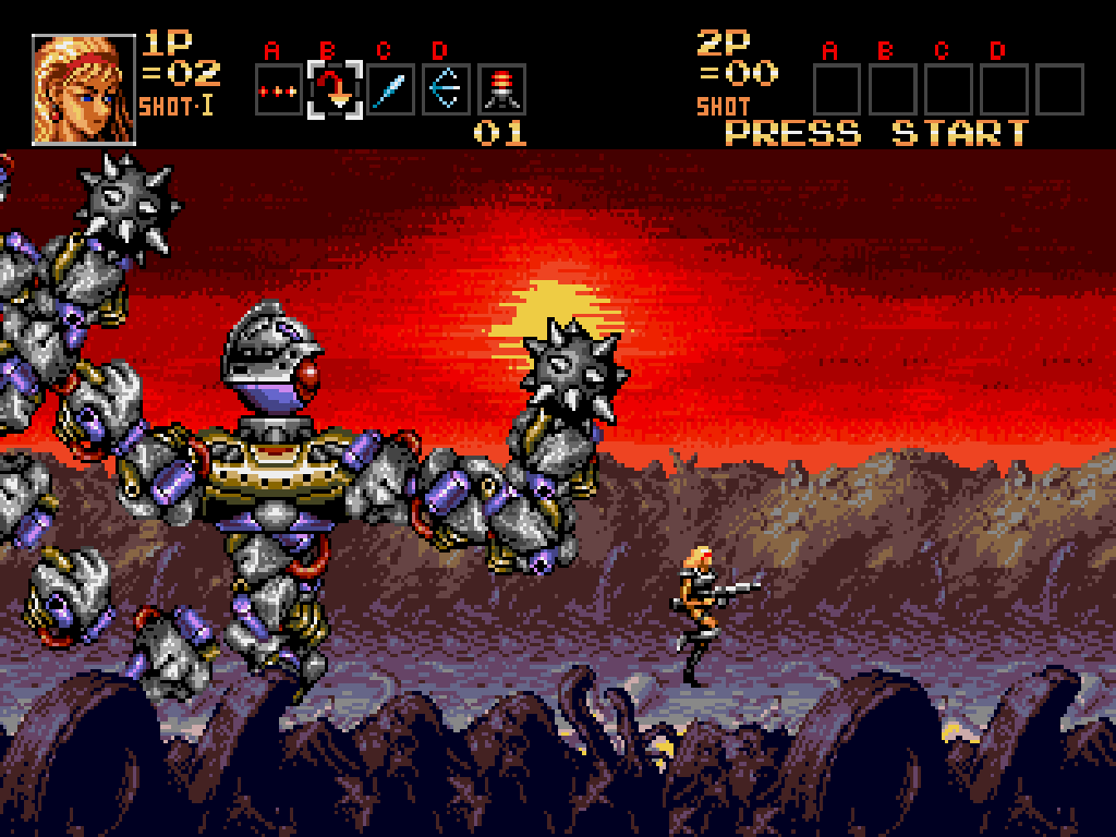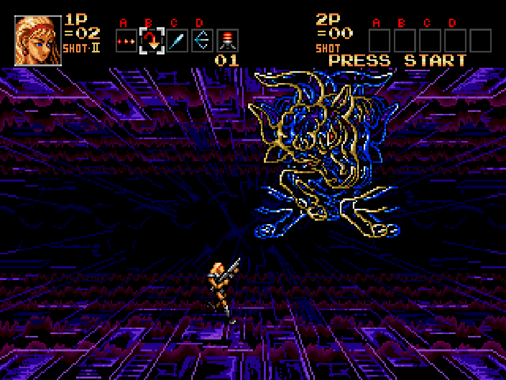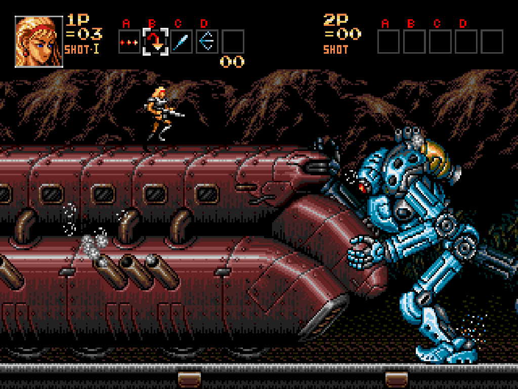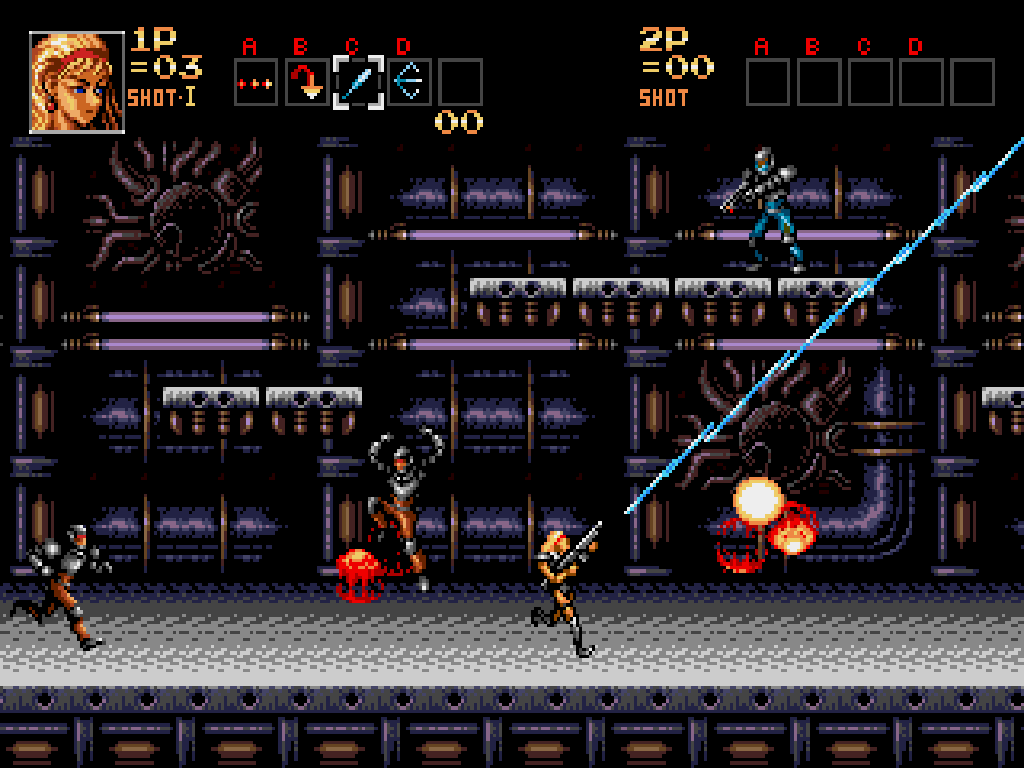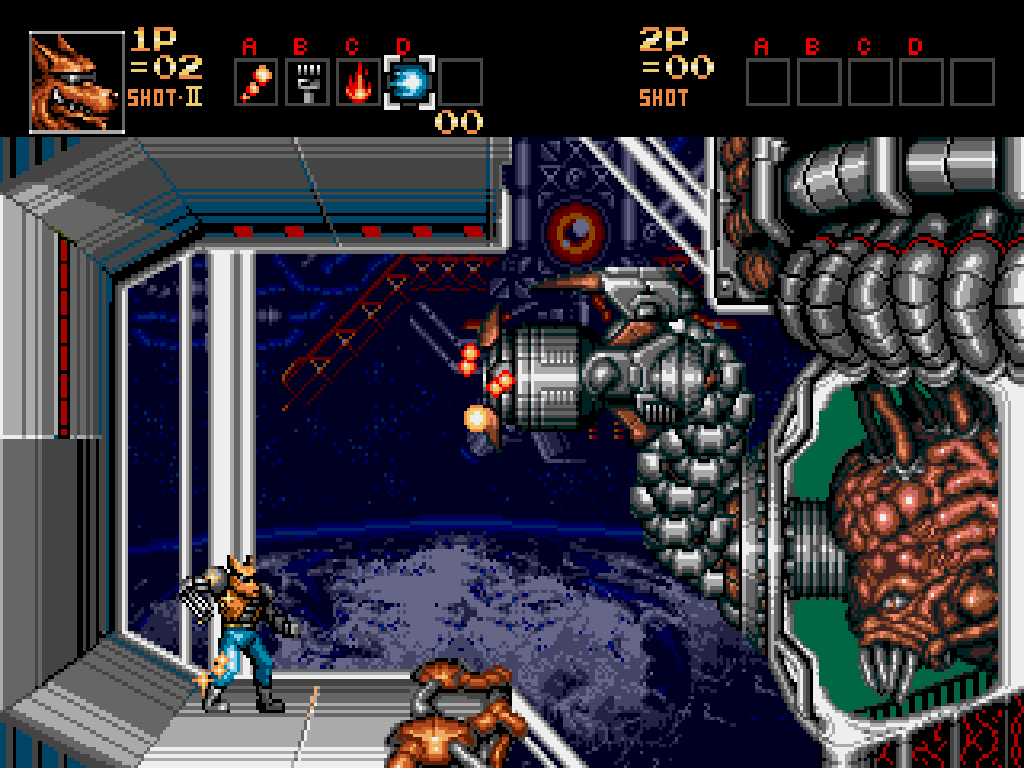 Cette fois on nous propose en plus de choisir notre personnage (ce qui est encore une nouveauté pour la série). On retrouve le héros badass du nom de Ray Poward et son pendant féminin (là aussi c'est une première), Sheena Etranzi. Ces 2 persos sont équilibrés en tout point. Ensuite il y a Brad Fang, un loup anthropomorphe et génétiquement modifié, dont les armes sont plus puissantes mais plus difficiles à maitriser (d'ailleurs il est le seul à ne pas avoir d'arme à tête chercheuse). Enfin il y a Browny, un petit robot capable de planer avec son jetpack et dont la mobilité est accrue. Ses armes sont un peu moins puissantes mais ses déplacements rapides les compensent. En Europe, le jeu a donc été rebaptisé Probotector (à ne pas confondre avec le Probotector original de la NES), remplaçant donc les humains des robots. Et croyez-moi, Konami ne s'est pas cassé un ongle là-dessus : Ray, Sheena, Fang et Browny deviennent respectivement CX-1, CX-2, CX-3 et CX-4 ! L'histoire a été réécrite pour supprimer les éléments de trahison humaine, Brownie n'a même pas été modifié et la cellule extraterrestre a été remplacée par le X-Drive. Mouais, je ne suis que moyennement convaincu... Et vous allez le voir, les différences ne s'arrêtent pas là.