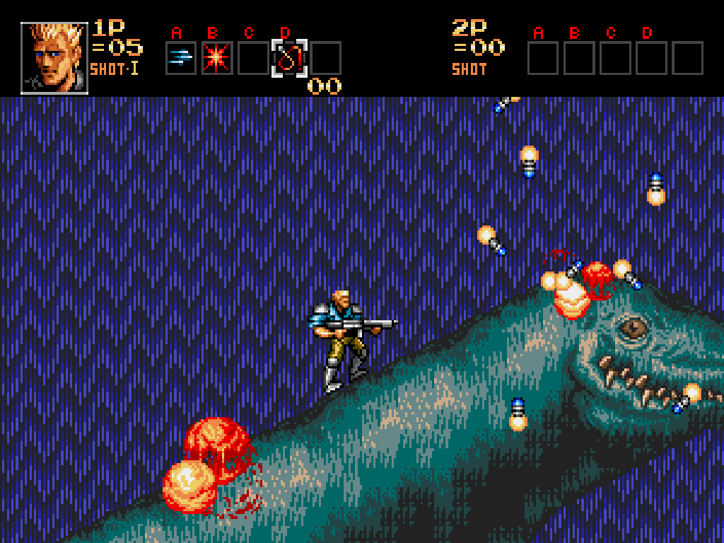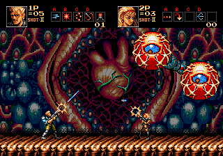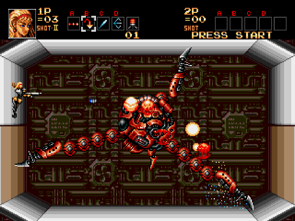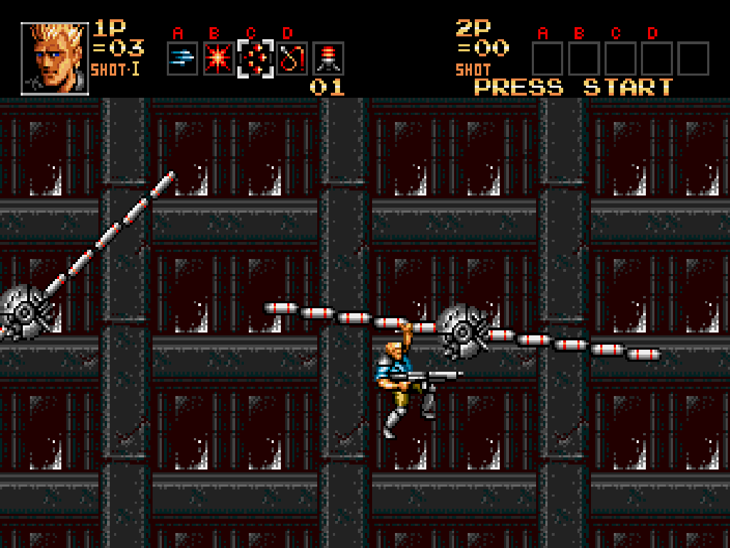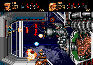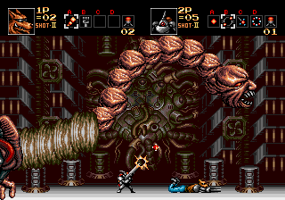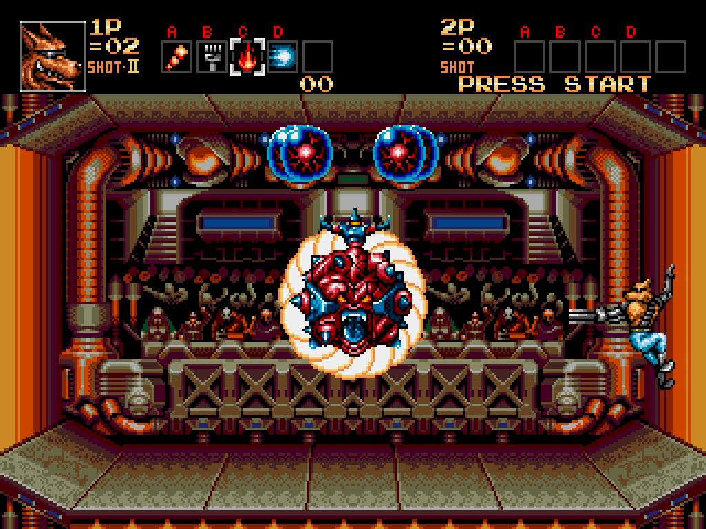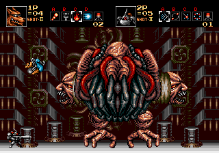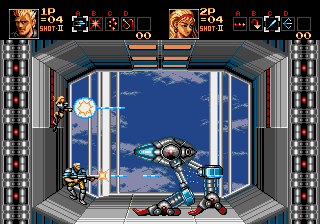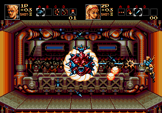 Contra Hard Corps / Probotector, propose un gameplay assez classique pour la série. Nous avons 2 styles de jeu : le premier permet de viser dans les 8 directions tout en restant en mouvement, l'autre fige le joueur lorsqu'il tire. Chaque école à ses adeptes et je trouve sympa que Konami nous laisse le choix (on peut même en changer à la volée, durant la partie). Hormis l'arme de base qui n'est pas très puissante mais suffisante, nous avons principalement 4 armes, non upgradables mais celles-ci sont uniques à chaque personnage ! Ainsi il est intéressant de changer de perso, afin de varier les tactiques (puisque Brad et Brownie sont assez différent des 2 humains). Les armes sont classées par 4 lettres (A, B, C et D), tout en sachant que l'arme A remplace celle de base. Après on retrouve plus ou moins le gameplay de Contra III où on peut grimper sur les murs, s'accrocher au plafond ou aux barres transversales, on sulfate tout azimut, on affronte une pléthore de boss et le jeu prend le pari d'imposer un rythme infernal.
