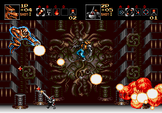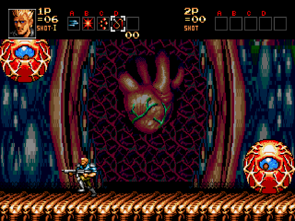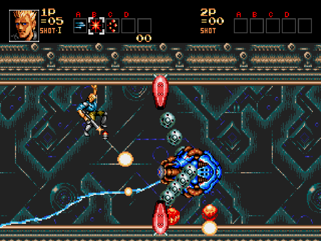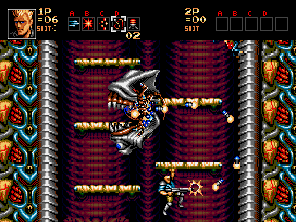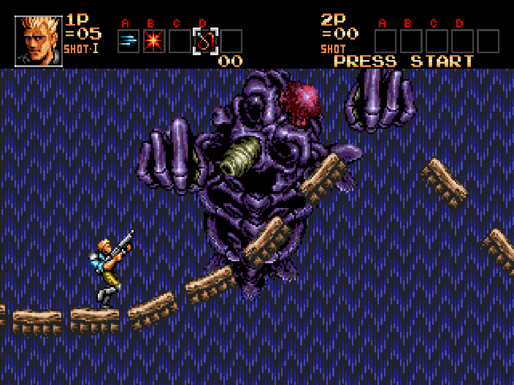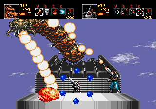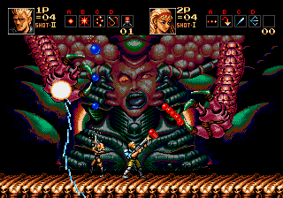 Contra Hard Corps / Probotector, propose un gameplay assez classique pour la série. Nous avons 2 styles de jeu : le premier permet de viser dans les 8 directions tout en restant en mouvement, l'autre fige le joueur lorsqu'il tire. Chaque école à ses adeptes et je trouve sympa que Konami nous laisse le choix (on peut même en changer à la volée, durant la partie). Hormis l'arme de base qui n'est pas très puissante mais suffisante, nous avons principalement 4 armes, non upgradables mais celles-ci sont uniques à chaque personnage ! Ainsi il est intéressant de changer de perso, afin de varier les tactiques (puisque Brad et Brownie sont assez différent des 2 humains). Les armes sont classées par 4 lettres (A, B, C et D), tout en sachant que l'arme A remplace celle de base. Après on retrouve plus ou moins le gameplay de Contra III où on peut grimper sur les murs, s'accrocher au plafond ou aux barres transversales, on sulfate tout azimut, on affronte une pléthore de boss et le jeu prend le pari d'imposer un rythme infernal.