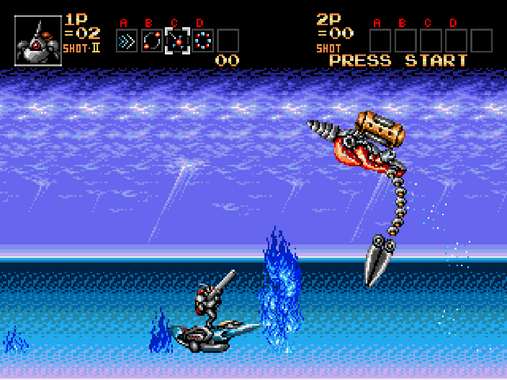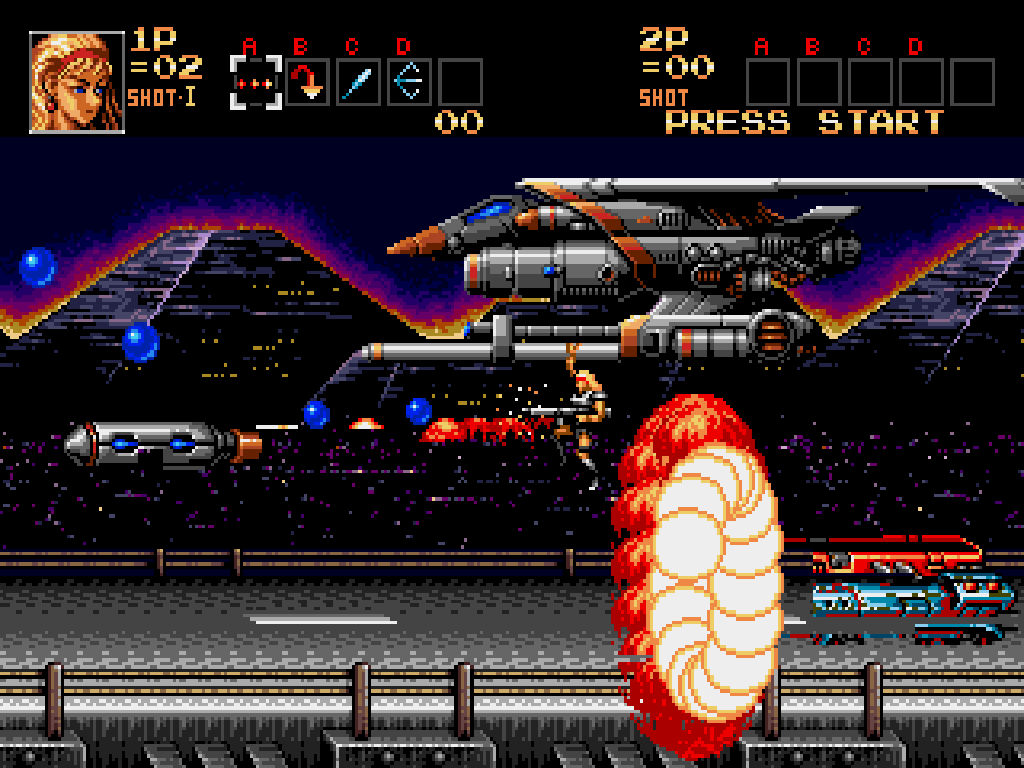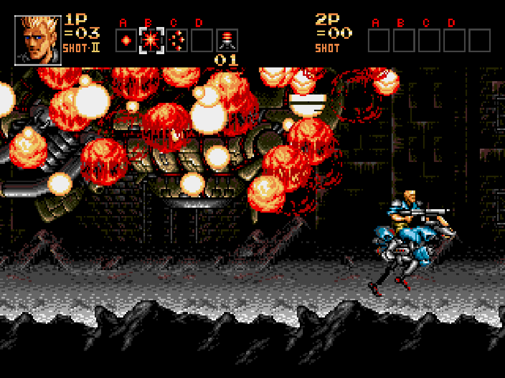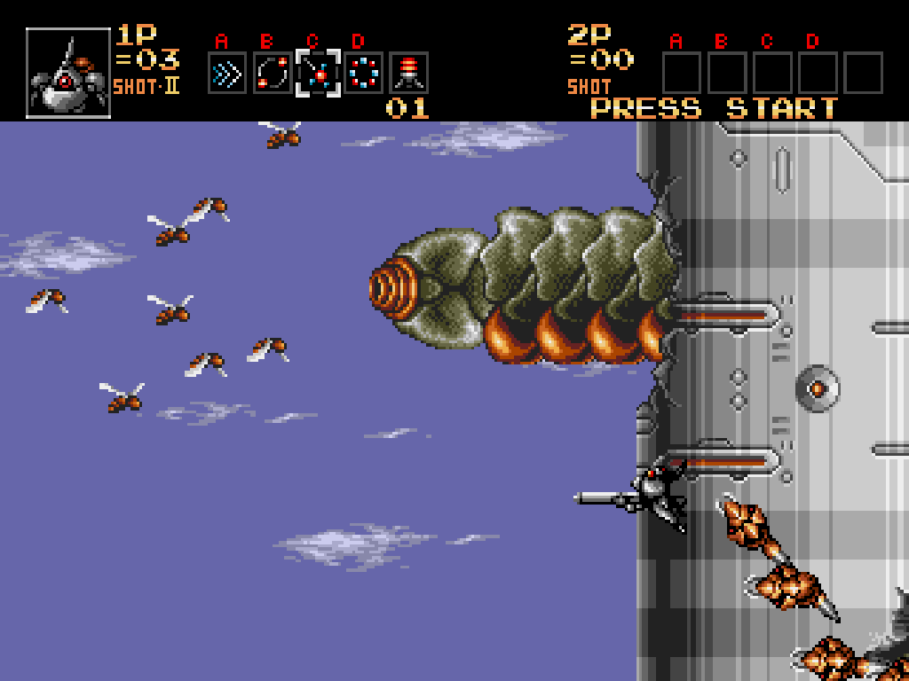 S'inspirant de Gunstar Heroes (lui-même s'inspirant de Contra), ça explose de partout dans un déluge de flammes et de particules et franchement... on adore ça ! On retrouve aussi les "mega-bombes", qui sont en nombre très limité durant l'aventure et là, le bas-blesse. En effet, pour s'en servir il faudra d'abord s'en équiper (exactement comme on switche entre les armes) avant de pouvoir l'utiliser en pressant la touche de tir. Absurde pas vrai ? Certes elle est ultra puissante, mais on perd ce côté instantané de la mega-bombe qu'on lâche pour nous sortir d'un mauvais pas. Konami aurait pu trouver une technique, genre presser la "touche de tir + touche de sélection", ou faire "touche de tir + Start" à la rigueur, car là c'est tout sauf intuitif, au point que je ne m'en suis presque jamais servi. Le pire c'est qu'avec un pad à 6 boutons, il y avait toute la place pour utiliser la bombe, mais fallait pas y compter, on pourra juste switcher entre les guns. Déplorable...