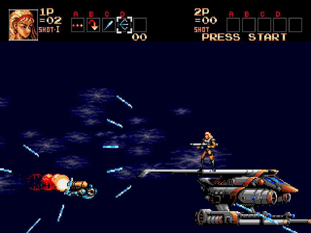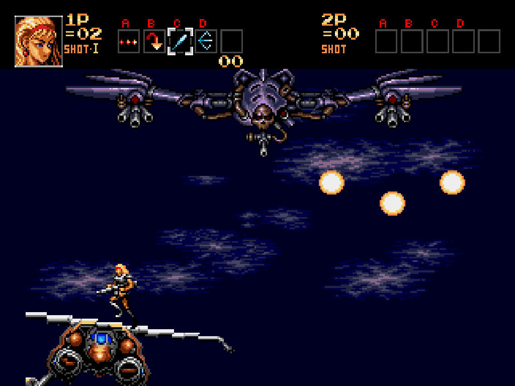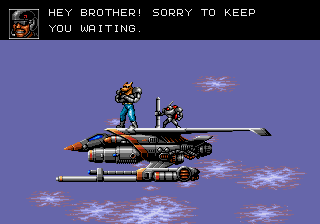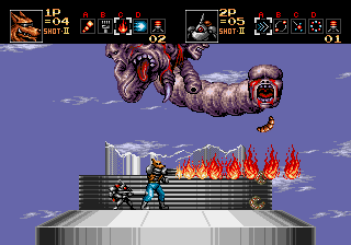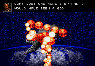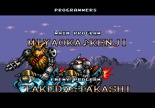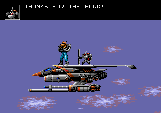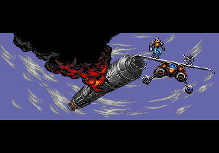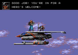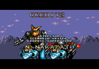 Les bruitages sont corrects mais les musiques sont mauvaises et les digitalisations sont affreuses :( boss sont très nombreux, généralement de grande taille, ils sont superbement animés, il y a énormément de rotations et de parallaxes, et encore une fois, ça bouge super bien ! Les explosions éclatent comme un final de feu d'artifices au 14 juillet, les scènes ne sont pas toutes originales mais elles sont toujours très dynamiques (et non désolé, aucun niveau ne sera en vue de dessus). Le jeu comporte 12 niveaux (plus un caché) et selon nos choix, on en traversera entre 5 et 6. Quand je vous dis que la rejouabilité est excellente, si vous voulez jouer à chaque personnage, voir tous les niveaux et contempler chaque épilogue (sans évoquer la difficulté), vous en aurez pour un bon moment.