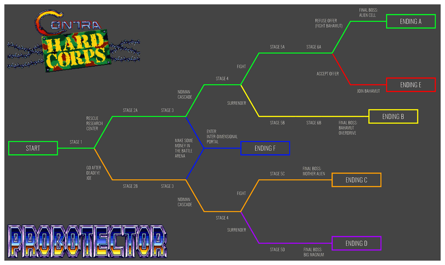 Pour la première fois, le jeu propose un scénario à embranchements avec 6 fins possibles. En effet, tout au long de l'aventure il faudra faire des choix, et ces prises de décisions vous emmèneront à des stages très distincts. Par exemple le premier choix est de poursuivre son ennemi ou d'aller défendre le labo d'une attaque. Le niveau qui en découlera sera donc très différent, et c'est un excellent moyen de nous inciter à recommencer le jeu plusieurs fois, afin d'obtenir l'un des 6 épilogues possibles. Une seule d'entre elles est considérée comme une "bad end", car en fait vous rejoignez les forces du mal. Pas très gratifiante, cette "mauvaise fin" se résume à une seule image. A l'inverse, c'est fou de se dire que les 5 autres fins sont visibles en battant 5 boss qui n'ont rien à voir les uns des autres. Des "grands patrons" au look franchement bizarres pour la plupart, mais quiconque a déjà fini les anciens opus, ne verra rien d'anormal, les aliens ayant toujours été au cœur de l'intrigue.