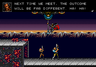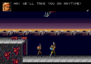 En effet il y a les développeurs qui arrivent à faire des miracles, comme dans Sonic 2, Thunder Force IV ou Shinobi III, et puis il y a les autres... quasiment tous les autres ! Vous vous souvenez de TMNT : The Hyperstone Heist et de ses digitalisations franchement dégueulasses ? Et bien ici c'est tout pareil ! Les voix digit' sont infâmes, elles grésillent et sont à la limite de l'inaudible. Toute la partie audio a été assurée par un staff dédié : Hiroshi Kobayashi, Akira Soji, Kenji Miyaoka, Michiru Yamane, Hirofumi Taniguchi, dans le lot il y a même un certain Akira Yamaoka (oui le grand compositeur des différents Silent Hill). Et bien je peux vous dire que l'OST... c'est de la merde ! Si sur Contra III les musiques étaient assez banales, à minima elles étaient de qualité. Ici la qualité est pourrave et le style ne convient pas. De la techno, sérieusement ? Je veux bien qu'en 1994 c'était dans l'air du temps et que l'action est hyper nerveuse, mais là non, c'est pas possible. Elles ne sont pas toutes dans ce genre là, certes, mais en attendant, pas une ne sort du lot. Si on ajoute à ça une qualité au rabais, des mélodies vraiment pas terribles et des voix affreuses, on a tout à coup l'impression d'être revenu aux premiers jeux de la console... Seuls les bruitages s'en sortent bien, car tout le reste est à jeter.