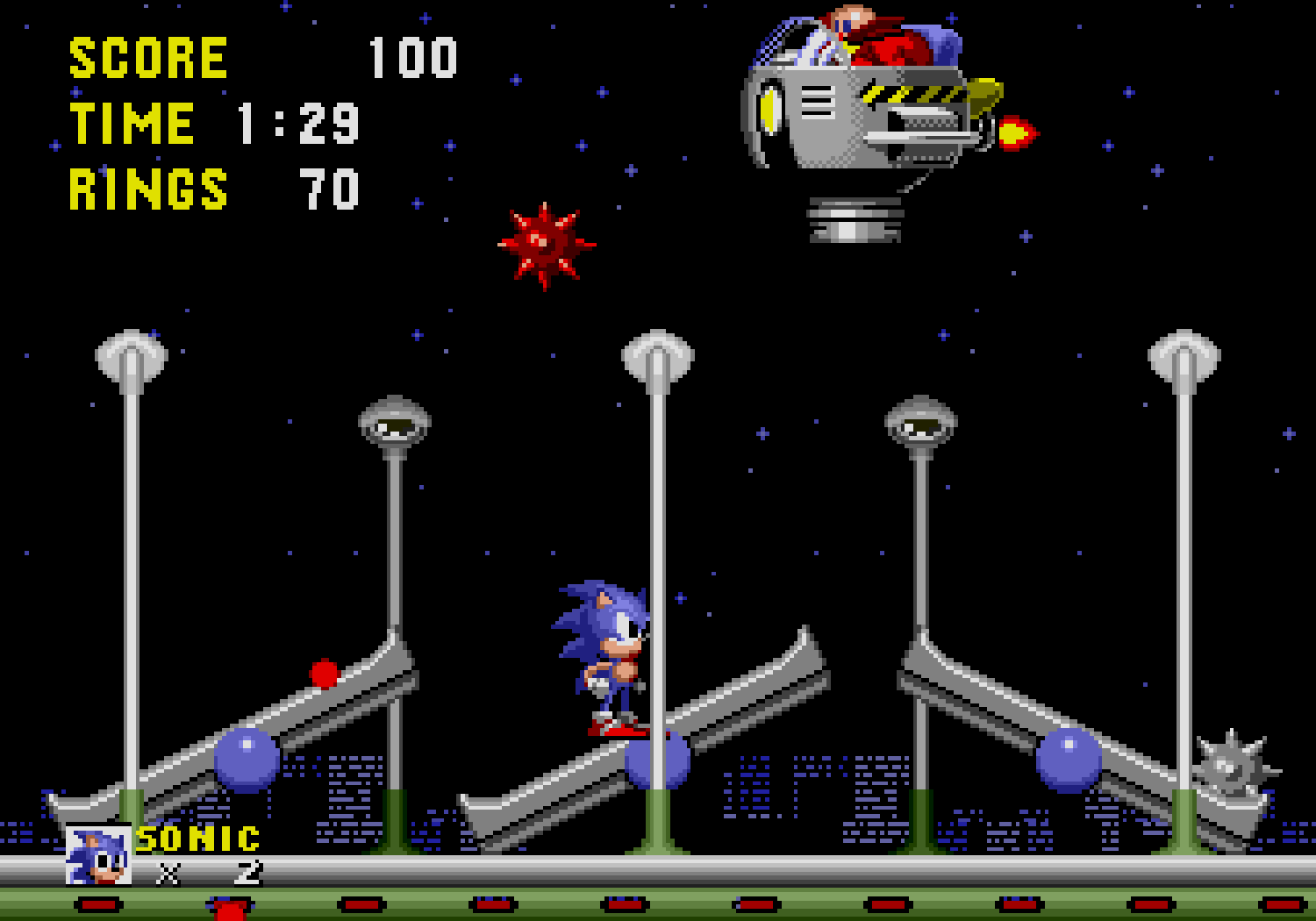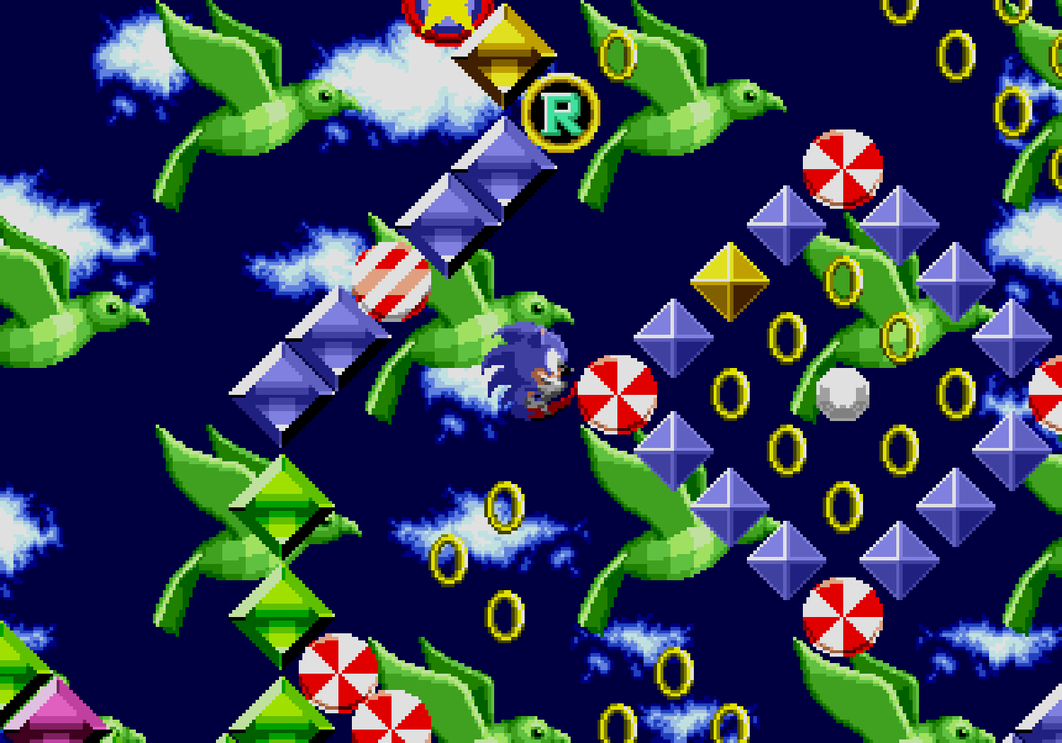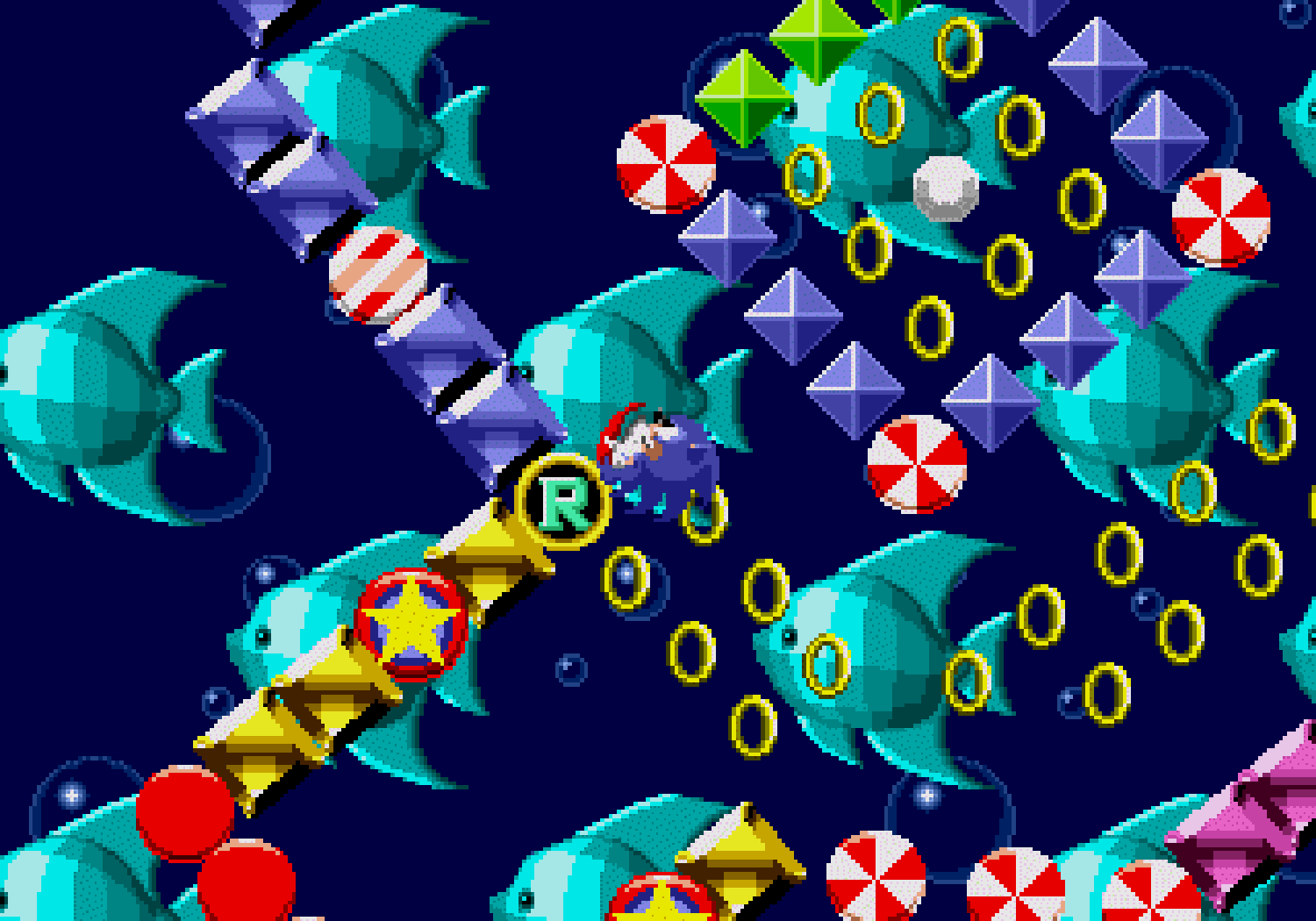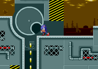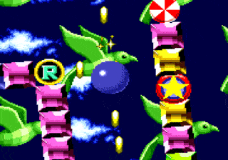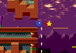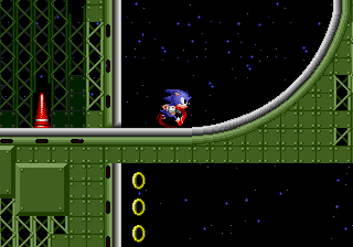 La grande nouveauté, c'est que si Sonic possède au moins un ring sur lui, lorsqu'il se fait toucher il perd son bien mais garde la vie. D'ailleurs il sera possible de récupérer son ou ses anneaux lorsqu'on est touché, d'où une virtuelle invincibilité. Je dis bien "virtuelle" car comme tout bon jeu du genre, si on tombe dans le vide, on meurt. De plus, si vous terminez le niveau avec plus de 50 rings, vous pourrez accéder au bonus-stage (en sautant dans un anneau géant). Le décor est entièrement soumis à une rotation sur 360° degrés et Sonic joue un peu les boules de flipper dans un environnement plein de bumpers. C'est dans ces niveaux que vous pourrez trouver les 6 émeraudes du chaos recherchées par Robotnik. Ces émeraudes au pouvoir étrange, permettraient à Robotnik de devenir le maître du monde, ce que Sonic s'efforcera d'éviter.
