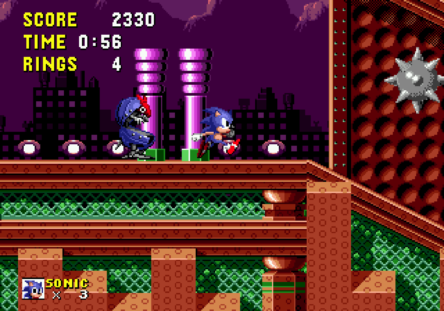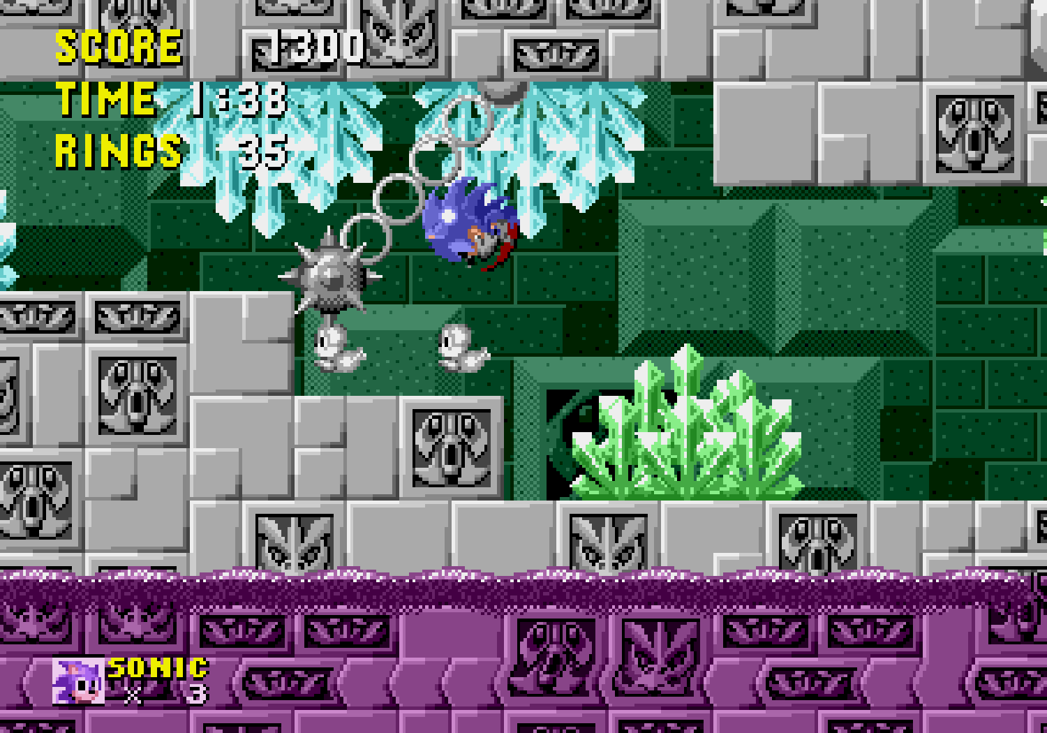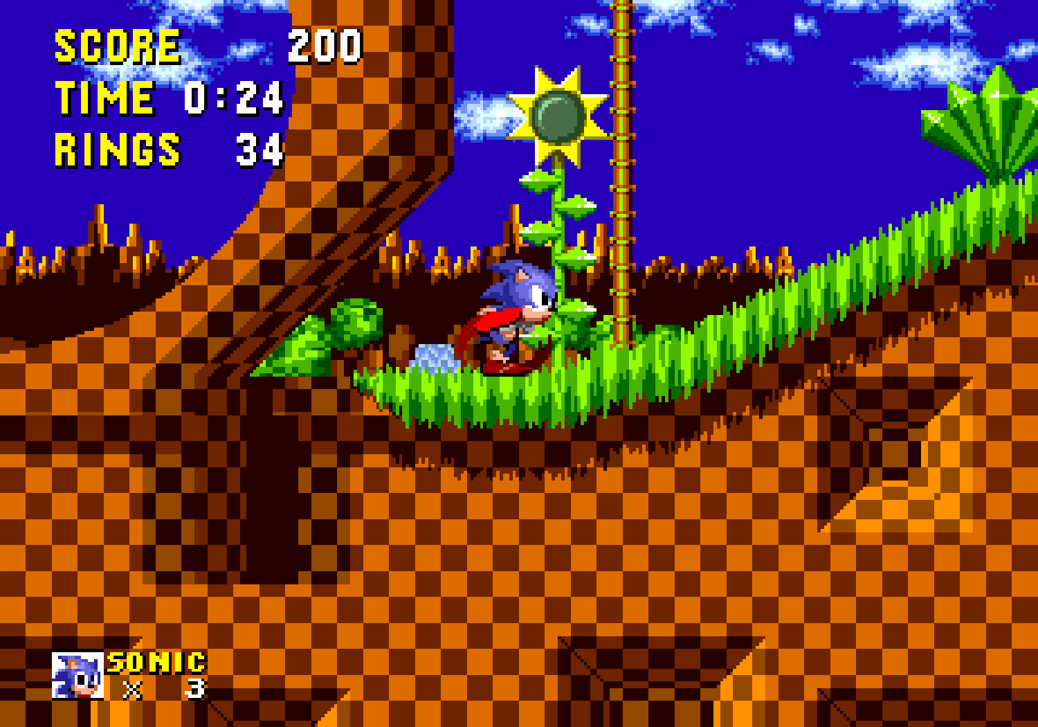 La grande nouveauté, c'est que si Sonic possède au moins un ring sur lui, lorsqu'il se fait toucher il perd son bien mais garde la vie. D'ailleurs il sera possible de récupérer son ou ses anneaux lorsqu'on est touché, d'où une virtuelle invincibilité. Je dis bien "virtuelle" car comme tout bon jeu du genre, si on tombe dans le vide, on meurt. De plus, si vous terminez le niveau avec plus de 50 rings, vous pourrez accéder au bonus-stage (en sautant dans un anneau géant). Le décor est entièrement soumis à une rotation sur 360° degrés et Sonic joue un peu les boules de flipper dans un environnement plein de bumpers. C'est dans ces niveaux que vous pourrez trouver les 6 émeraudes du chaos recherchées par Robotnik. Ces émeraudes au pouvoir étrange, permettraient à Robotnik de devenir le maître du monde, ce que Sonic s'efforcera d'éviter.