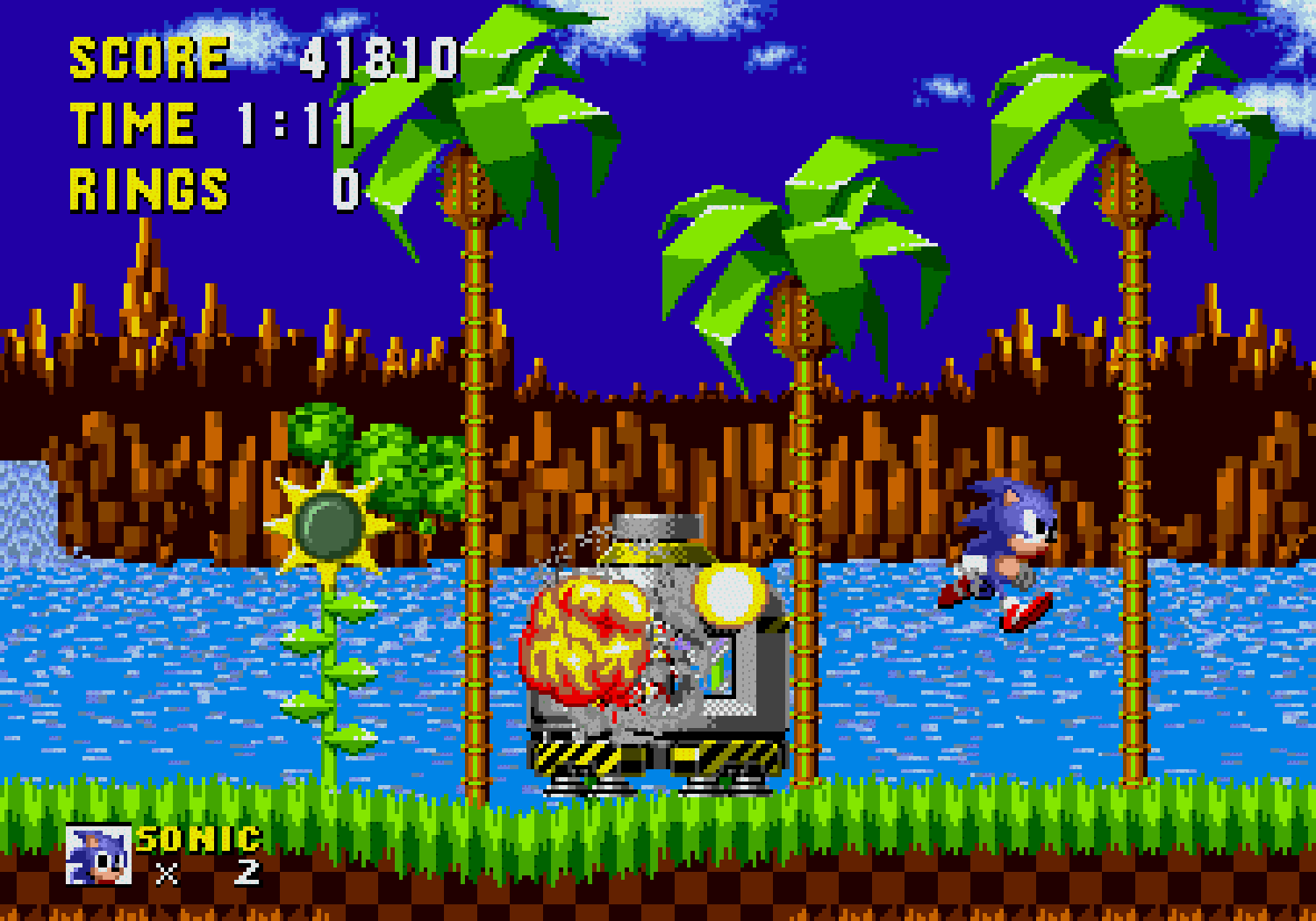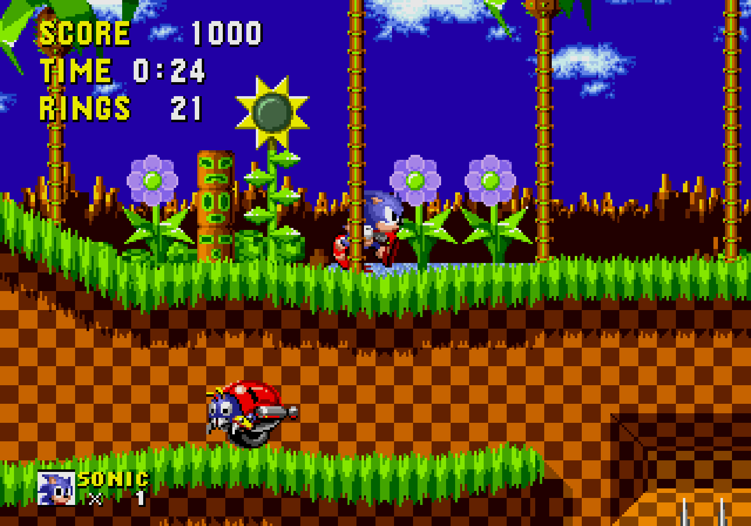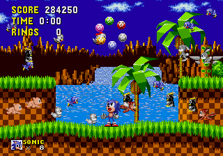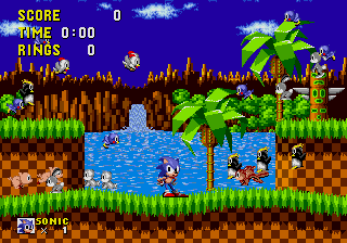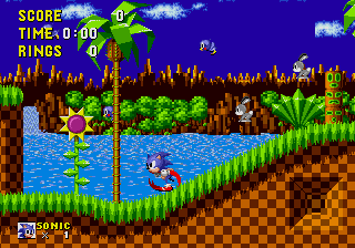 Même côté son la Mega Drive nous prouve qu'elle est capable de mieux que les piètres miasmes acoustiques de son début de carrière dire qu'entre ce premier opus et la montagne de jeux vilains et graphiquement poussifs auxquels on nous avait habitué, il n'y avait pas photo ! Les graphismes sont ici somptueux ! Les décors (6 mondes pour 6 thèmes) sont vraiment magnifiques, parfaitement colorés, ce qui est une première sur une console ayant une trop faible palette de couleurs. Le design est furieusement original, les détails sont fins et c'est parfaitement animé. Car la débauche de couleurs n'a d'égale que l'originalité des niveaux et même les boss (ou la création du mal débile selon SEGA) sont terribles. Bien sûr il subsiste quelques ralentissements, mais quel jeu 16-bits n'en a pas ? Des parallaxes, de superbes rotations et une vitesse de défilement du décor ahurissante, SEGA prouve que sa Mega Drive n'a rien a envier à la concurrence. La console donne tout ce qu'elle a ! Seuls les niveaux bonus sont soumis à une rotation un peu saccadée mais ça reste impressionnant pour une console qui est dépourvue de Mode7. Enfin pour accentuer son petit côté mignon, il ne faut jamais laissé Sonic sans rien faire, sinon môssieur tape du pied, s'impatiente.