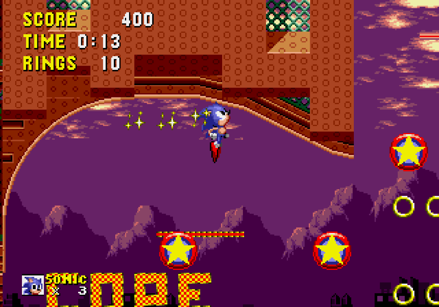 Techniquement, les bonus stages de Sonic sont très impressionnants. Ils sont aussi très difficiles et récupérer toutes les émeuraudes sera un véritable défi. A droite, voici à quoi ressemble le fond animé lorsqu'il n'y a pas le décor au premier plan...