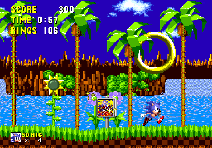 En fin de niveau, c'est en sautant dans ces anneaux géants que vous accéderez aux bonus stages... est un jeu de plates-formes dont ce premier épisode invente tout ce qui sera plus tard réintroduit dans ses diverses suites : bumpers, loopings, voie d'accélération, ennemis robots, checkpoints, bonus-stage, rings, émeraudes, etc... mais commençons par le commencement. Le gameplay est basé sur un vieux routard de la plates-formes, j'ai nommé Super Mario Bros. Il faut dire que ce dernier a posé les bases du genre, des bases que seul Sonic aura fait (un peu) évoluer. Ainsi les pièces de Mario sont remplacées par des anneaux ("ring" en anglais) mais le concept est le même : au centième collecté, vous avez droit une vie supplémentaire.