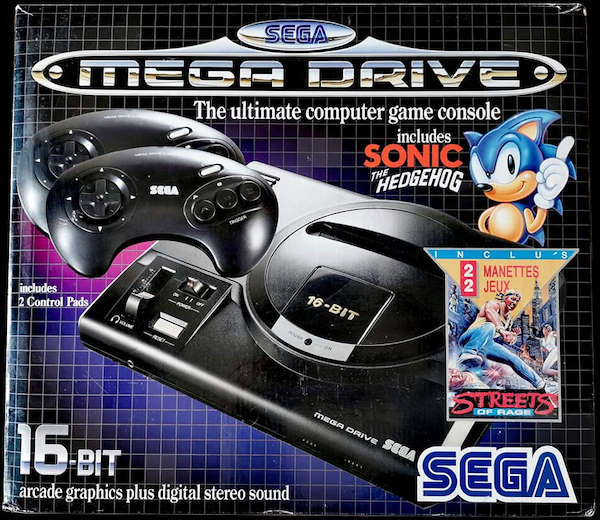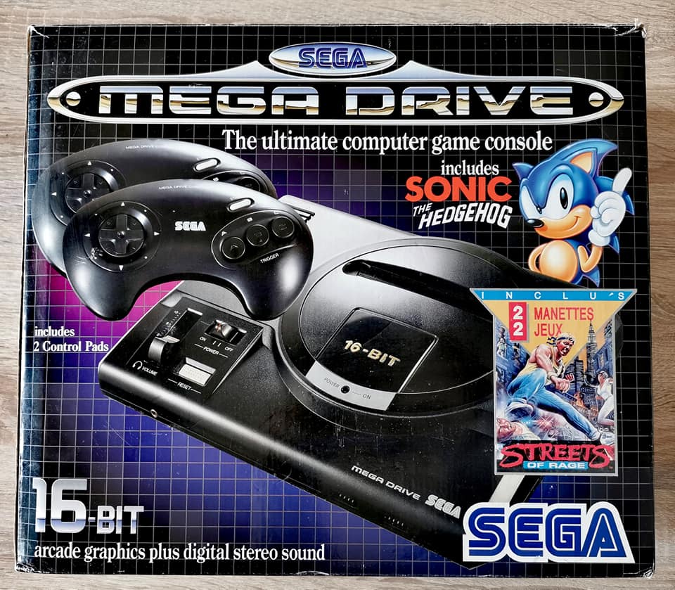 A Noël 1992, en France nous avons eu ce mega pack qui comportait la console, 2 manettes et 2 jeux : Sonic et Streets of Rage. C'est celle que j'ai eu, j'avais 16 ans et j'étais l'ado le plus heureux du monde. ^___^ Aaaahhh que de (bons !) souvenirs (cliquez sur l'image pour agrandir)