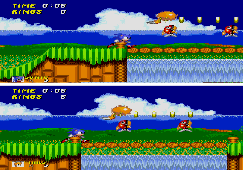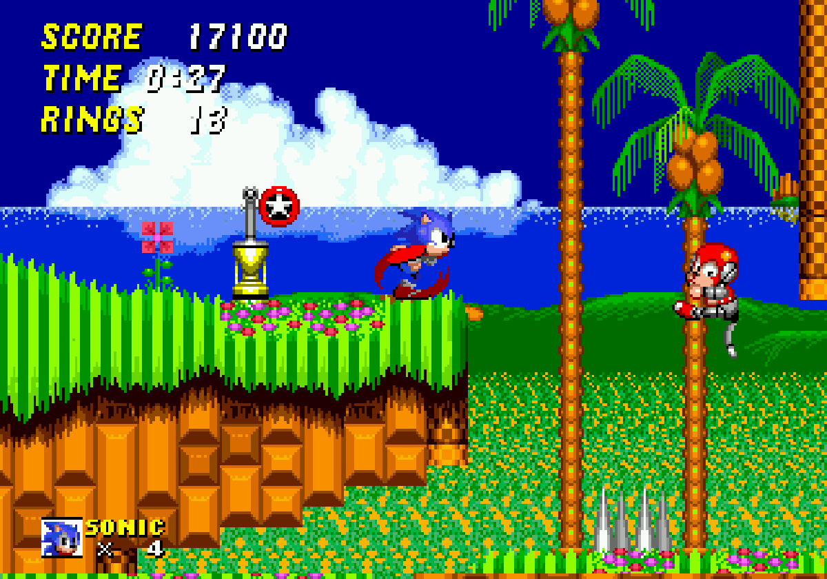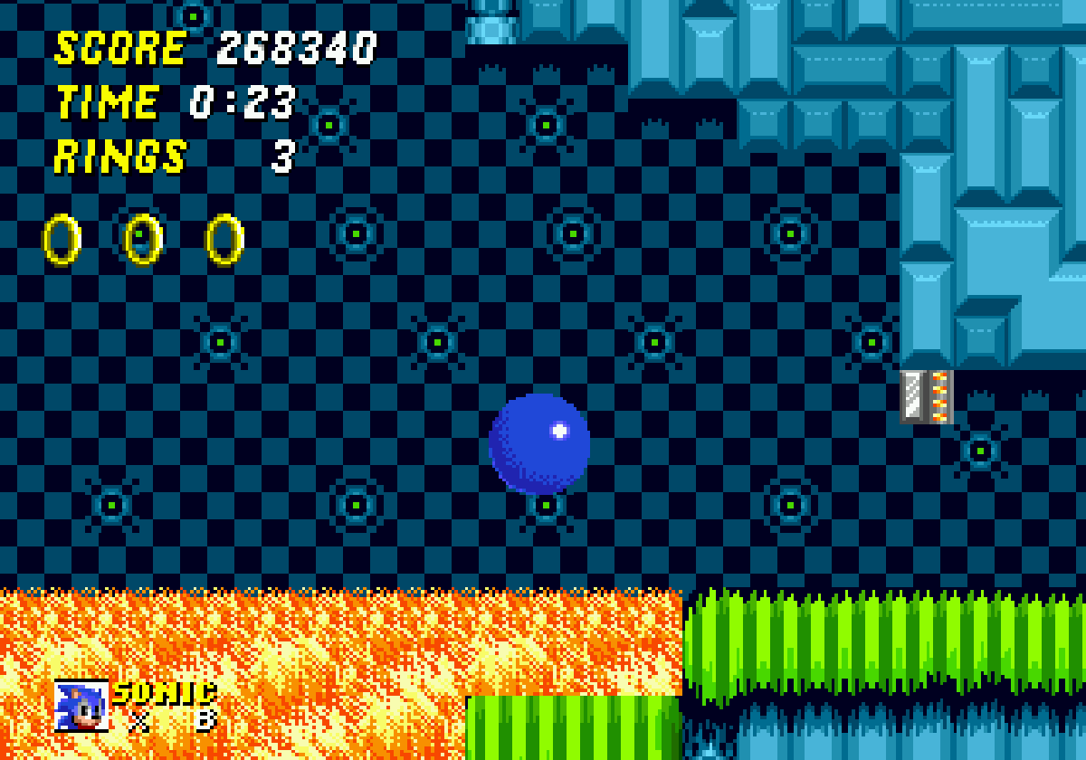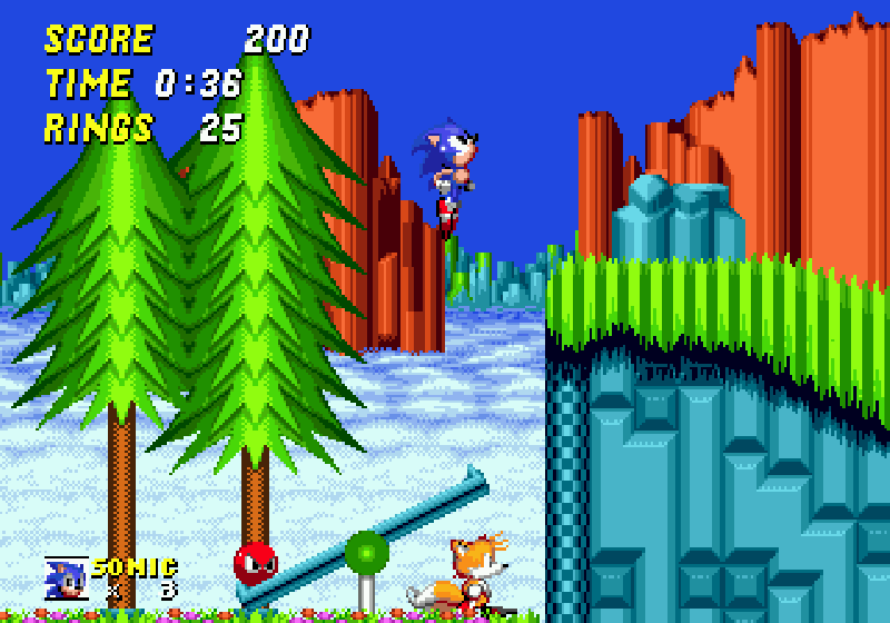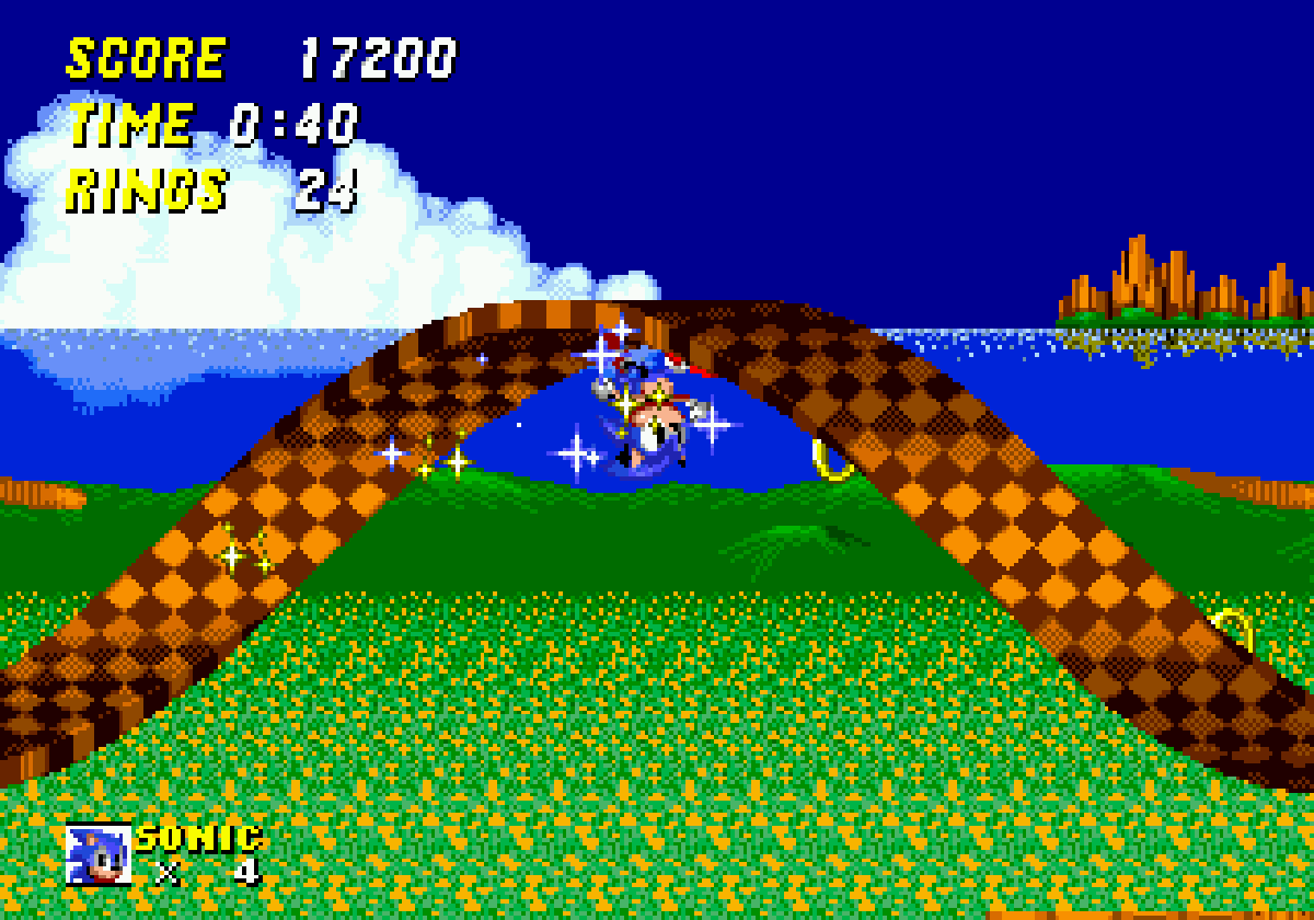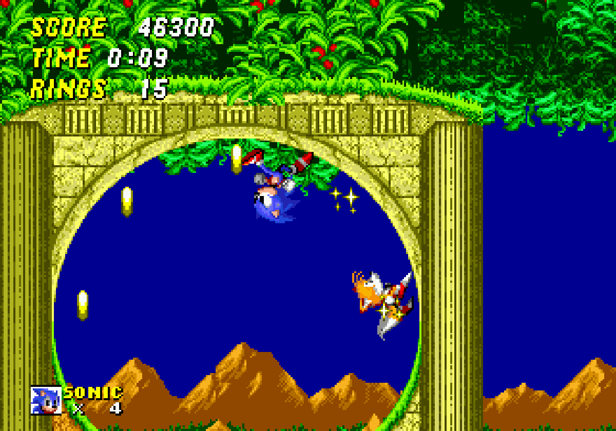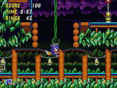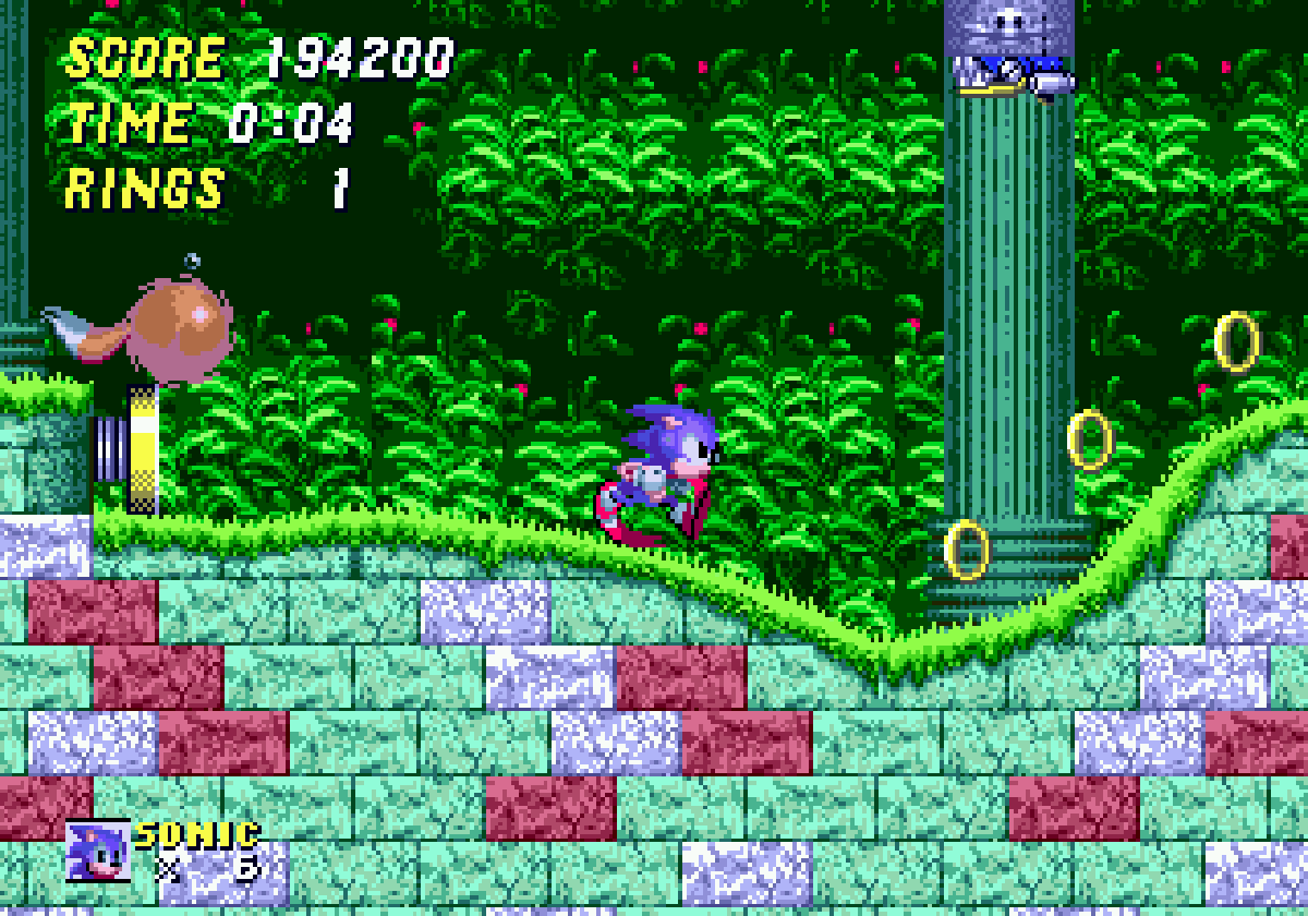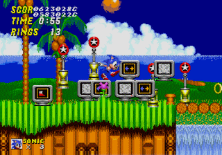 Pour en venir à parler des 3 grosses nouveautés de cet épisode, Sonic possède un nouveau mouvement dont on servira tout le temps : le spin-dash. En maintenant "bas" puis "saut", Sonic se met en boule et tournoie sur lui-même pour s'élancer lorsqu'on lâche le bouton. Ça évite de reculer sans cesse pour prendre de l'élan. Cet ajout est majeur pour la série (même s'il n'y parait pas de prime abord) et c'est sans doute le seul petit truc qui manquait au premier opus. Ensuite il faut savoir que les continues ne se gagnent plus dans les bonus-stages mais en finissant les niveaux avec plus de 100 rings. Pour accéder aux bonus-stages, il faut désormais passer les barres de checkpoints avec plus de 50 rings sur soi et entrer dans le cercle d'étoiles qui s'y forme. Seul problème, lorsqu'on entre dans ces zones, on en ressort à sec, plus un ring en poche et si vous aviez une bulle de protection, elle sera perdue.