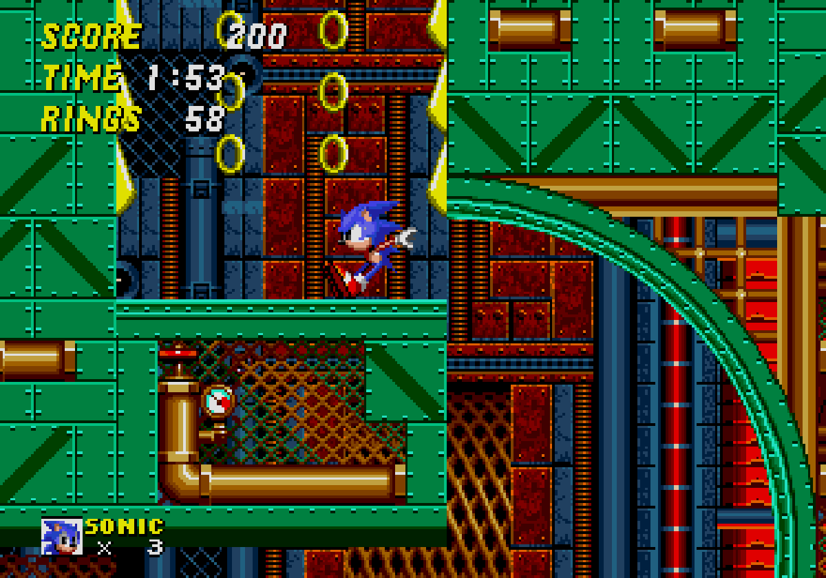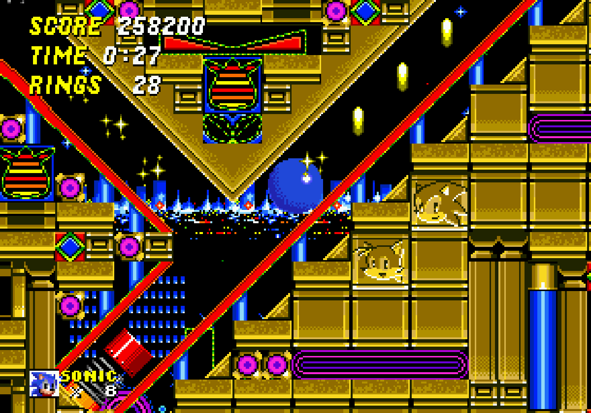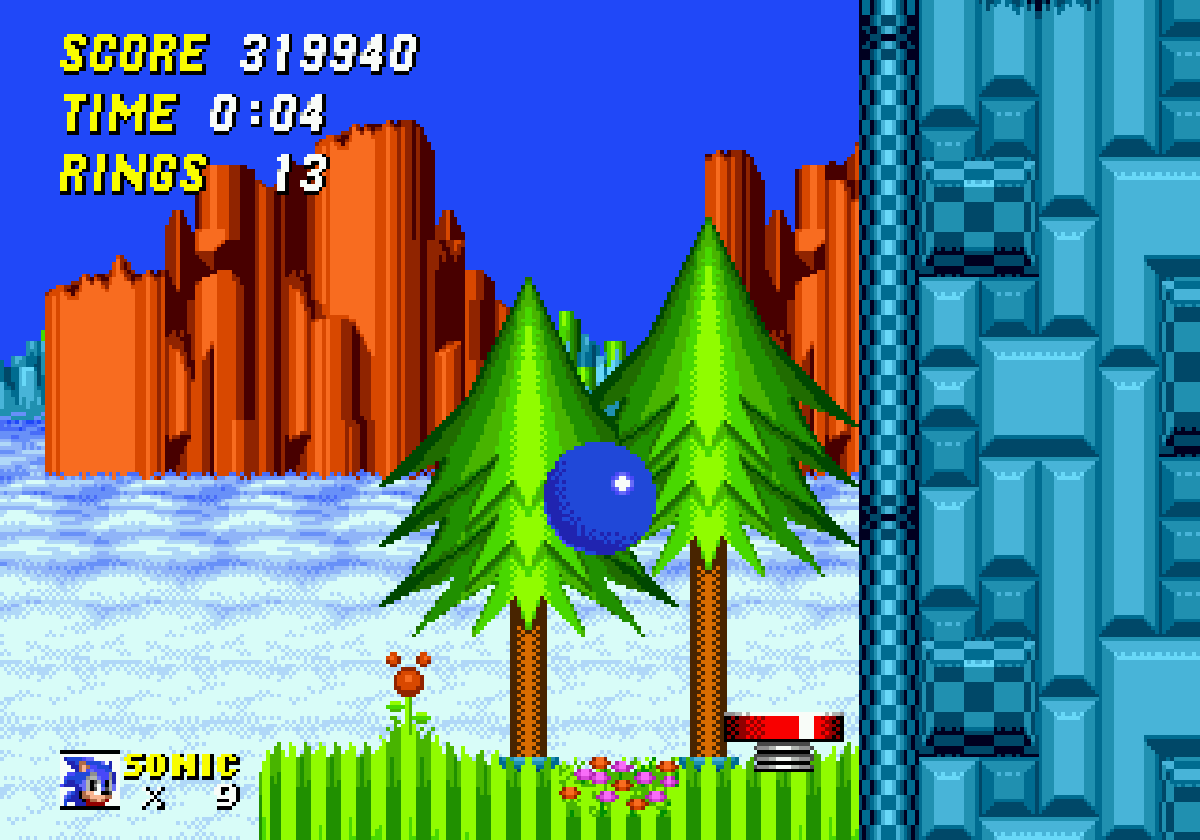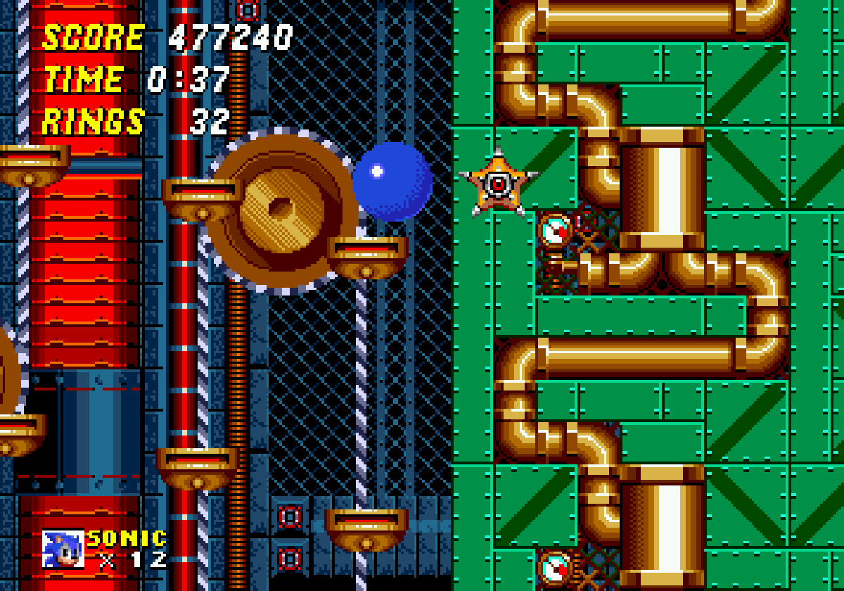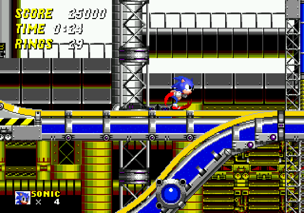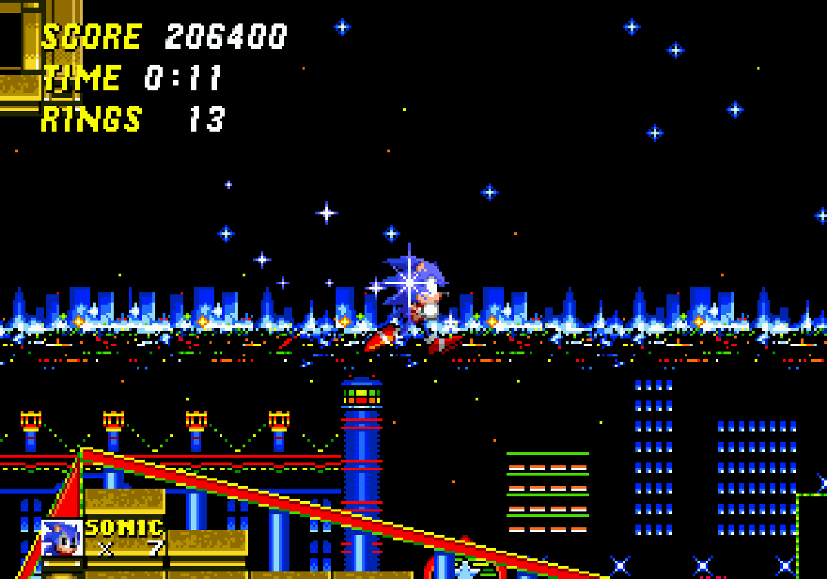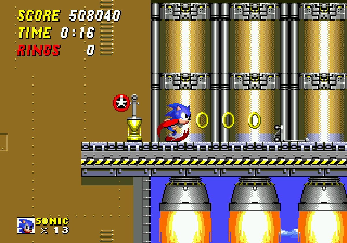 Pour en venir à parler des 3 grosses nouveautés de cet épisode, Sonic possède un nouveau mouvement dont on servira tout le temps : le spin-dash. En maintenant "bas" puis "saut", Sonic se met en boule et tournoie sur lui-même pour s'élancer lorsqu'on lâche le bouton. Ça évite de reculer sans cesse pour prendre de l'élan. Cet ajout est majeur pour la série (même s'il n'y parait pas de prime abord) et c'est sans doute le seul petit truc qui manquait au premier opus. Ensuite il faut savoir que les continues ne se gagnent plus dans les bonus-stages mais en finissant les niveaux avec plus de 100 rings. Pour accéder aux bonus-stages, il faut désormais passer les barres de checkpoints avec plus de 50 rings sur soi et entrer dans le cercle d'étoiles qui s'y forme. Seul problème, lorsqu'on entre dans ces zones, on en ressort à sec, plus un ring en poche et si vous aviez une bulle de protection, elle sera perdue.