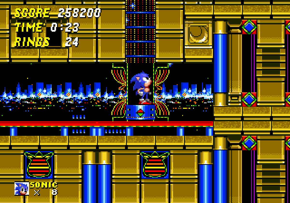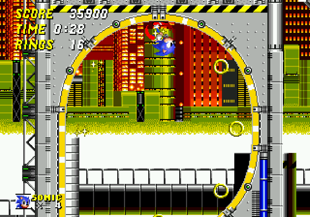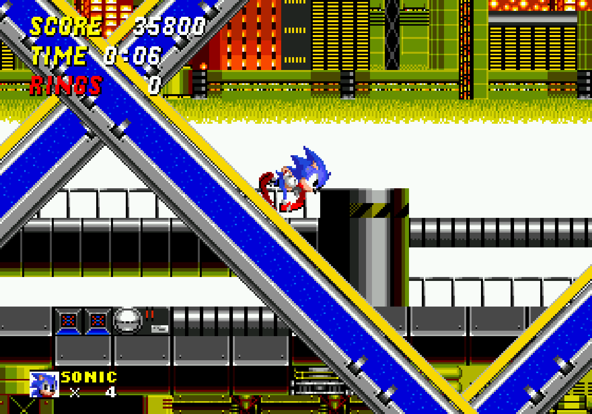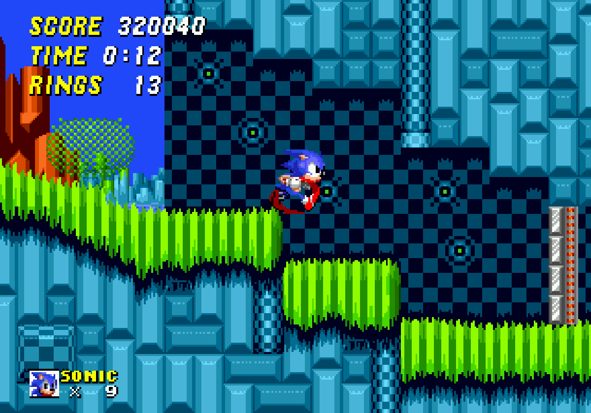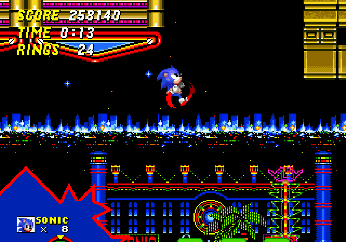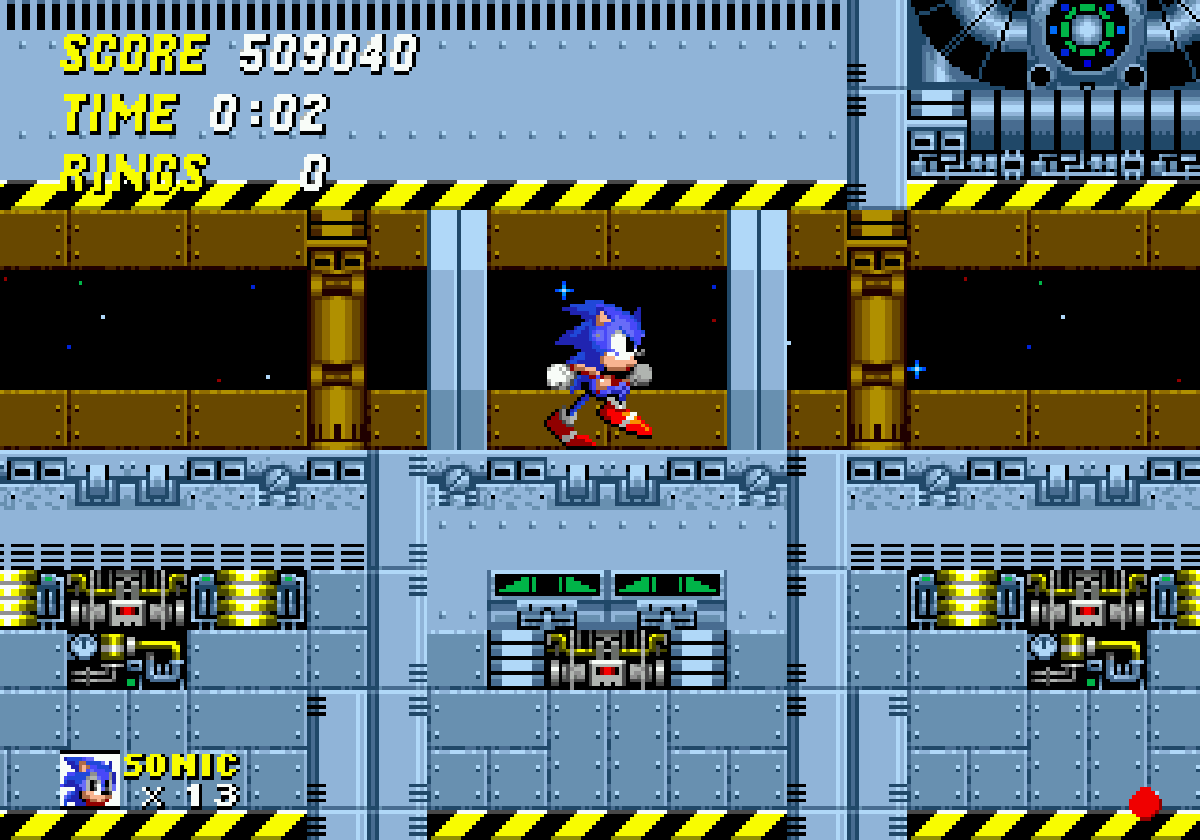 Pour en venir à parler des 3 grosses nouveautés de cet épisode, Sonic possède un nouveau mouvement dont on servira tout le temps : le spin-dash. En maintenant "bas" puis "saut", Sonic se met en boule et tournoie sur lui-même pour s'élancer lorsqu'on lâche le bouton. Ça évite de reculer sans cesse pour prendre de l'élan. Cet ajout est majeur pour la série (même s'il n'y parait pas de prime abord) et c'est sans doute le seul petit truc qui manquait au premier opus. Ensuite il faut savoir que les continues ne se gagnent plus dans les bonus-stages mais en finissant les niveaux avec plus de 100 rings. Pour accéder aux bonus-stages, il faut désormais passer les barres de checkpoints avec plus de 50 rings sur soi et entrer dans le cercle d'étoiles qui s'y forme. Seul problème, lorsqu'on entre dans ces zones, on en ressort à sec, plus un ring en poche et si vous aviez une bulle de protection, elle sera perdue.