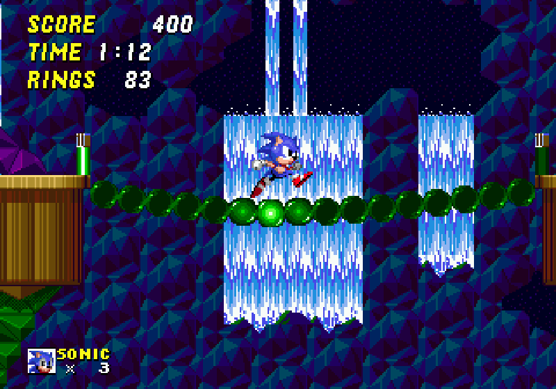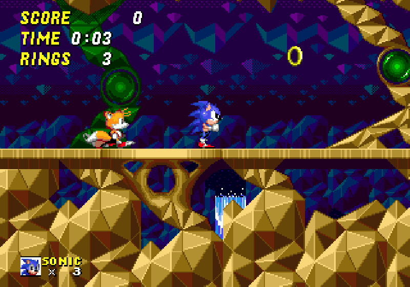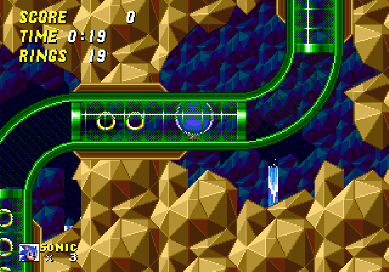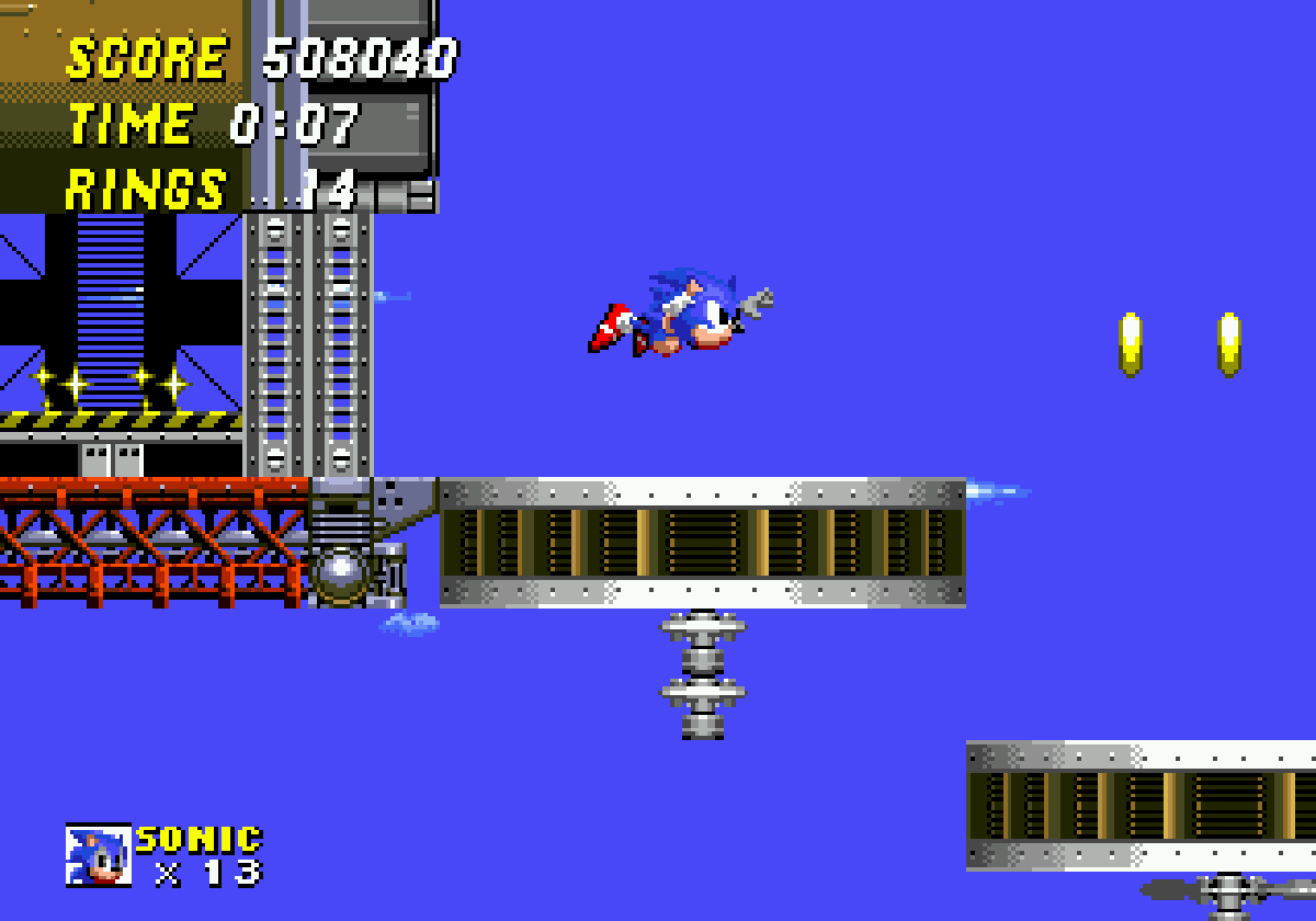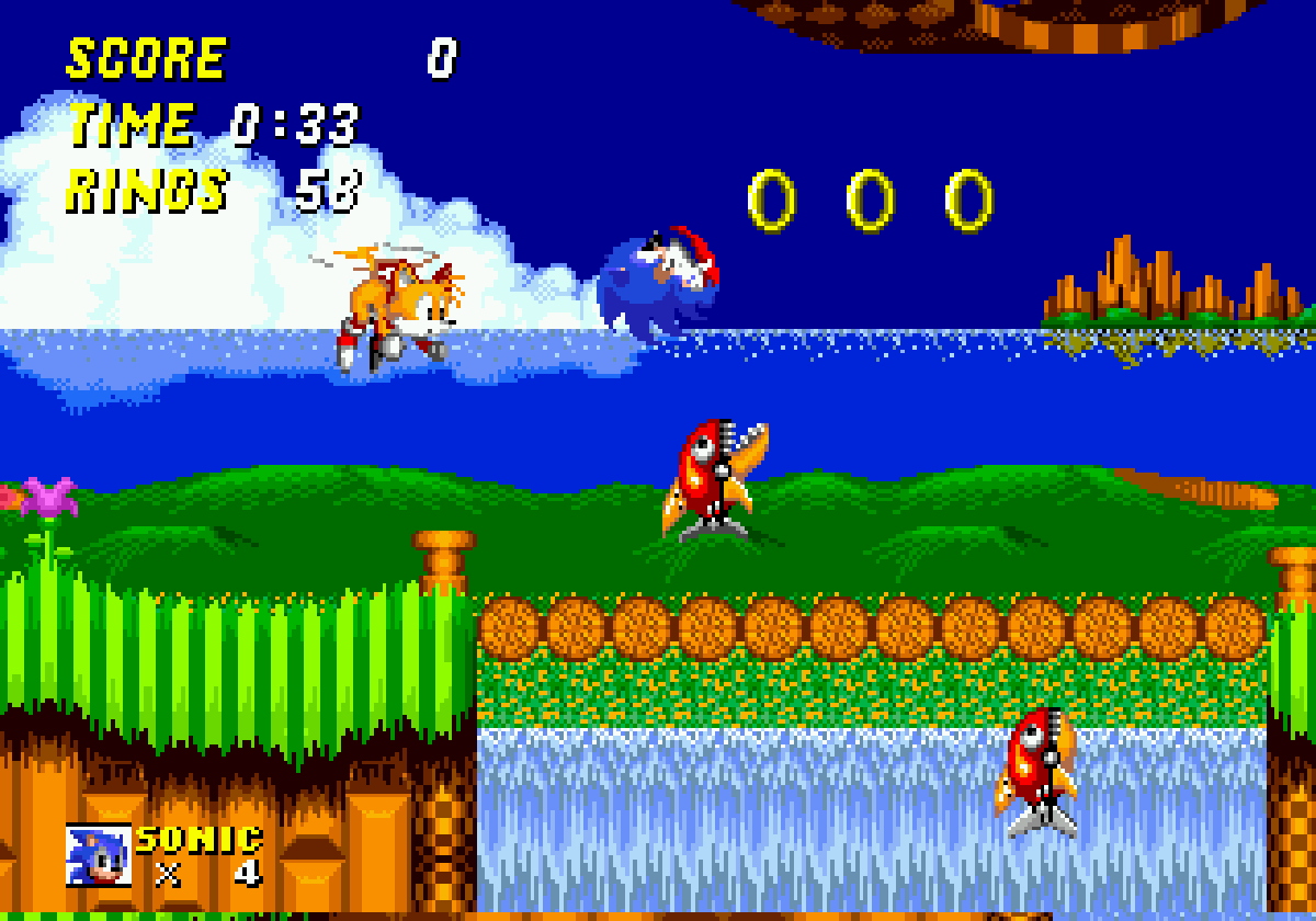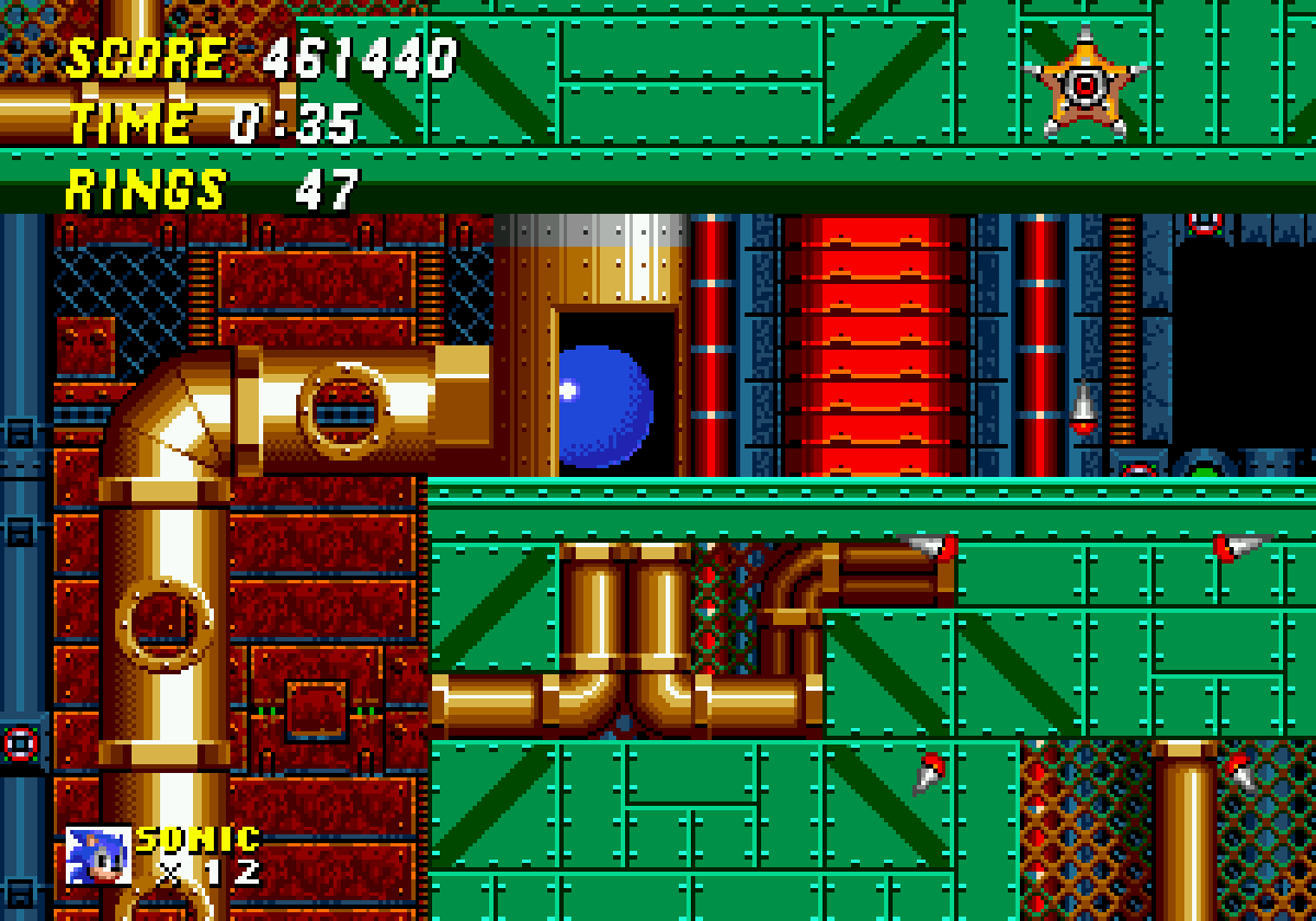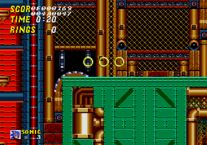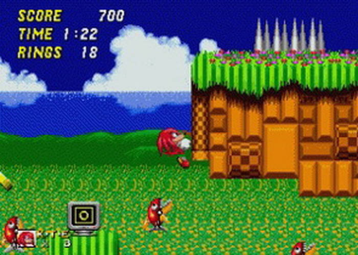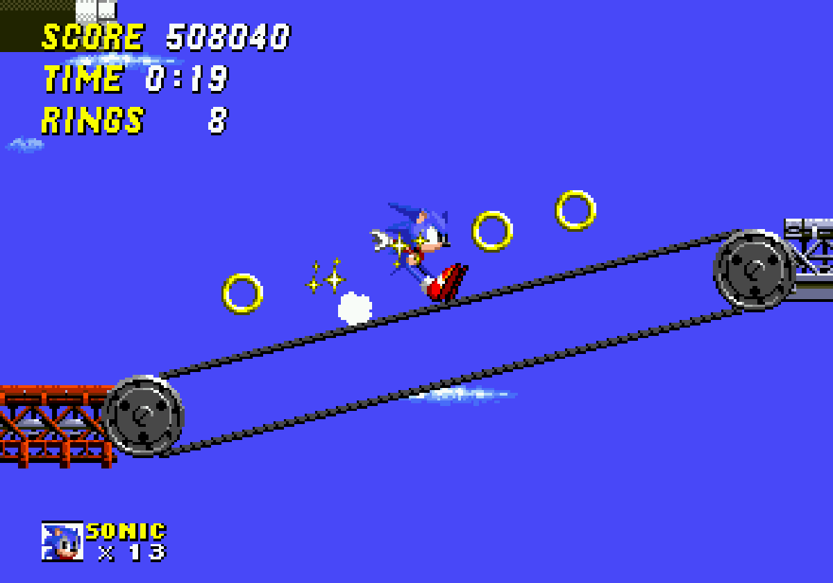 Pour en venir à parler des 3 grosses nouveautés de cet épisode, Sonic possède un nouveau mouvement dont on servira tout le temps : le spin-dash. En maintenant "bas" puis "saut", Sonic se met en boule et tournoie sur lui-même pour s'élancer lorsqu'on lâche le bouton. Ça évite de reculer sans cesse pour prendre de l'élan. Cet ajout est majeur pour la série (même s'il n'y parait pas de prime abord) et c'est sans doute le seul petit truc qui manquait au premier opus. Ensuite il faut savoir que les continues ne se gagnent plus dans les bonus-stages mais en finissant les niveaux avec plus de 100 rings. Pour accéder aux bonus-stages, il faut désormais passer les barres de checkpoints avec plus de 50 rings sur soi et entrer dans le cercle d'étoiles qui s'y forme. Seul problème, lorsqu'on entre dans ces zones, on en ressort à sec, plus un ring en poche et si vous aviez une bulle de protection, elle sera perdue.