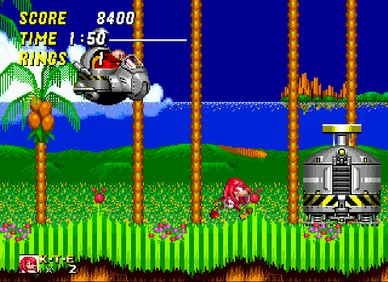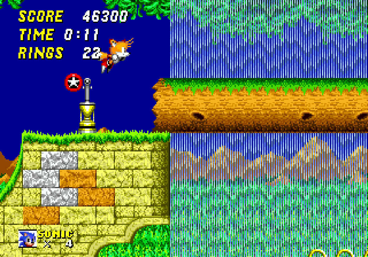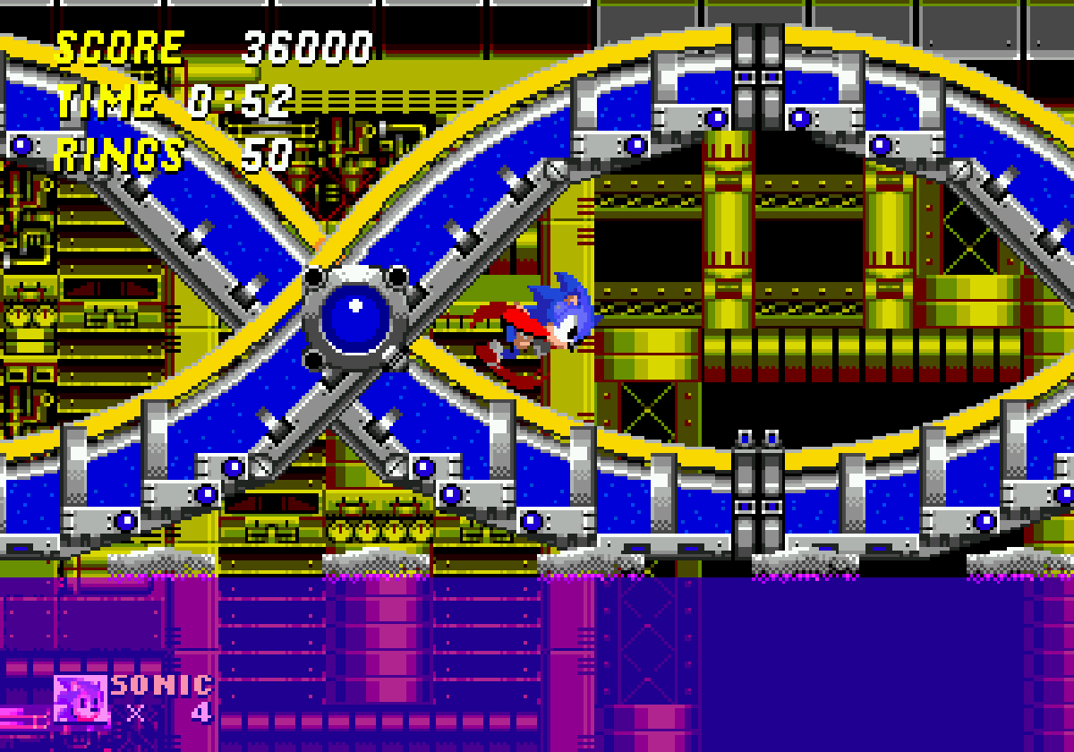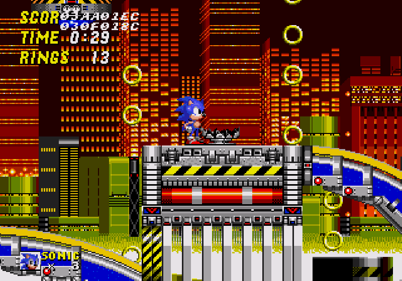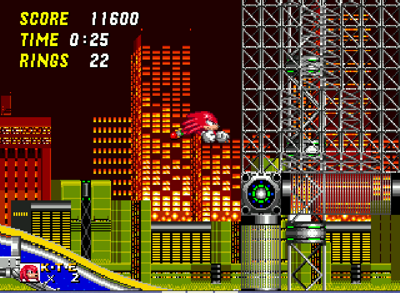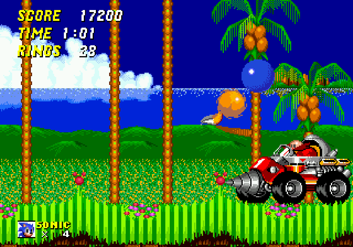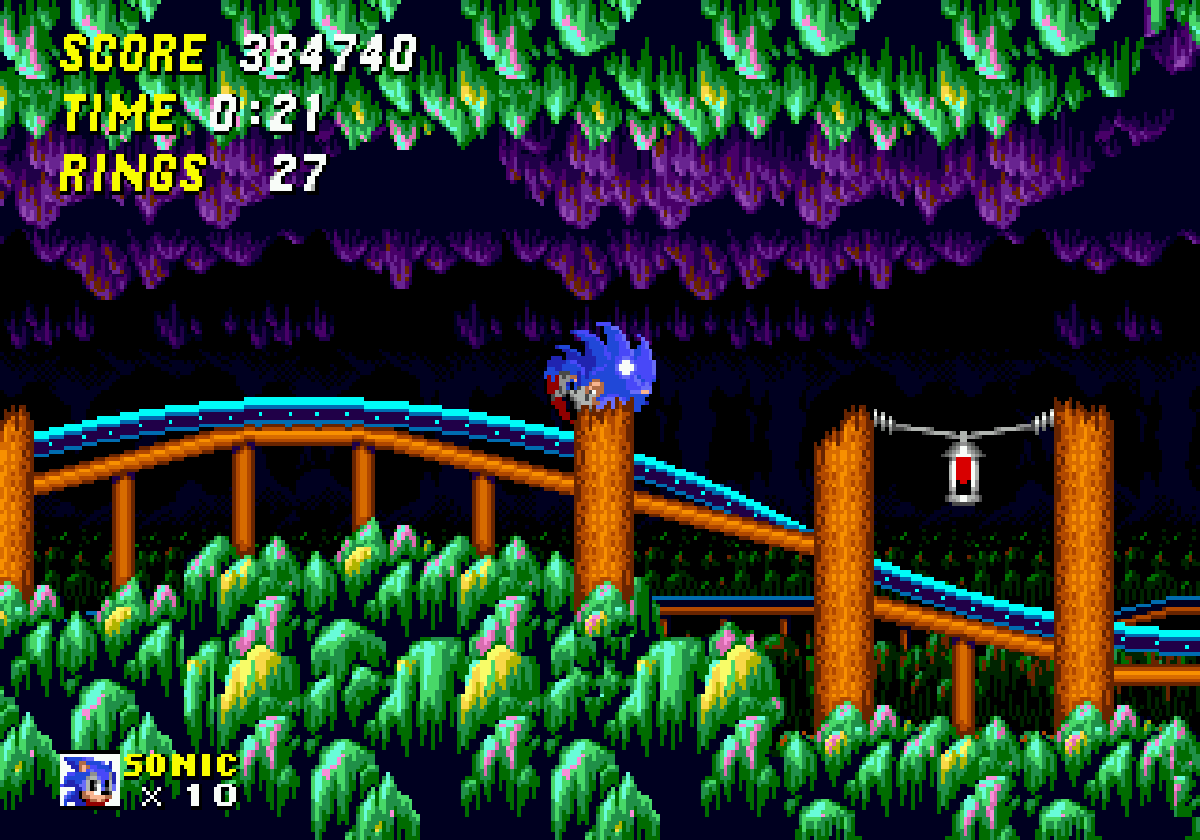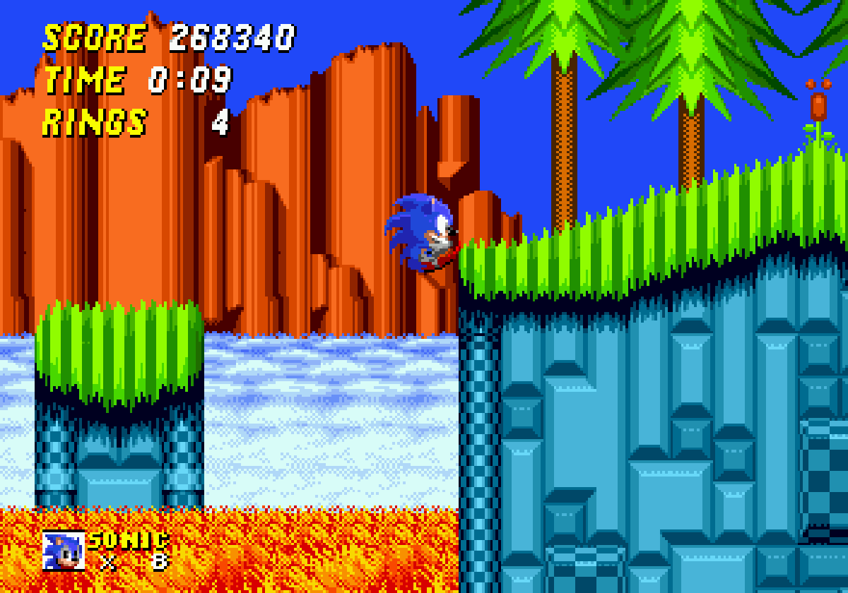 Pour en venir à parler des 3 grosses nouveautés de cet épisode, Sonic possède un nouveau mouvement dont on servira tout le temps : le spin-dash. En maintenant "bas" puis "saut", Sonic se met en boule et tournoie sur lui-même pour s'élancer lorsqu'on lâche le bouton. Ça évite de reculer sans cesse pour prendre de l'élan. Cet ajout est majeur pour la série (même s'il n'y parait pas de prime abord) et c'est sans doute le seul petit truc qui manquait au premier opus. Ensuite il faut savoir que les continues ne se gagnent plus dans les bonus-stages mais en finissant les niveaux avec plus de 100 rings. Pour accéder aux bonus-stages, il faut désormais passer les barres de checkpoints avec plus de 50 rings sur soi et entrer dans le cercle d'étoiles qui s'y forme. Seul problème, lorsqu'on entre dans ces zones, on en ressort à sec, plus un ring en poche et si vous aviez une bulle de protection, elle sera perdue.