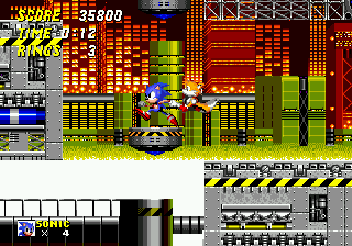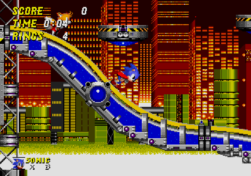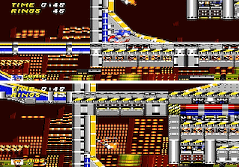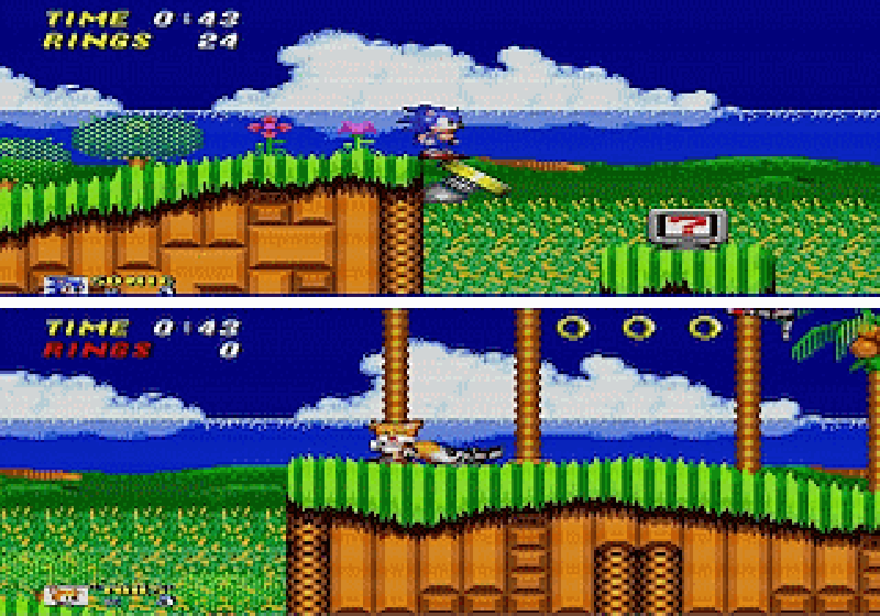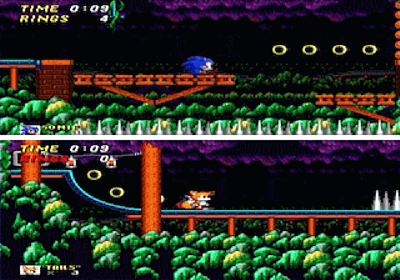 Alors qu'on pensait que cette suite proposerait plus d'intéractions directes avec le décor, c'est au final tout le contraire... que Sonic 2 ne change pas radicalement la donne par rapport au premier opus, il y a des originalités d'un côté et la totale absence de nouvelle télé de l'autre. Ne cherchez donc pas de nouveaux items, seul le design de l'invincibilité et de la bulle de protection a changé. Cependant Sonic 2 fait évoluer son gameplay et intègre au sein de son équipe Tails, le mignon petit renard. En solo on peut choisir de jouer seul, soit avec Sonic soit avec Tails, ou alors de jouer avec Sonic et Tails qui nous suit (un choix qu'on peut faire via le menu des options où on accède aussi à un agréable et utile Sound Test). L'avantage d'avoir Tails aux fesses c'est que bien souvent il se calque sur nos faits et gestes, ce qui peut être pratique pour les boss (on le touche 2 fois plus), Tails ramassant aussi les rings pour notre compte. L'autre avantage de jouer avec lui, c'est que de façon officieuse, le joueur 2 peut prendre le contrôle du renard. Ainsi on peut jouer en co-op' ce qui est agréable même si c'est Sonic qui reste le maître de scène. Dernière nouveauté qu'apporte Tails : un vrai mode 2 joueurs, en écran splitté sur des levels issus de l'aventure principale, où on pourra enfin se tirer la bourre en duo. Sympa même si le mode est assez illisible et finalement assez anecdotique.