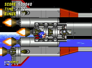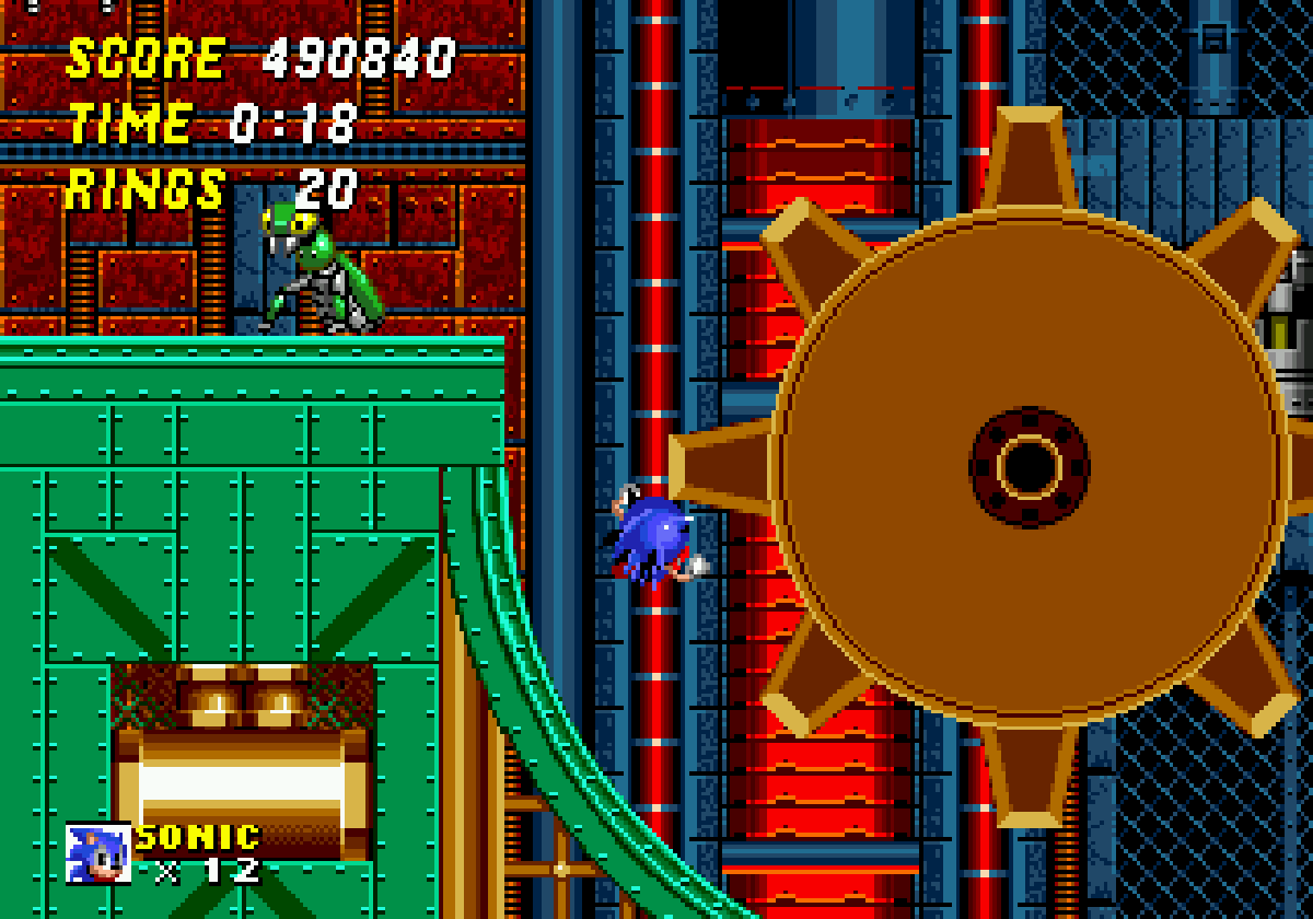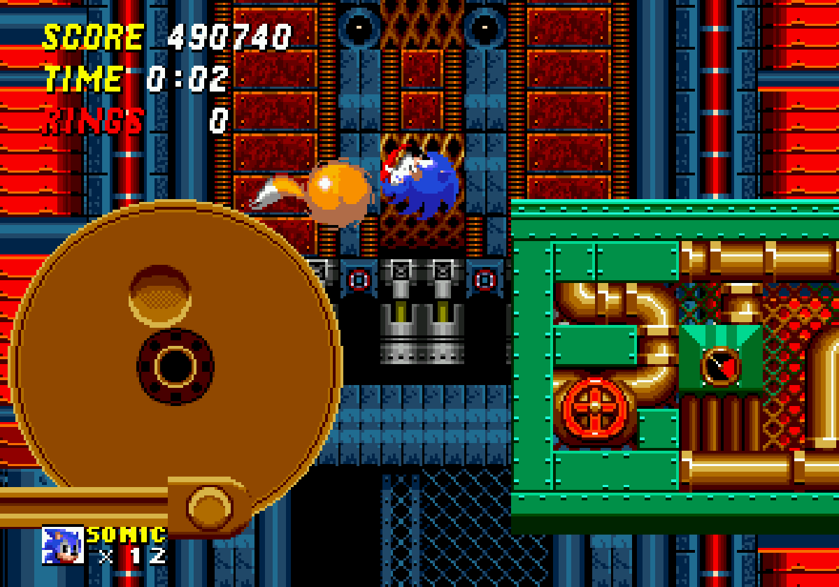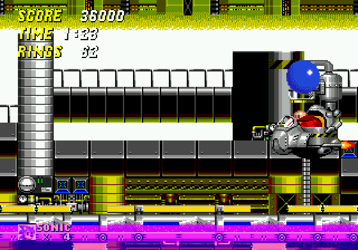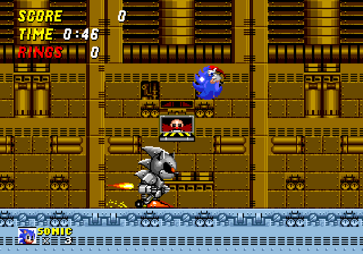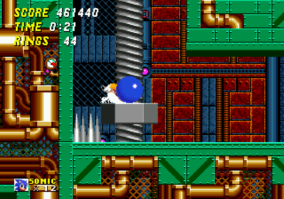 Le spin-dash : on presse "bas", puis on appuie sur une touche pour que Sonic puisse s'élancer. Une nouveauté tellement pratique qu'elle servira tout le temps ! difficulté, beaucoup pensent qu'elle s'est accrue, mais de mon point de vue, j'estime que c'est l'inverse. En réalité, la difficulté est cette fois plus croissante et si vous trouvez que Metropolis est vraiment difficile comme niveau, je vous conseille de refaire les niveaux aquatiques ou la Scrap Brain Zone du premier Sonic pour vous faire une véritable idée duquel des 2 est le plus dur. Après j'avoue, si la première moitié de l'aventure est assez facile, une fois passée, il sera rare de finir un niveau avec plus d'une poignée de rings en poche. Le point culminant étant le boss final qu'on doit affronter sans rien en poche ! C'est un peu sadique, totalement inéquitable et donc la mort nous guette au moindre faux pas. Autant dire qu'avant d'attaquer, il faut impérativement apprendre le moindre de ses gestes d'autant qu'avant d'y re-accéder, on doit re-combattre Mecha Sonic.
