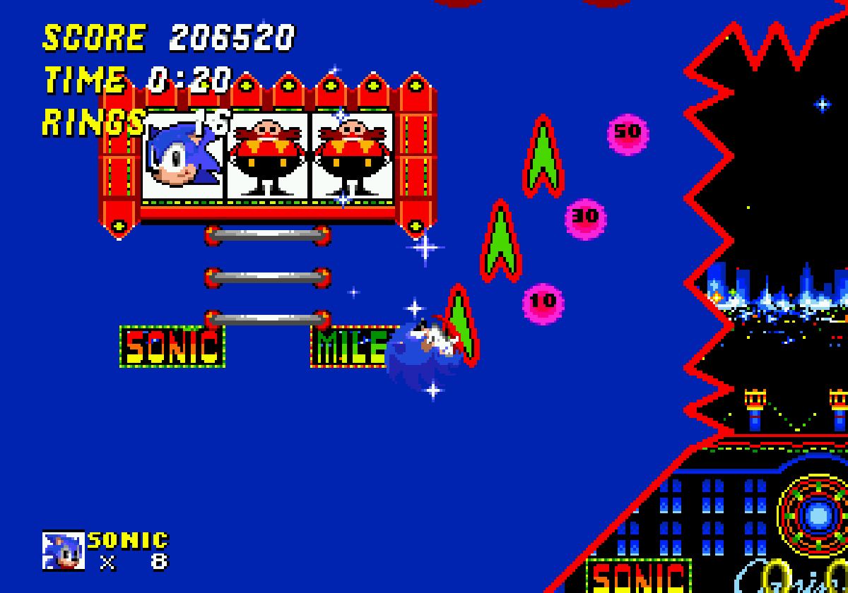 On retrouve ensuite quelques améliorations du gameplay comme les accélérateurs, des bumpers muraux, de nouveaux ascenseurs, des canons ou encore un casino où il possible de gagner beaucoup de rings... comme de tout perdre. Il n'y a d'ailleurs plus vraiment de level aquatique mais quelques passages immergés de temps en temps. Faut dire que dans le premier Sonic, ces niveaux étaient assez difficiles et comme ici ce ne sont que des passages, on de trop se prendre la tête.