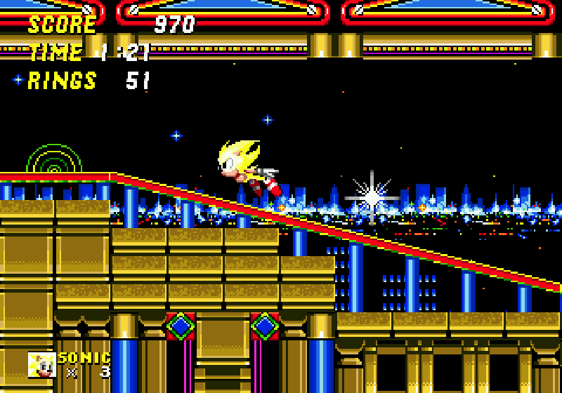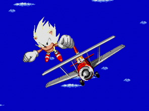 Pourtant il serait dommage de passer à côté de la trouvaille de SEGA, car si vous trouvez les 7 émeuraudes (bon courage !), à la façon de Songoku, Sonic peut se transformer en Super Sonic : il devient flamboyant, il ne court plus mais vole hyper vite et il est invincible. En fait il suffit d'attraper au moins 50 rings et de sauter pour qu'il se transforme (ça marche aussi avec Tails mais c'est moins classe). En contrepartie, vos rings diminuent jusqu'à zéro et c'est alors le retour à l'état normal, mais quel pied ! Un grand moment de fun où le seul défaut sera d'avoir une musique d'accompagnement chiante et répétitive. Il est également dommage que l'activation de Super Sonic se fasse automatiquement, notamment parce qu'il est tellement rapide, que la prise en mains devient forcément moins précise. Le must aurait été d'avoir l'activation/désactivation de ce fameux pouvoir en pressant une touche (genre la touche C) et ainsi on aurait gardé notre Sonic en mode Super Saiyan pour les passages difficiles ou les boss. L'idée est sympa, mais un peu mal employée à mon goût.