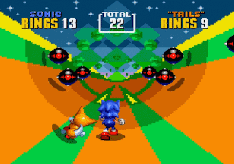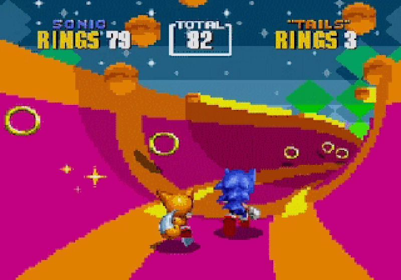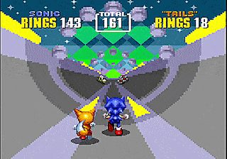 Sonic 2 est dans le Top 5 des plus beaux Mega Drive ! Rien que ça :) les bonus-stages ont complètement changés. Fini le décor tout en rotation, place à une pseudo-3D où Sonic et Tails courent à travers une sorte de couloir. Dans ce tube géant à demi-fermé on peut sauter, courir sur les côtés ou même faire un tour complet. Bonus-stage oblige, pour être dans l'axe de la première version, le scrolling défile tout seul et le but est de ramasser un maximum des anneaux qui passent à notre portée. Si vous en avez assez, vous passez les checkpoints jusqu'à l'émeraude. Cette fois il y a 7 émeraudes à dénicher et excusez-moi du peu, c'est presque impossible à faire, car ces bonus-stages sont d'une difficulté effroyable ! Dès le 4e bonus-stage, c'est presque impossible de choper le précieux cailloux.