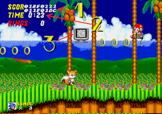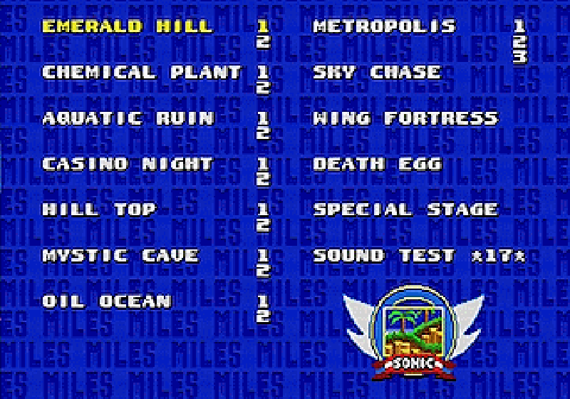 Comme dans le premier Sonic, les développeurs ont prévus quelques bons plans pour se défaire de la difficulté et de la longueur du titre. Car une fois encore, le jeu ne dispose ni de sauvegarde, ni de passwords, tout en étant long et assez difficile (surtout sur les derniers niveaux), SEGA a donc à nouveau implanté un menu spécial. A l’écran titre, entrez dans le menu des options (image 1), car oui, il y a désormais un joli menu d'options. On peut y choisir de jouer Sonic, Tails ou les 2 en même temps. Notez que Tails n'a pas encore le pouvoir de voler (il n'a donc aucune plus-value sur Sonic) par contre jouer seul évite certains ralentissements (mais le jeu est un poil plus dur, car mine de rien, Tails peut être une bonne aide contre les boss). Bref, ici placez-vous sur le Sound Test et écoutez les pistes suivantes : 19, 65, 9, 17 (17/09/1965 étant la date de naissance de Yuji Naka, au format américain). Appuyez sur Start pour retourner à l’écran-titre, et ensuite, comme autrefois faites A + Start pour ouvrir un nouveau menu. Vous voilà sur le superbe écran du "Select Stage" (image 2) ! Pas besoin de vous faire un dessin, grâce à lui vous pourrez visiter tous les niveaux, voire même vous rendre directement au boss final.