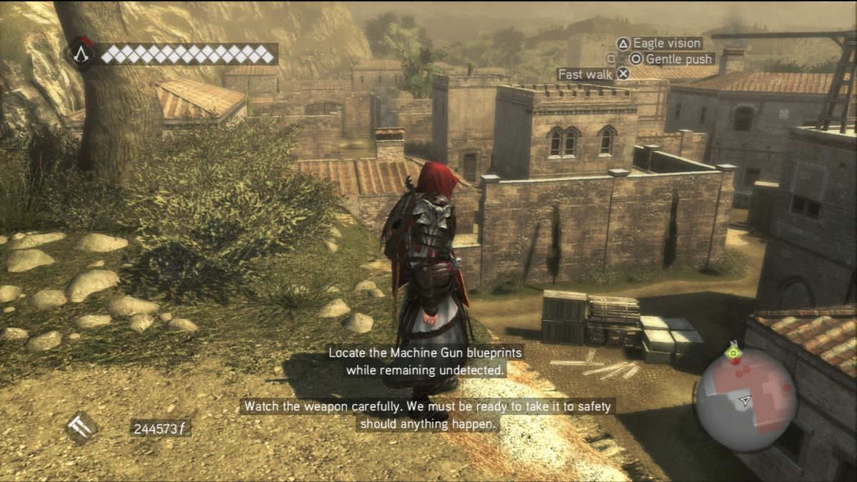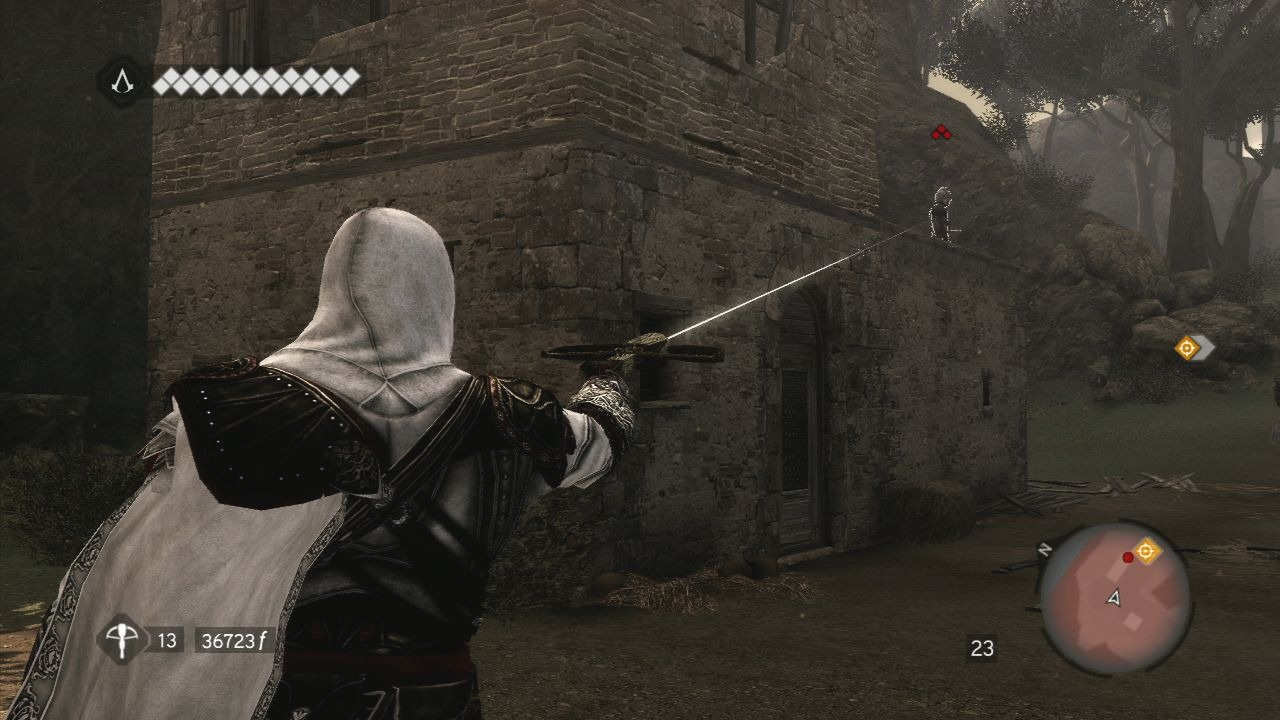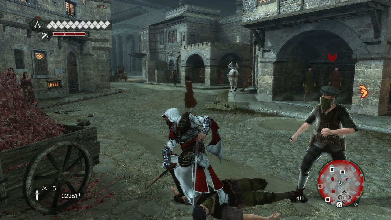 Et si le système de combats n'est toujours pas des plus simple à appréhender, au moins il a le bon goût d'être de plus en plus permissif et de ne plus nous imposer ces combats tactiques. Jouer bourrin se révèle désormais payant (d'autant que les coups de pied aident à faire baisser la garde d'un ennemi), même si encore une fois, le jeu n'est pas spécialement fait pour ça. D'ailleurs Ezio devient une vraie machine de guerre avec ses lames secrètes, son épée, ses couteaux, son arme à feu ou encore l'arbalète, qui rendra bien des services en tuant en un coup et d'assez loin, la plupart des ennemis.