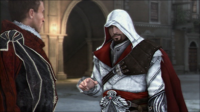 On retrouve donc à nouveau Ezio Auditore da Firenze, dans une suite directe à l'épisode 2 (d'ailleurs, nous avons un bon résumé qui nous remet dans le contexte historique). L'histoire reprend exactement au moment où Ezio apprend qu'une lourde tâche l'attend et que sa vie est liée à celle de Desmond. Bien con qu'il est, Ezio a laissé fuir Cesare Borgia à la fin d'Assassin's Creed II (sans doute pour justifier cette suite et mieux coller au contexte historique car personne de censé n'aurait fait ça... enfin moi je dis ça, je dis rien), et ce dernier ne tarde pas à contre-attaquer. Du coup, il sera à nouveau le grand ponte à abattre, ce qui fait franchement tâche. Et bien oui, pourquoi l'avoir laissé partir, après avoir tué des milliers de gardes et de têtes pensantes dans l'épisode 2 ? C'est crétin ! Sincérement je ne félicite pas le trio d'hurluberlus (les habituels Patrice Désilets, Corey May auxquels s'ajoute Jeffrey Yohalem) pour nous avoir pondu un twist aussi déplorable.