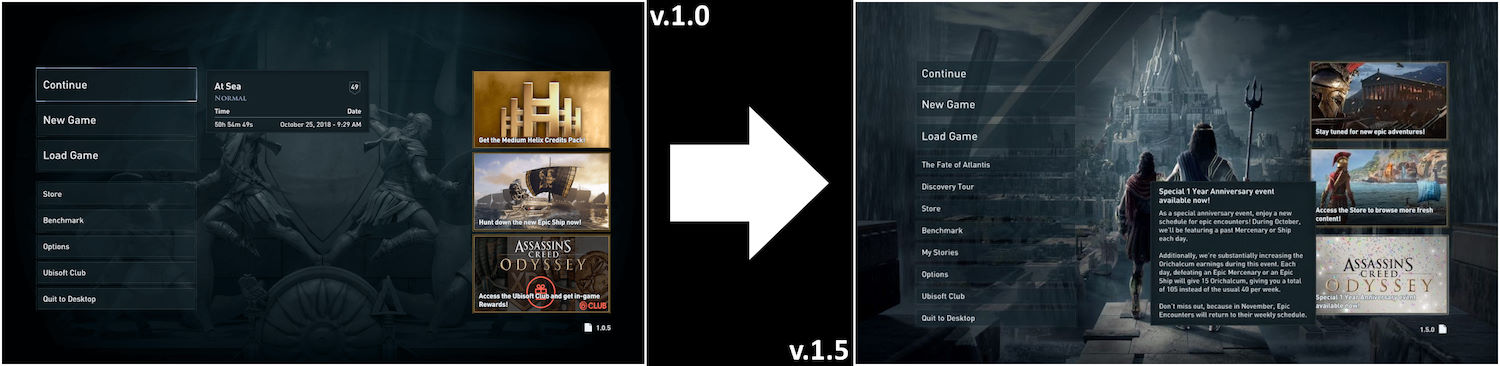2 mois plus tard, en décembre 2018, le jeu a reçu son premier véritable DLC narratif : L'Héritage de la Première Lame. Etrangement, ce DLC (comme le suivant) fut délivré en 3 épisodes séparés, un peu comme si Ubisoft créait son contenu au fur et mesure. Une idée franchement farfelue car beaucoup auraient sans doute préférer attendre un peu et tout avoir d'un coup, plutôt que de devoir patienter entre 2 mises en ligne de contenu (avec ce que ça sous-entend de téléchargements toujours plus volumineux). Le 2e DLC, Le Sort de l'Atlantide, a ensuite vu le jour entre avril et juin 2019 (encore une fois sous la forme de 3 épisodes) et il signait le terme des aventures du misthios, dans une mission nettement plus ambitieuse et longue que la précédente. Pour se rendre compte de cette première évidence, le premier DLC pèse moins de 6 Go quand le second pèse presque 25 Go ! Vous vous doutez que cette évidente différence y est pour quelque chose, et nous rentrerons dans les détails dans leur chapitre dédié.