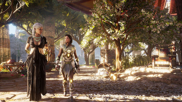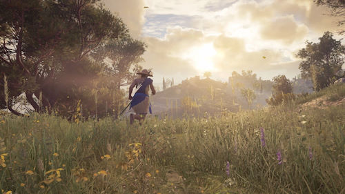 L'Elysée est le paradis selon la mythologie grecque, et je peux vous dire que cette zone totalement nouvelle, est super agréable à parcourir le scénario justifie timidement ce périple : notre Misthios, récent héritier du bâton d'Hermès, doit upgrader l'artéfact mais aussi apprendre à s'en servir. Des "épreuves" qu'Alètheia tente difficilement de justifier mais par chance, il y a un bon côté à tout ça. En effet, chaque chapitre se déroule dans un lieu différent et nous aurons donc 3 nouvelles maps en monde ouvert, où nous rencontrerons de nouveaux personnages. Une belle variété des situations donc, un réel dépaysement et non pas un certain goût pour la facilité, comme ce fut le cas avec le premier DLC qui recyclait à la fois les lieux, les personnages et même les missions du jeu de base. Ici on sent de suite qu'un énorme travail a été fait sur l'écriture et surtout sur le design, car l'Elysée est véritablement un lieu magnifique ! Tout en verdure, avec des fleurs partout, de grandes étendues d'eau et une ambiance décontractée, véritablement apaisante, le lieu est tout simplement merveilleux. Une zone de repos qui transpire bel et bien ses intentions premières.
